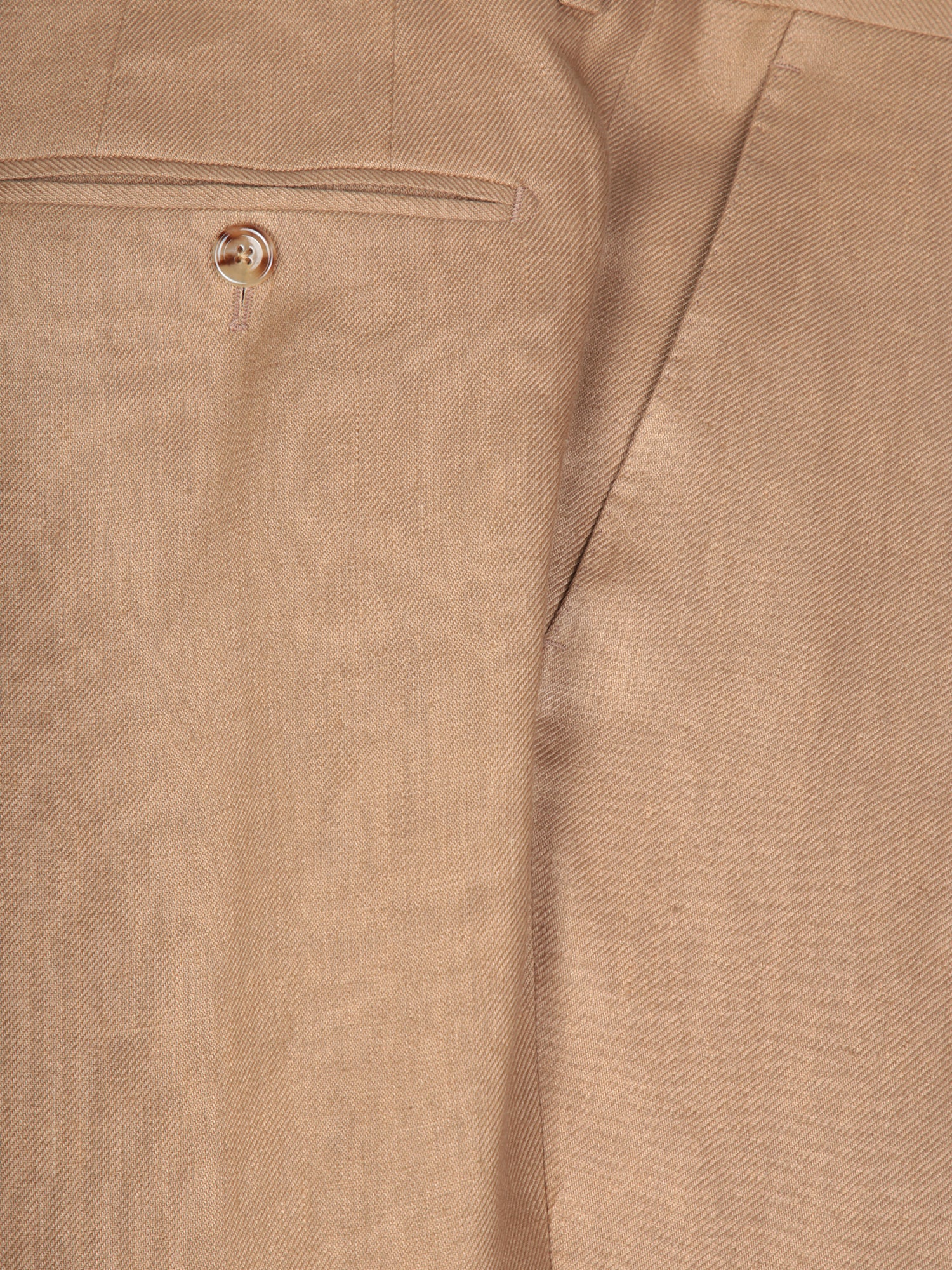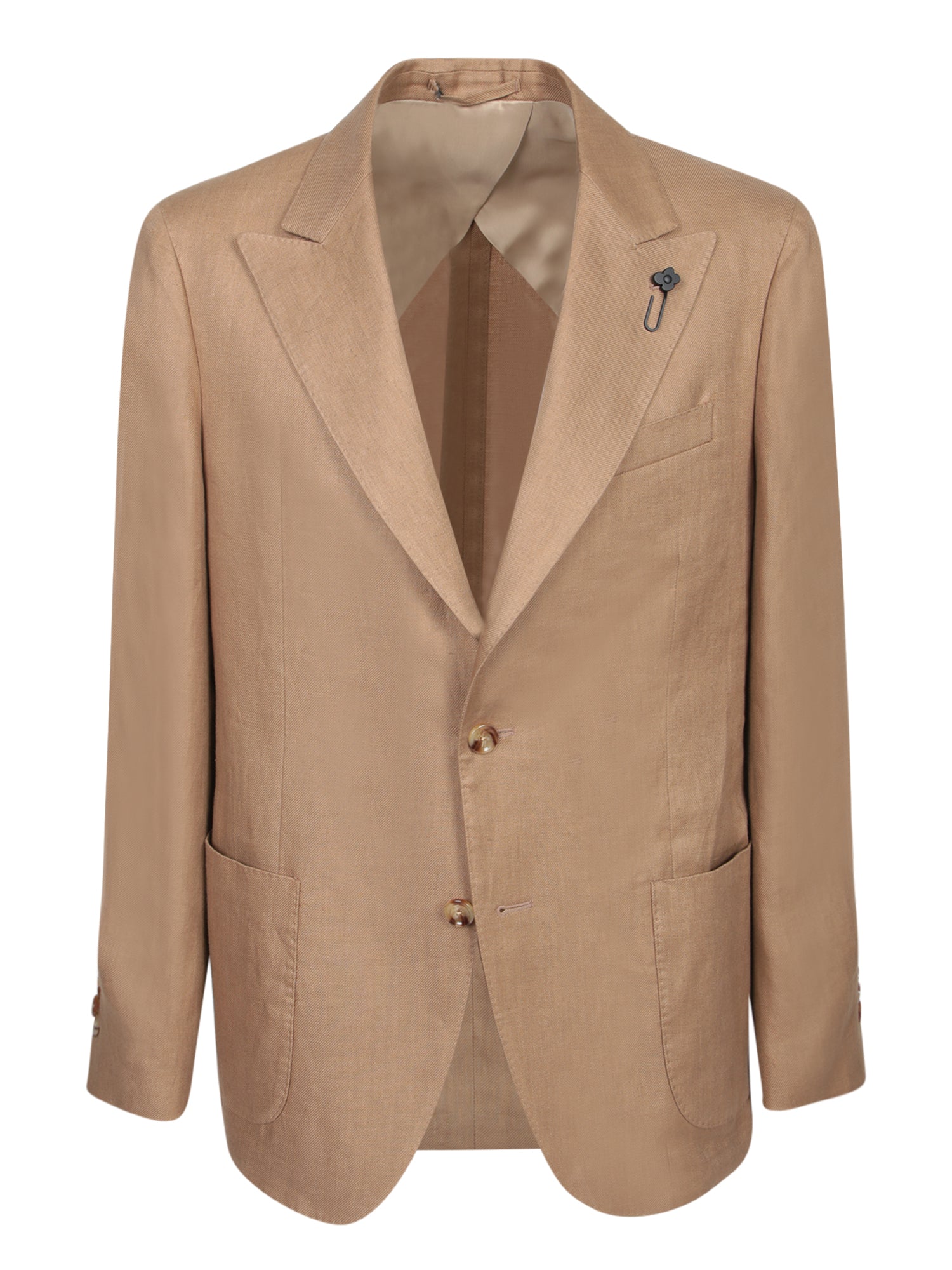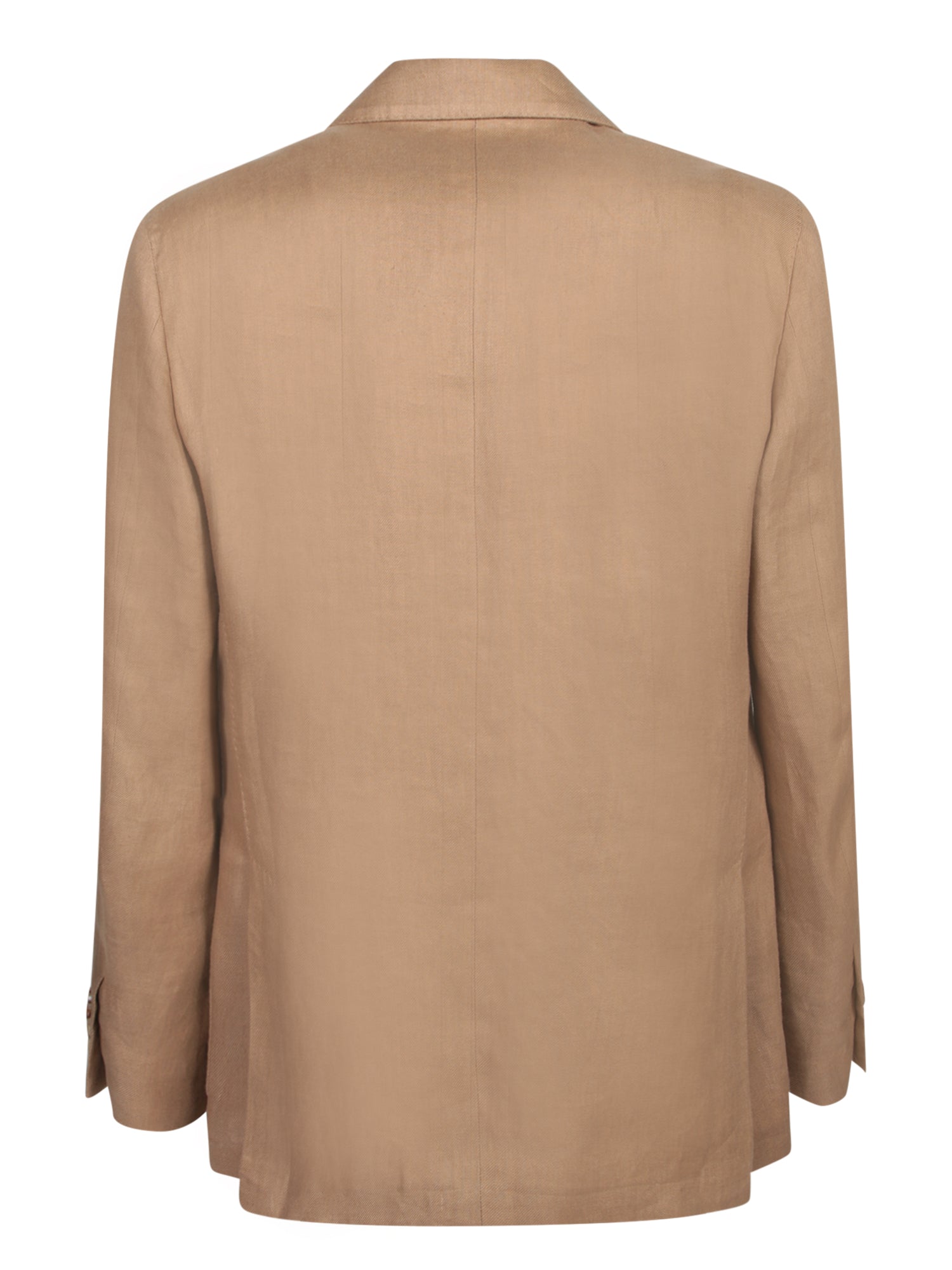 Single-breasted linen jacket with two-button closure, welt pockets, and a single back vent.