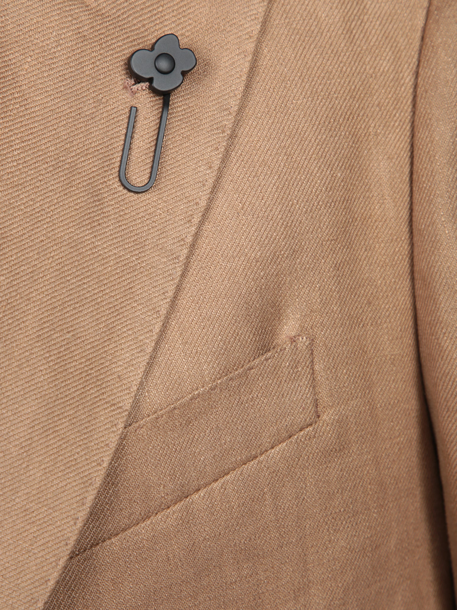 This Lardini suit embodies timeless elegance, featuring a classic cut enhanced by modern tailoring details such as the logo pin on the lapel and a distinctive linen texture.