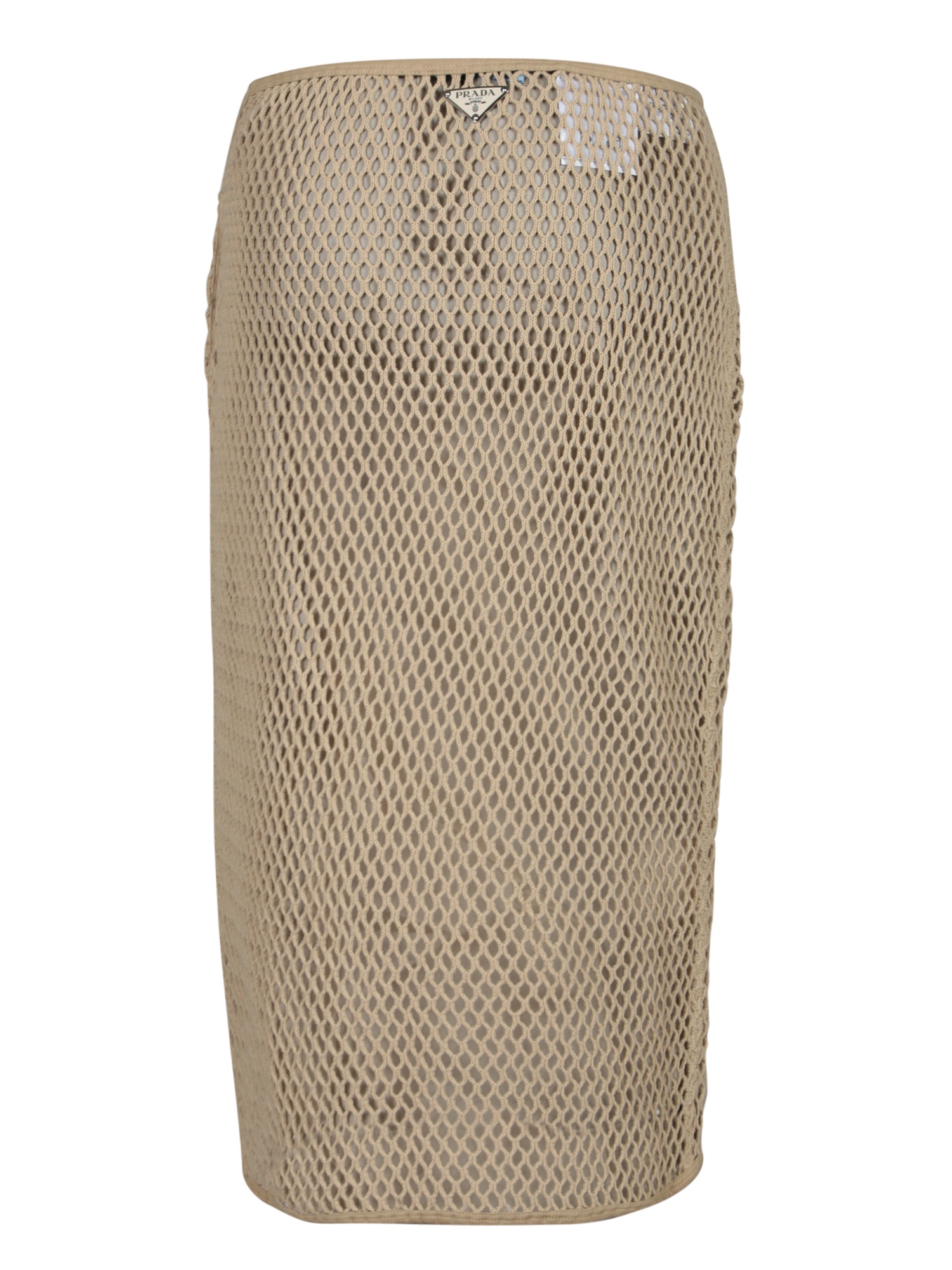 Tailored elegance meets modern design in this beige PRADA skirt, crafted from mesh knit. Perfect for adding a classy touch with a contemporary twist to your wardrobe.