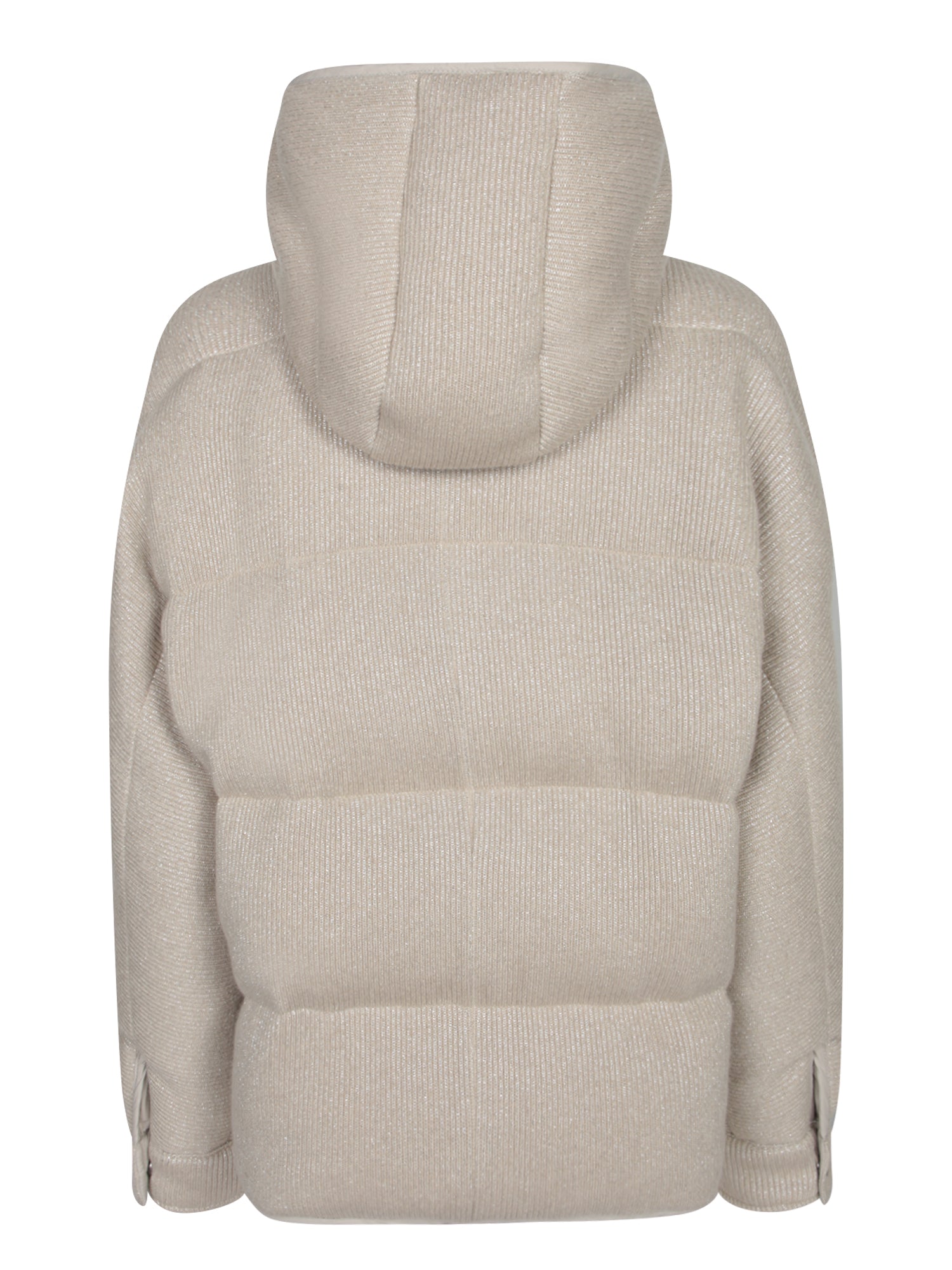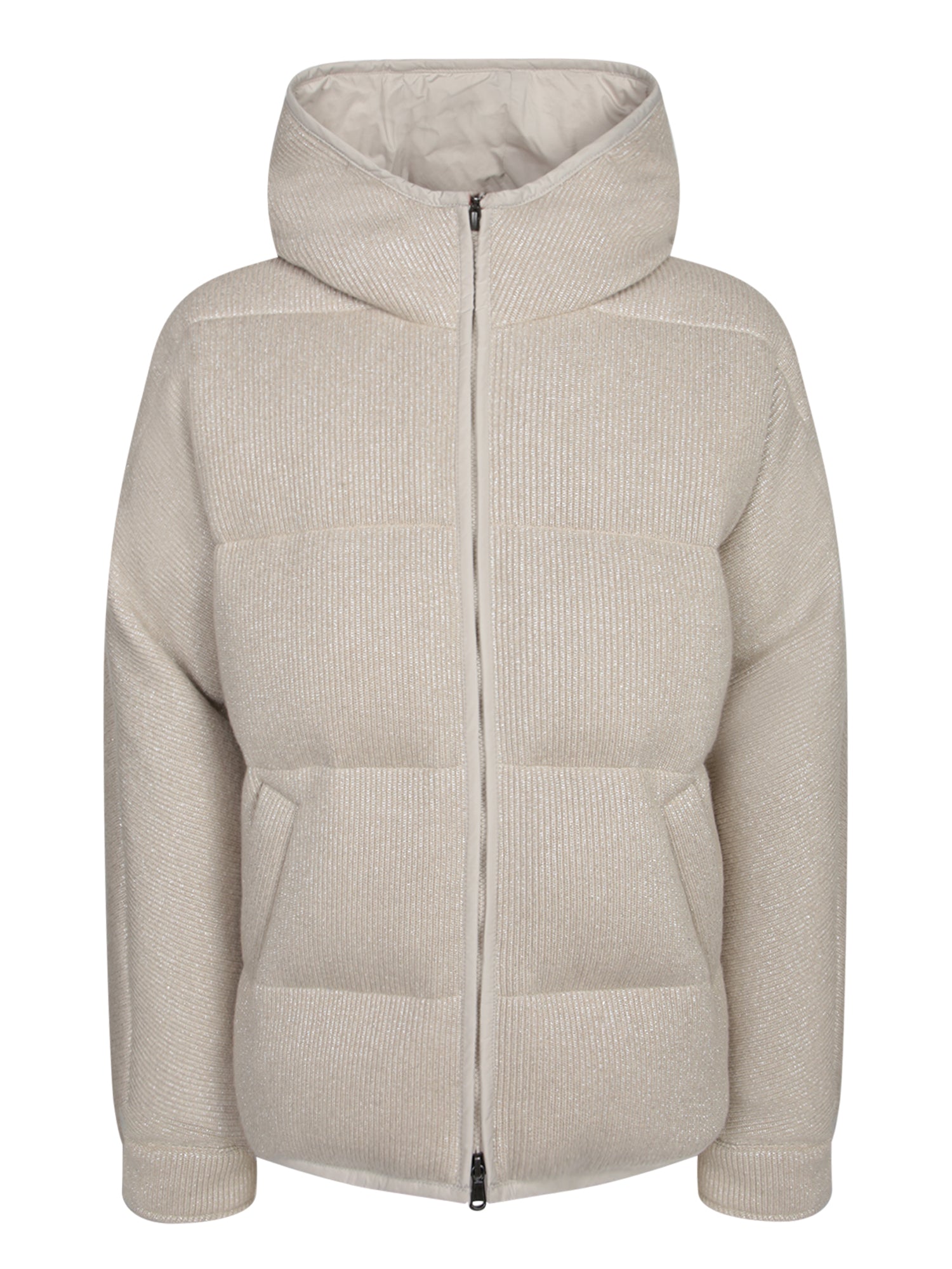 Padded jacket with hood, front zip closure, kangaroo pockets.