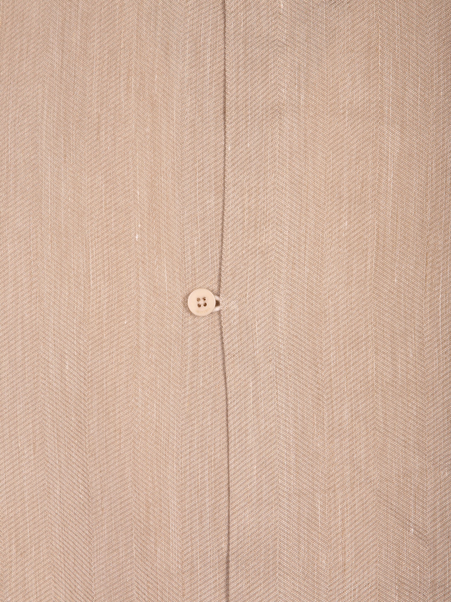 Lightweight beige fabric. Mandarin collar. Front button closure. Long sleeves.