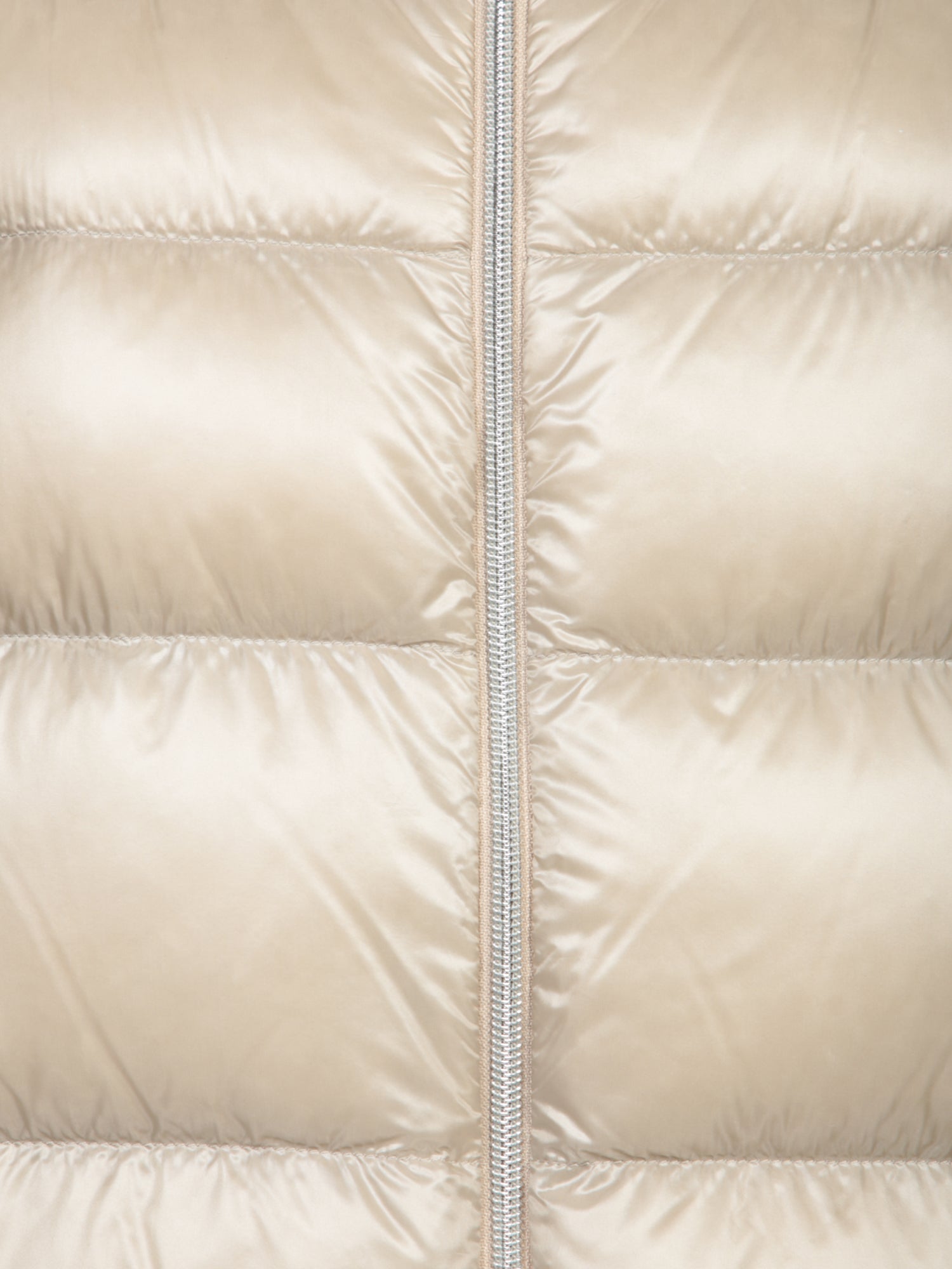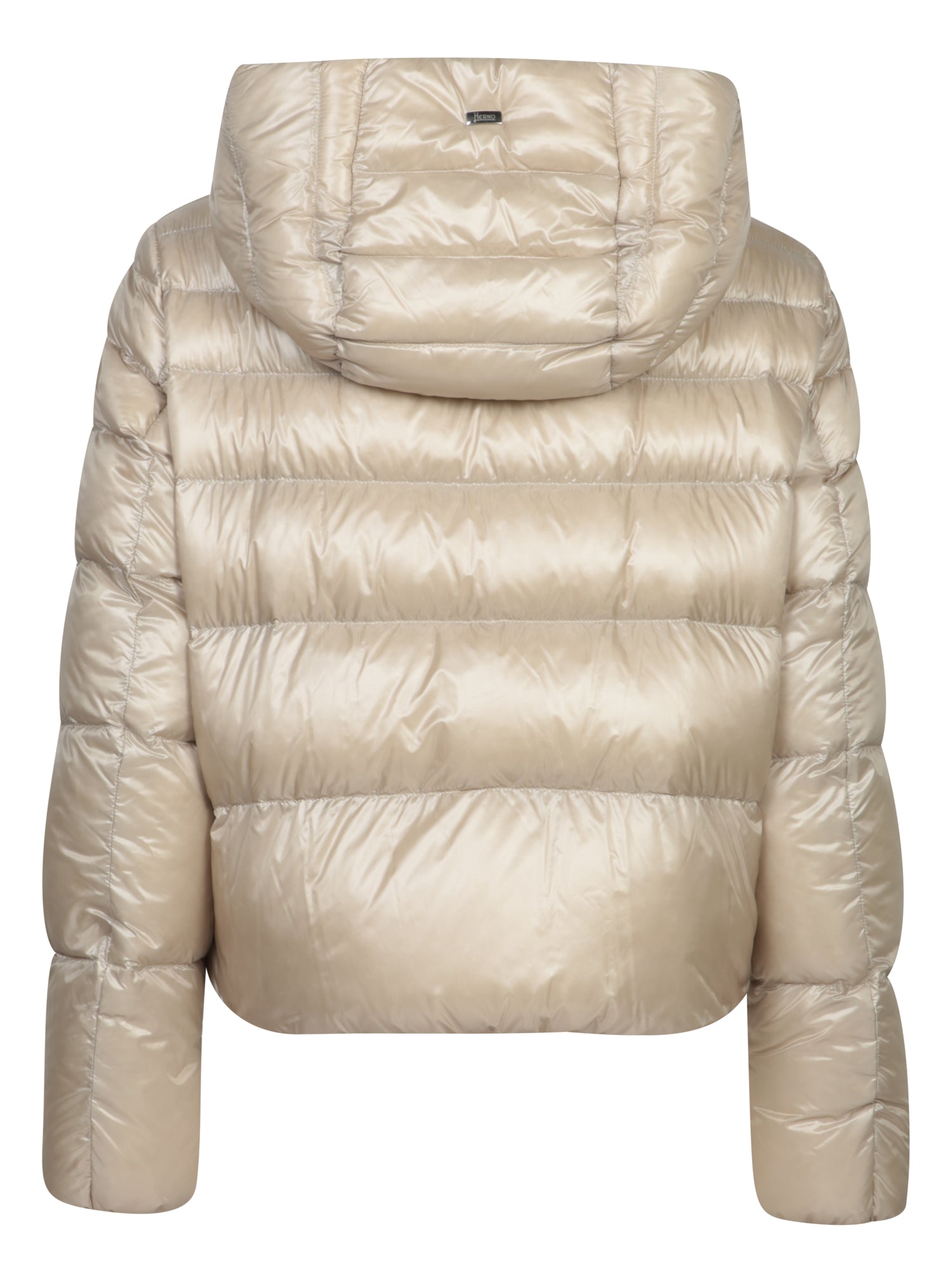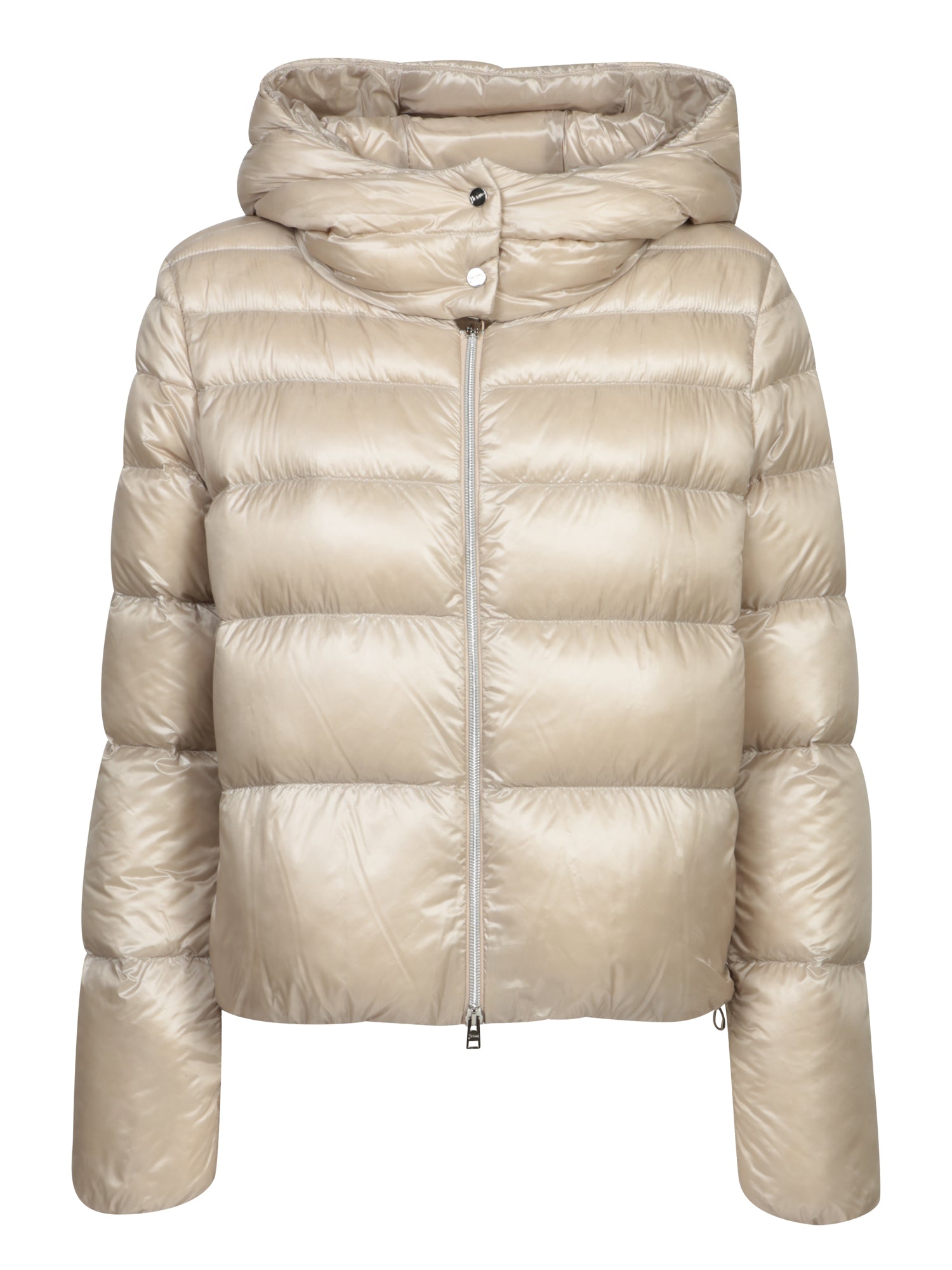 An iconic reinterpretation of the bomber jacket by Herno, this ultra-light beige nylon model features a generous hood and elasticized cuffs for a perfect, comfortable fit, ideal for an urban-chic look.