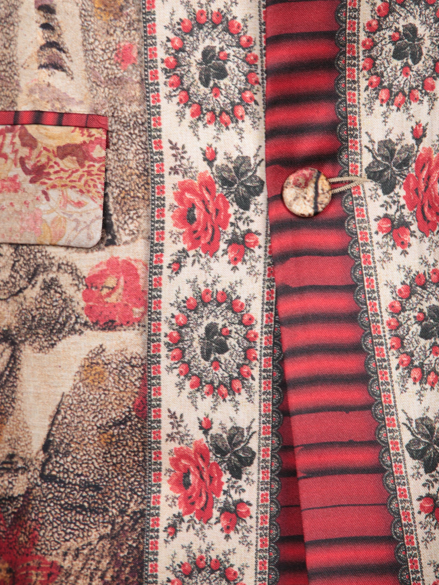 Eclectic patterned duster coat in mixed fabrics. Lined with red fabric inside. Front button closure.