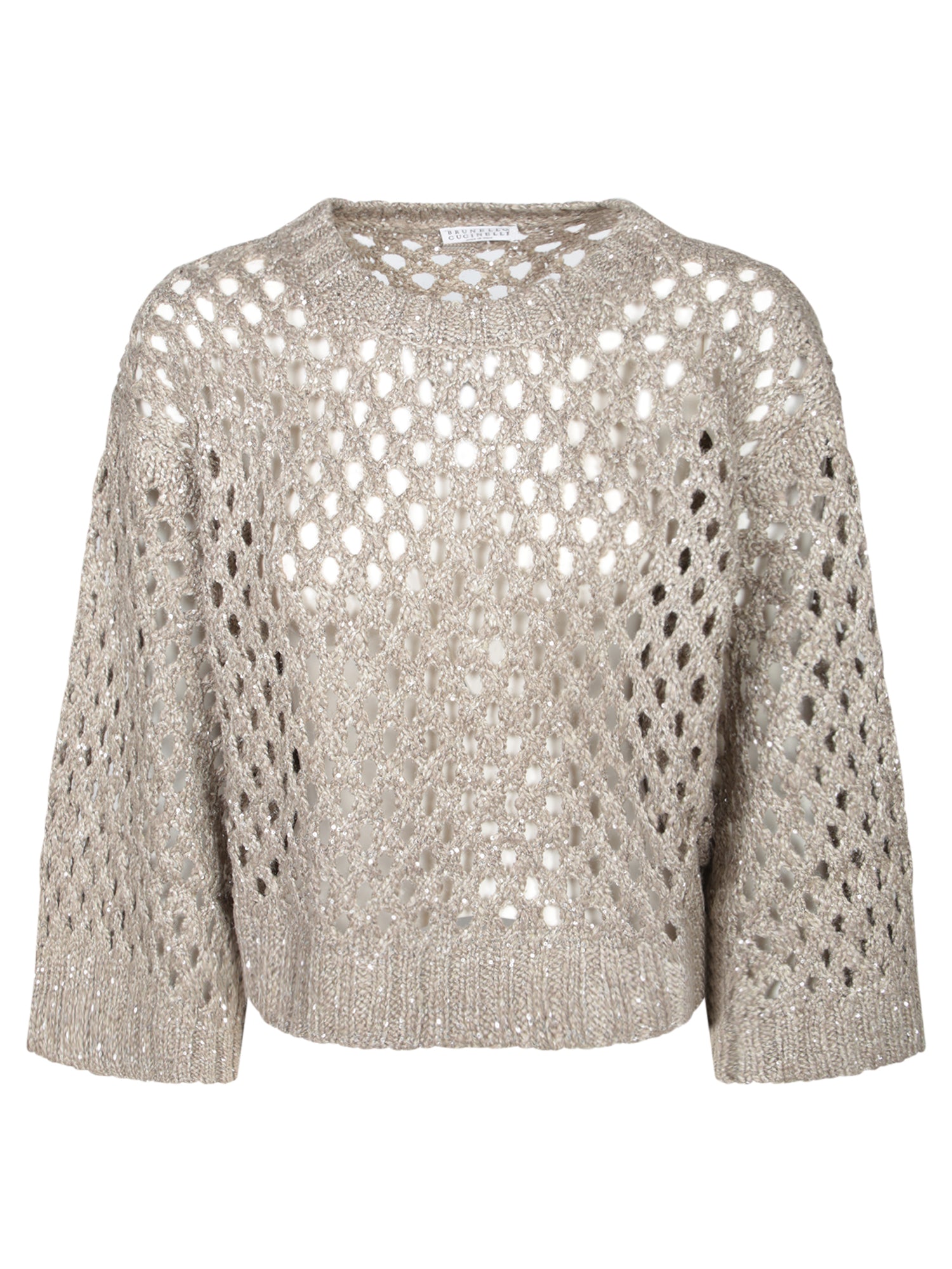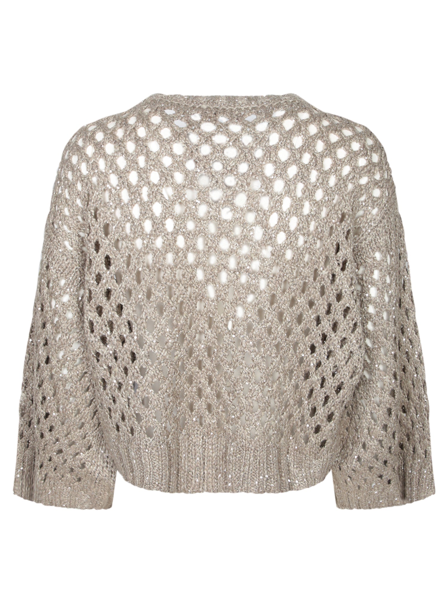 Long-sleeve sweater with open knit pattern. Finished with sequin detailing.