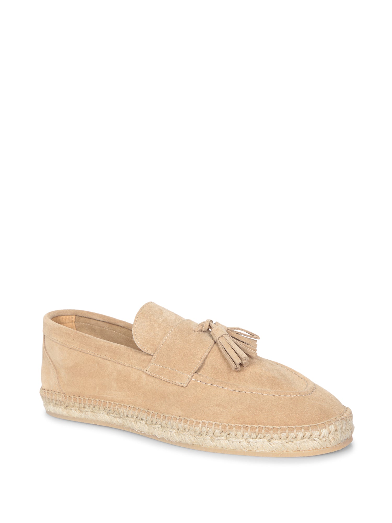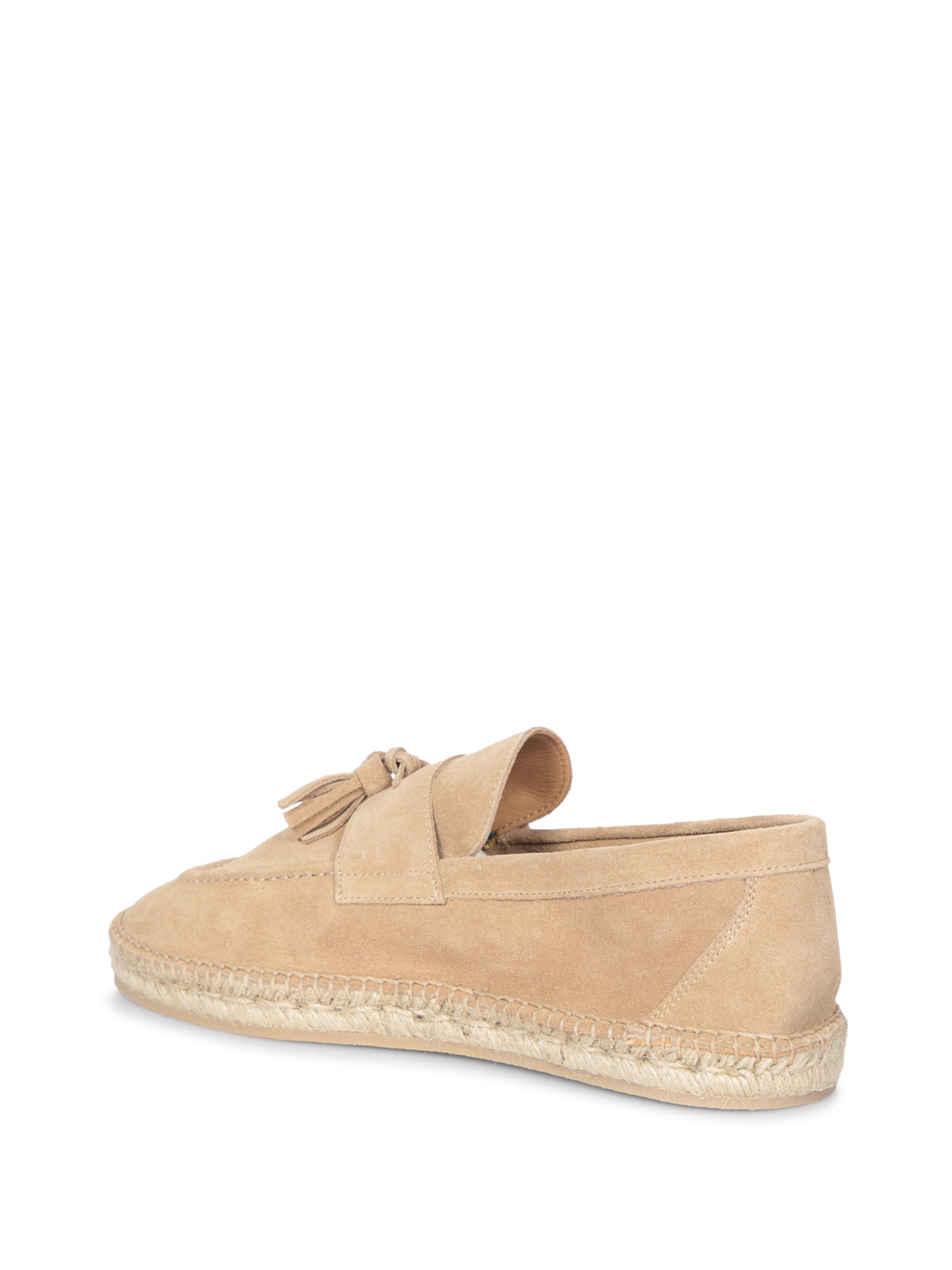 Beige suede upper. Slip-on design with bow detail. Woven rope sole.