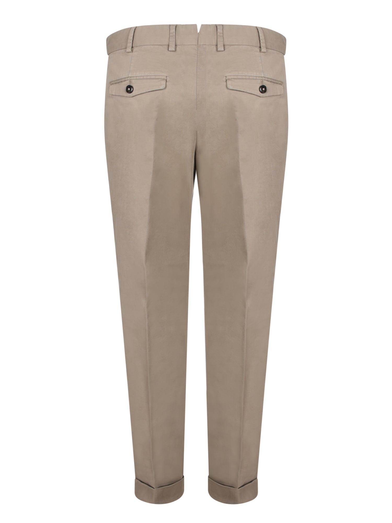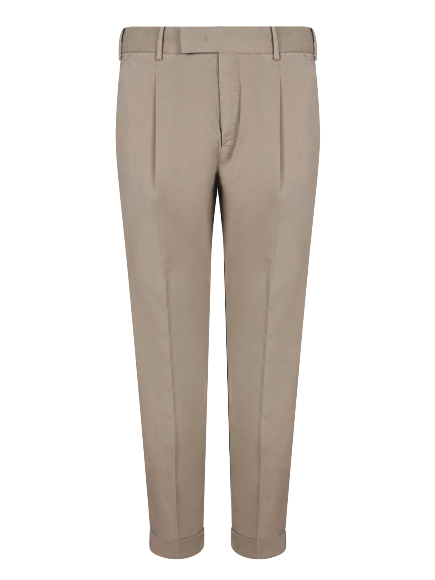 Front pleated design. Two side pockets and two back pockets. Front zip and button closure.