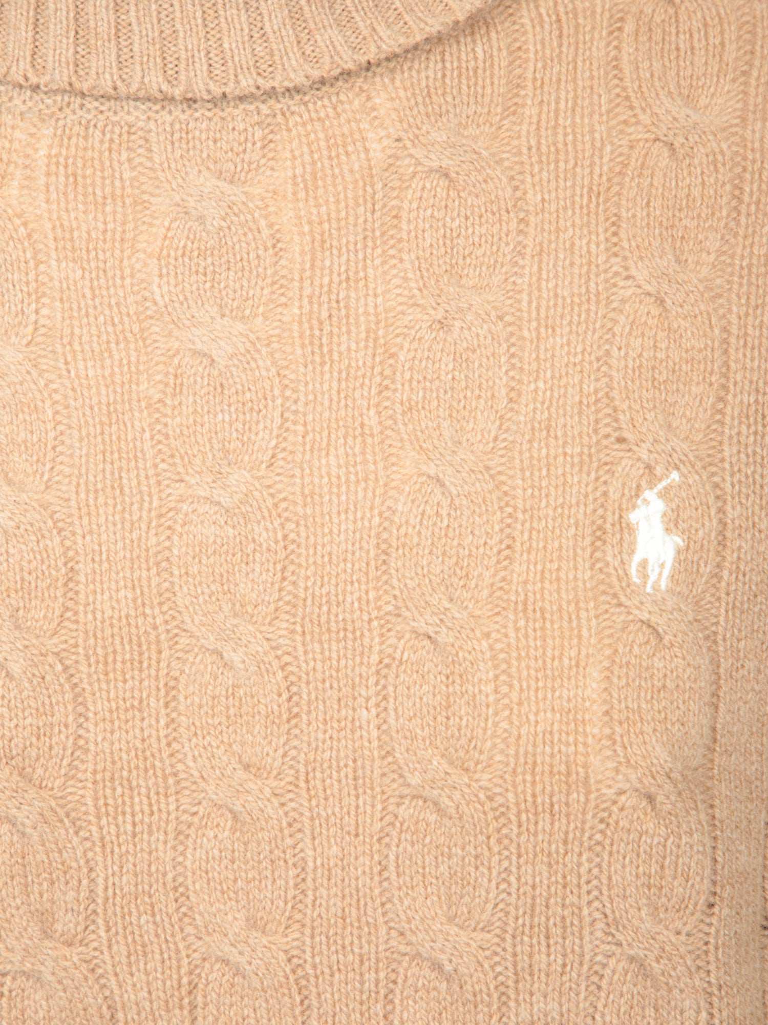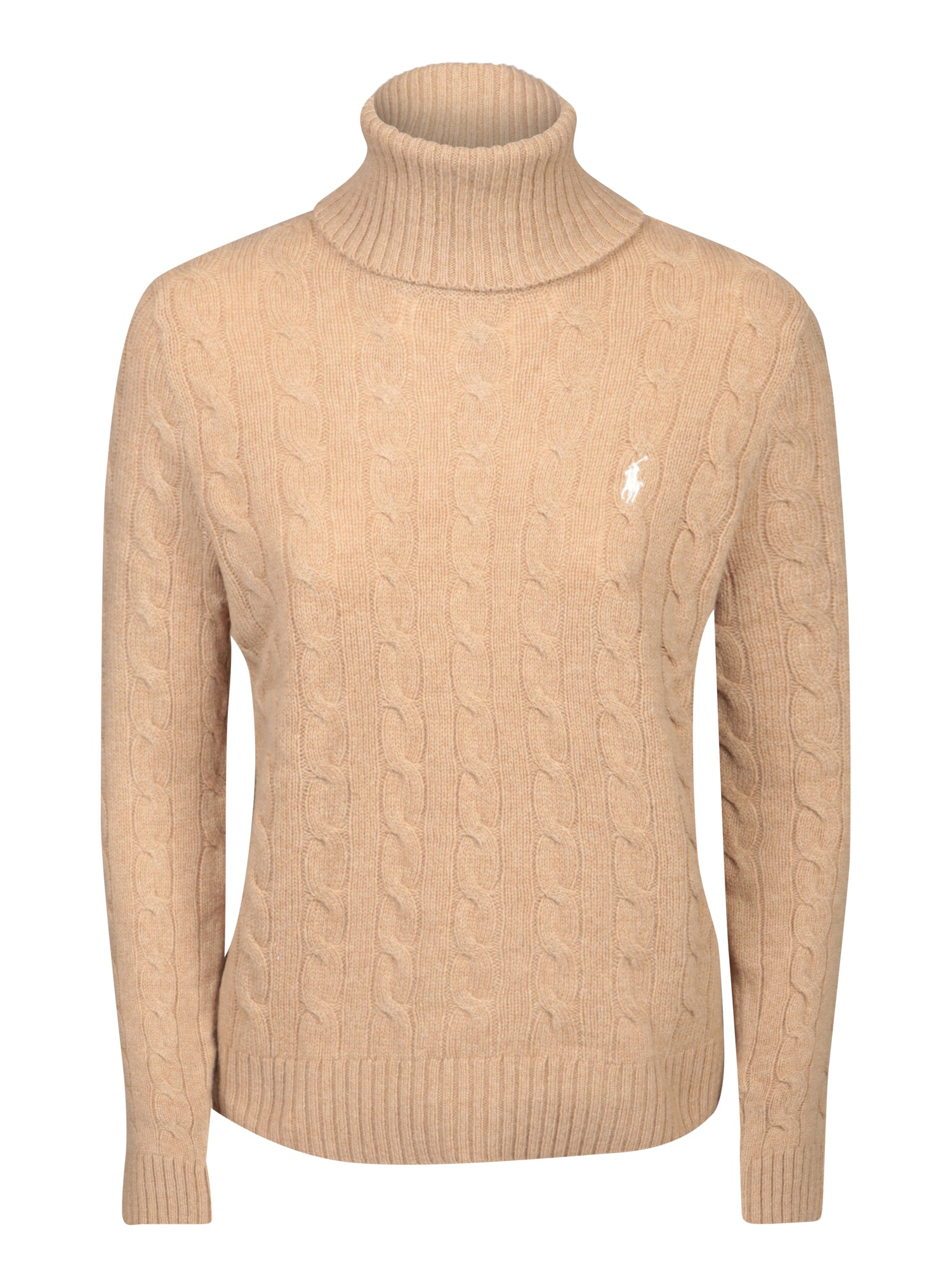 High neck sweater. Cable knit pattern. Embroidered logo on the chest.