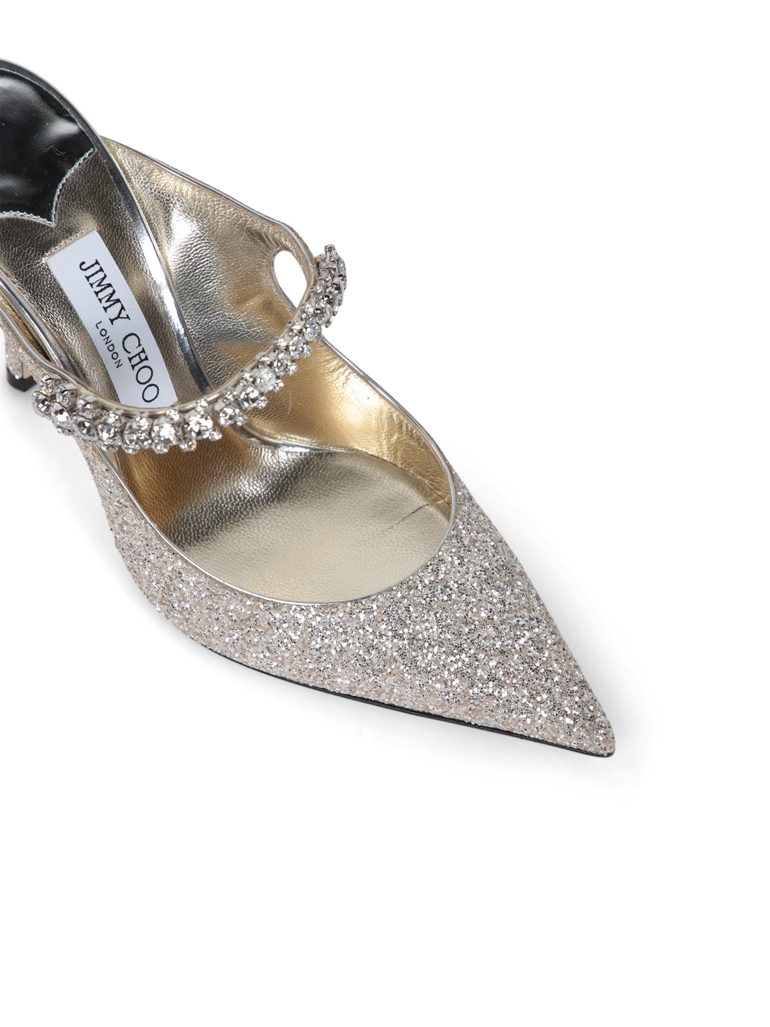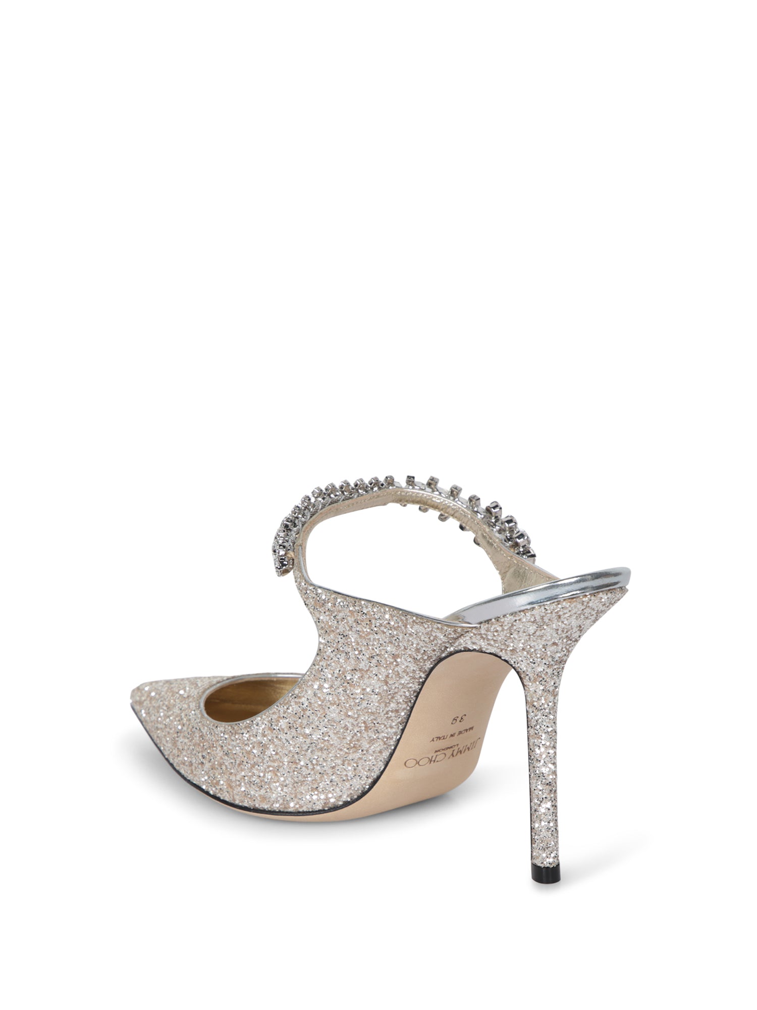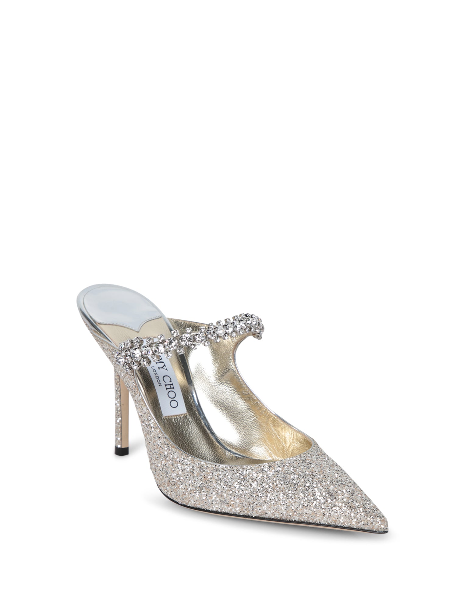 These Jimmy Choo mules elevate any ensemble with their sparkling beige glitter and crystal-studded upper strap, perfect for upscale evening events.