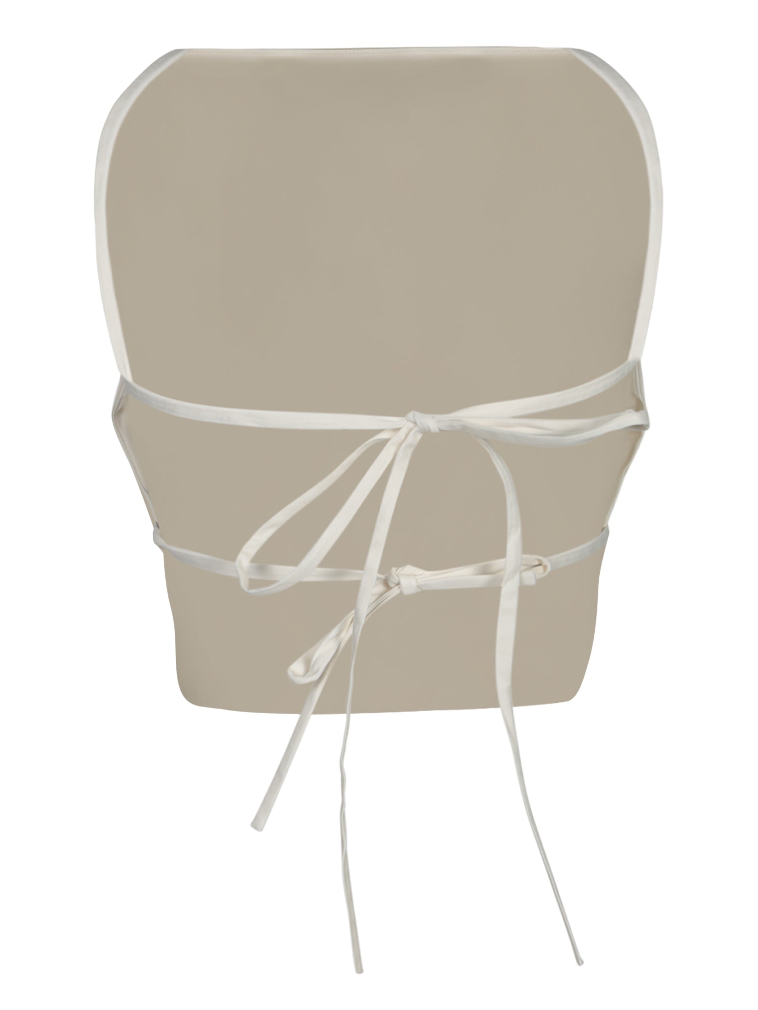 Sleeveless top. Black embossed floral decorations. Rear lace-up closure.
