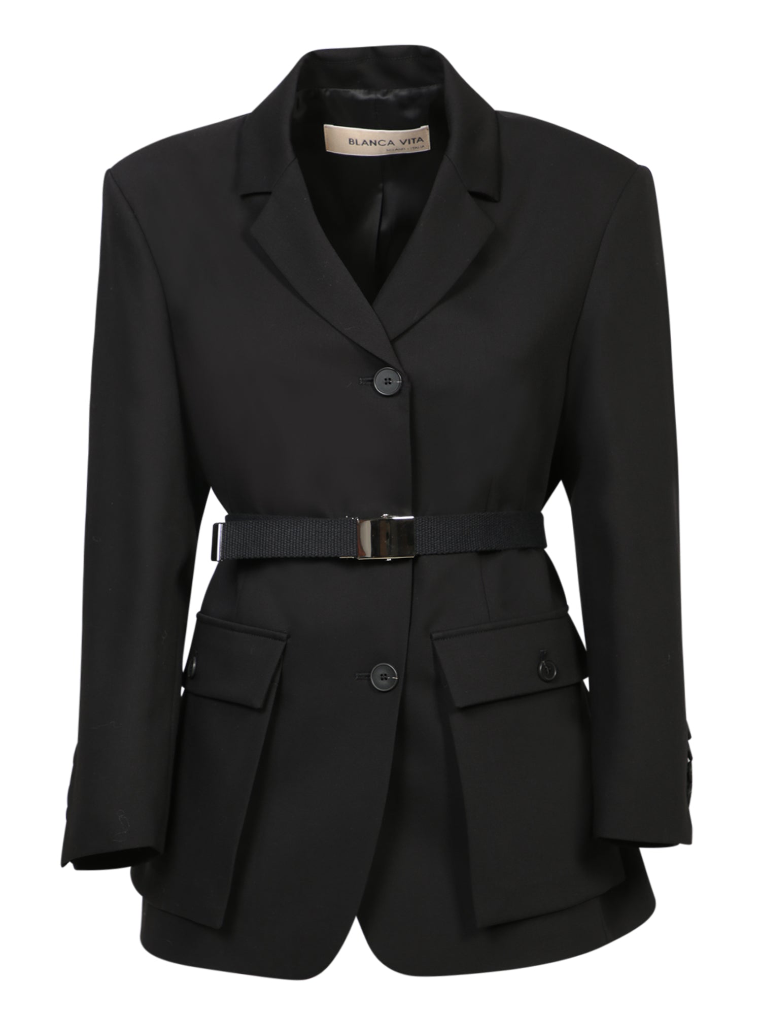 An elegant and sophisticated piece by Blanca Vita. Its tailored structure is enhanced by a belt that defines the silhouette, while the flap pockets add a functional touch.