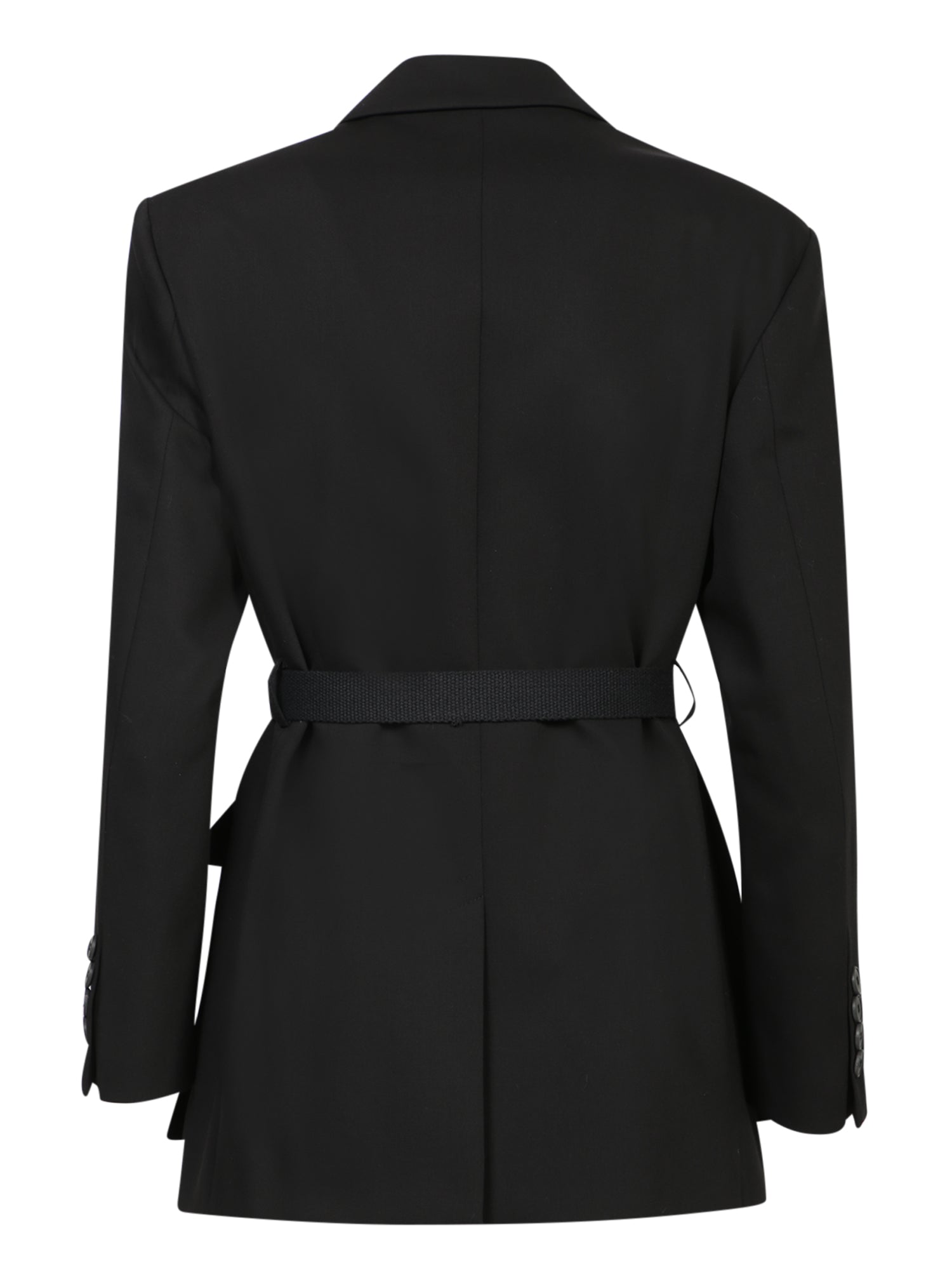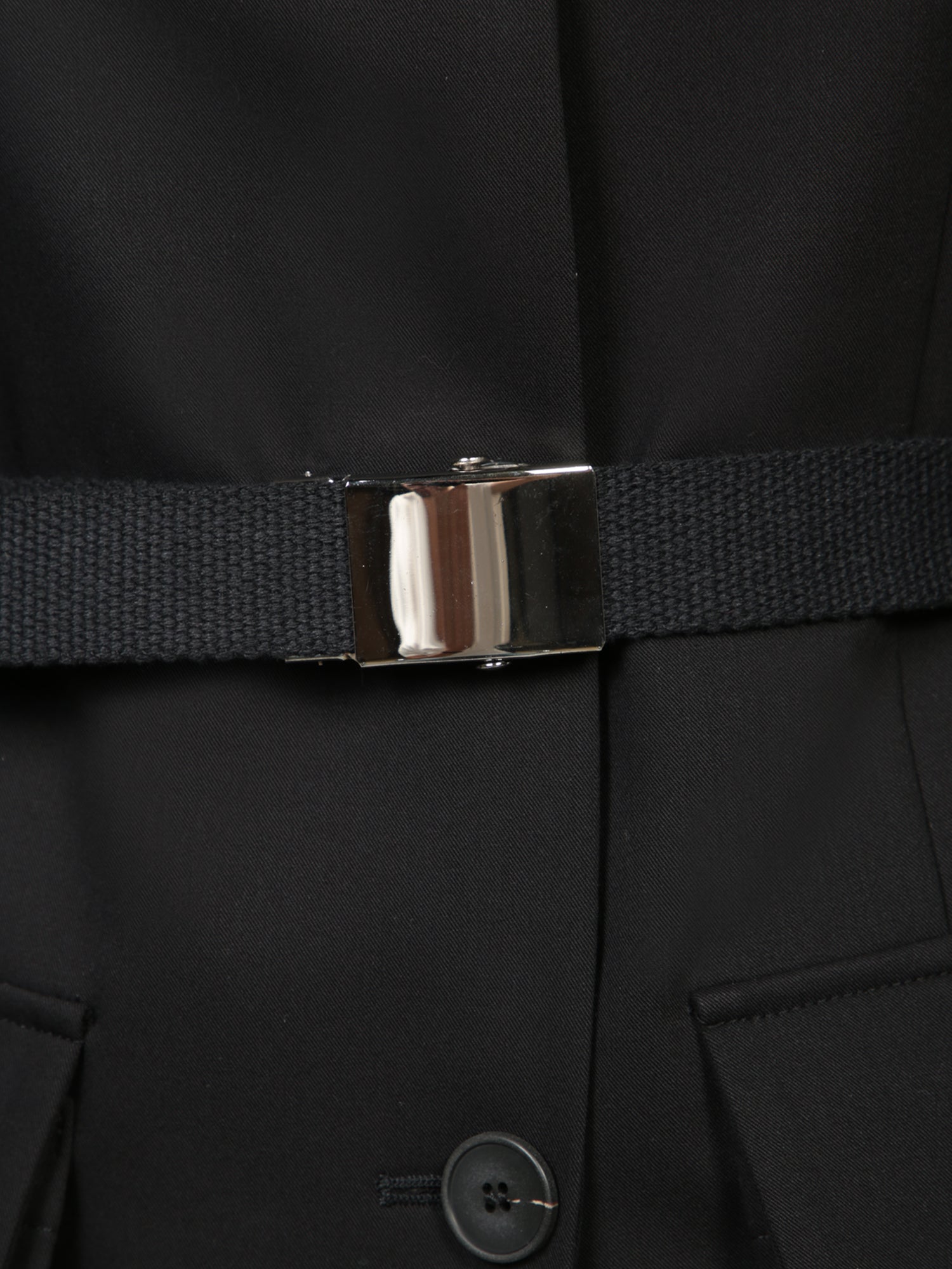 Crepe jacket with adjustable belt. Double-button front closure. Flap pockets.