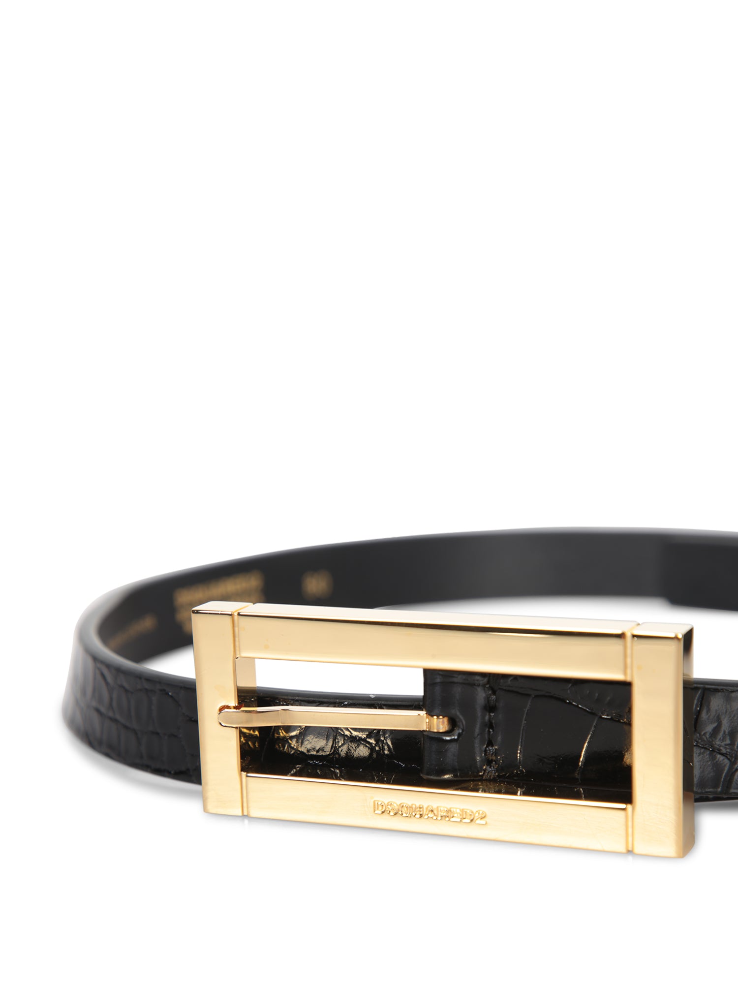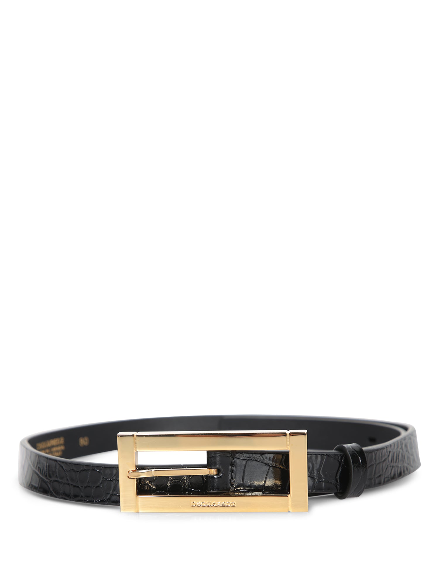 Printed calfskin leather belt. Golden rectangular buckle. Adjustable.