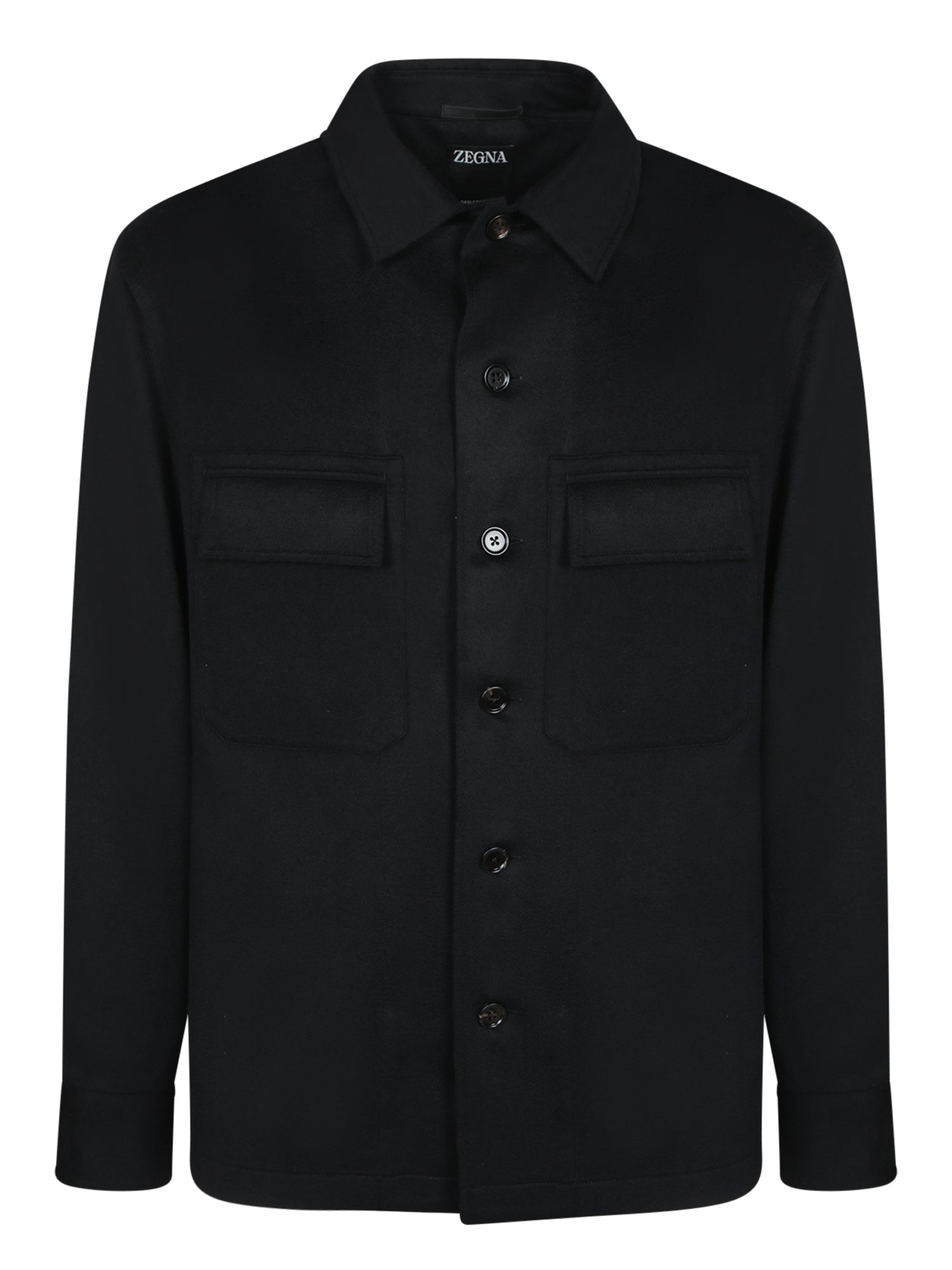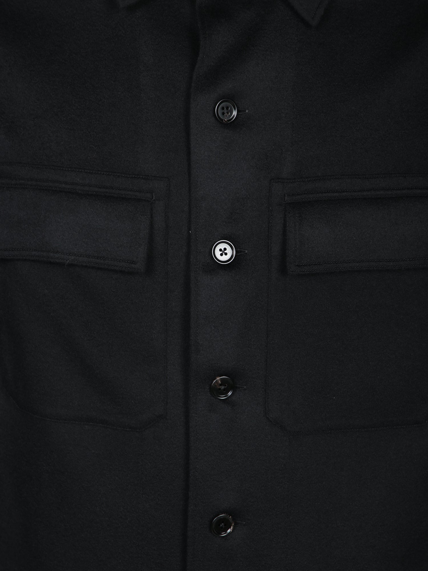 Long sleeve cashmere overshirt. Features two chest patch pockets. Front button closure.