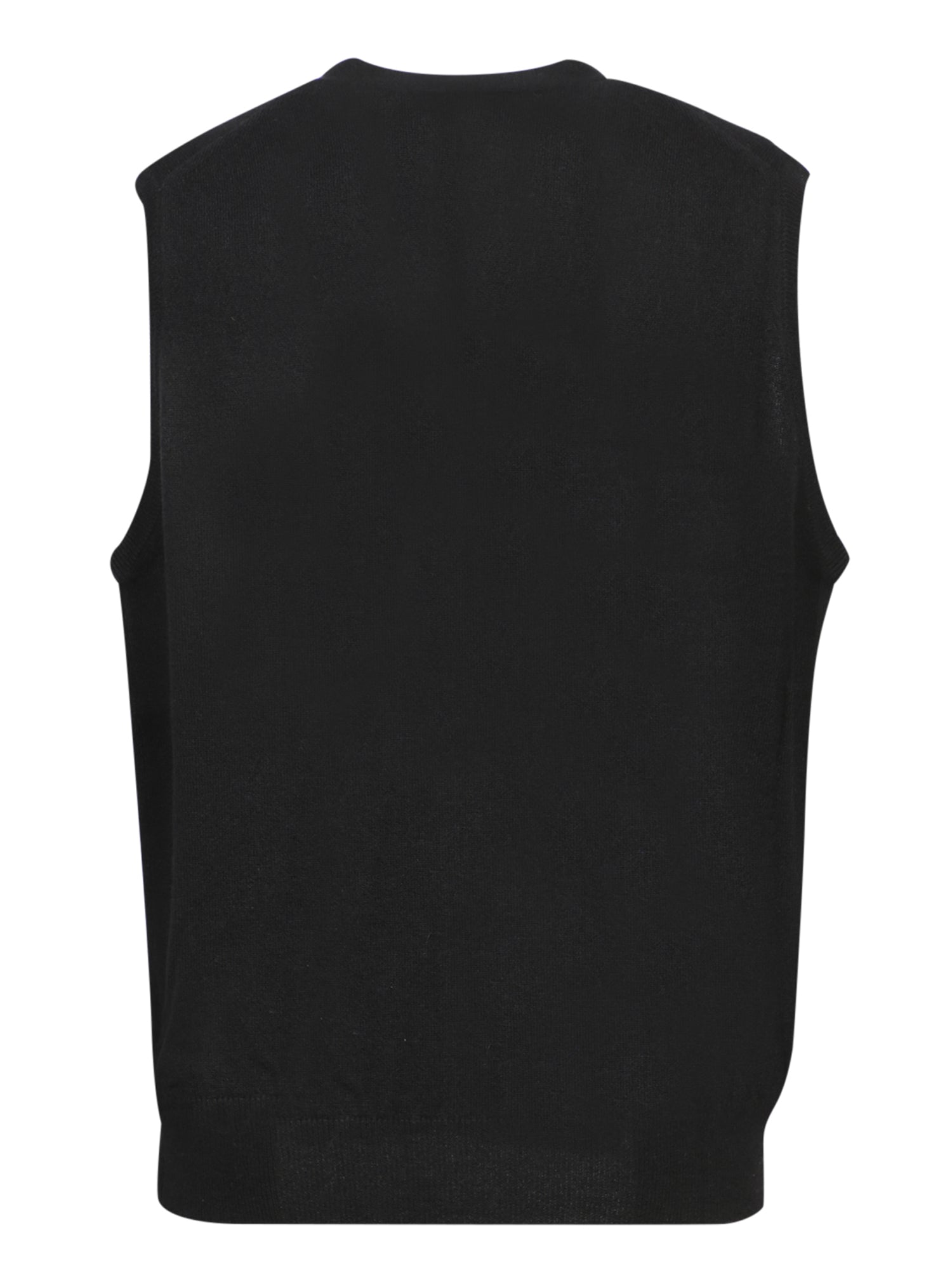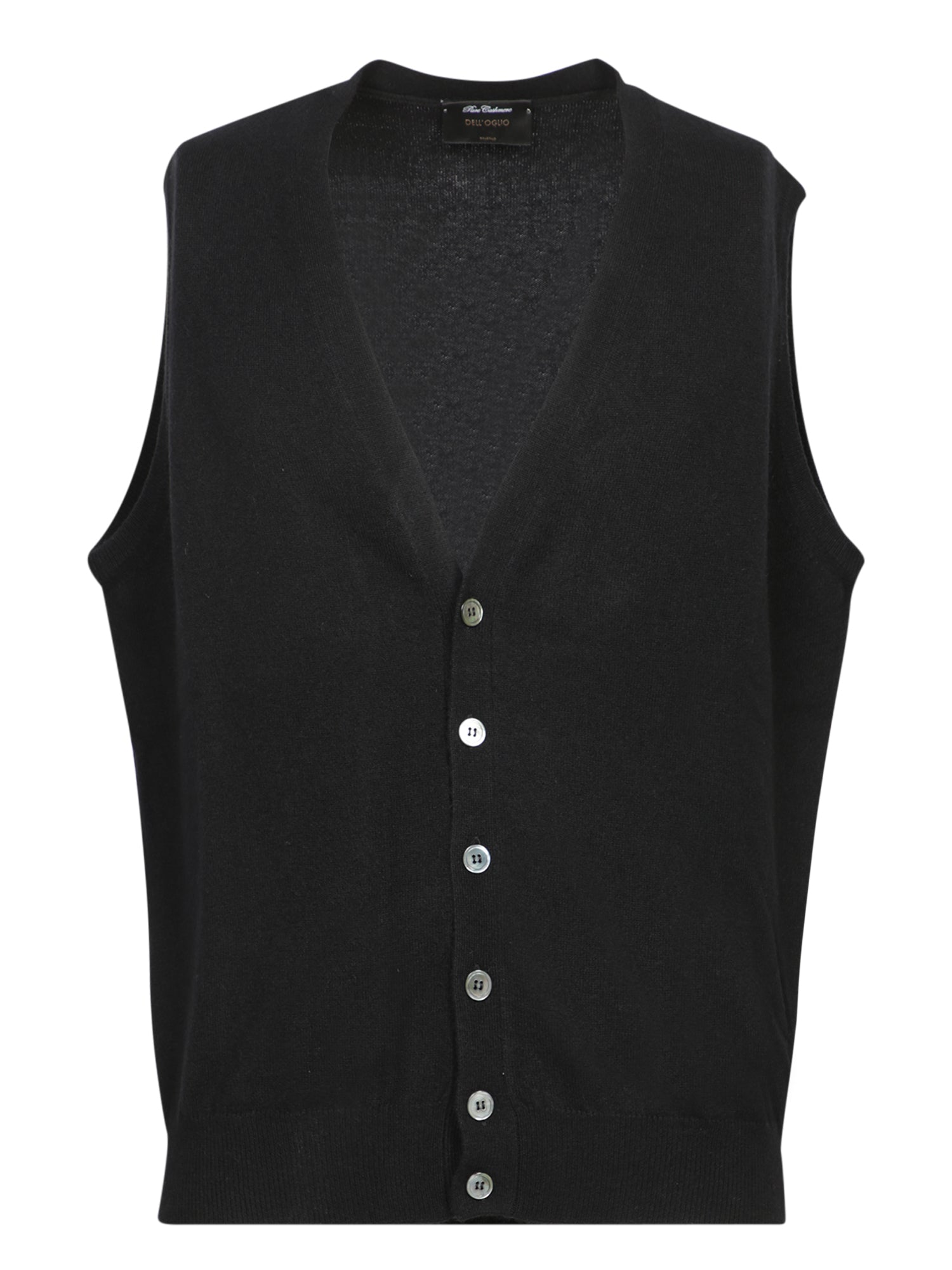 This black cashmere vest by Dell'Oglio delivers timeless elegance with its V-neckline and tone-on-tone front buttons, perfect for a sophisticated look on any occasion.