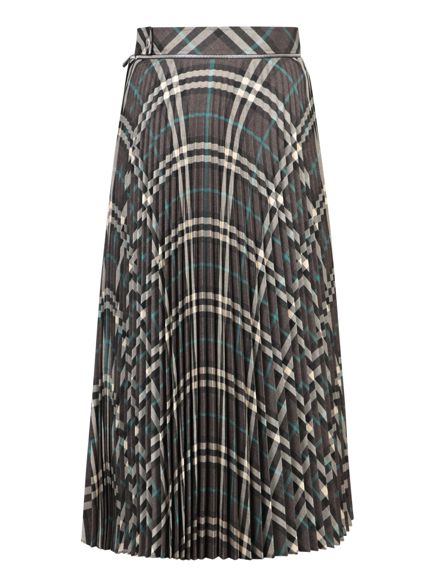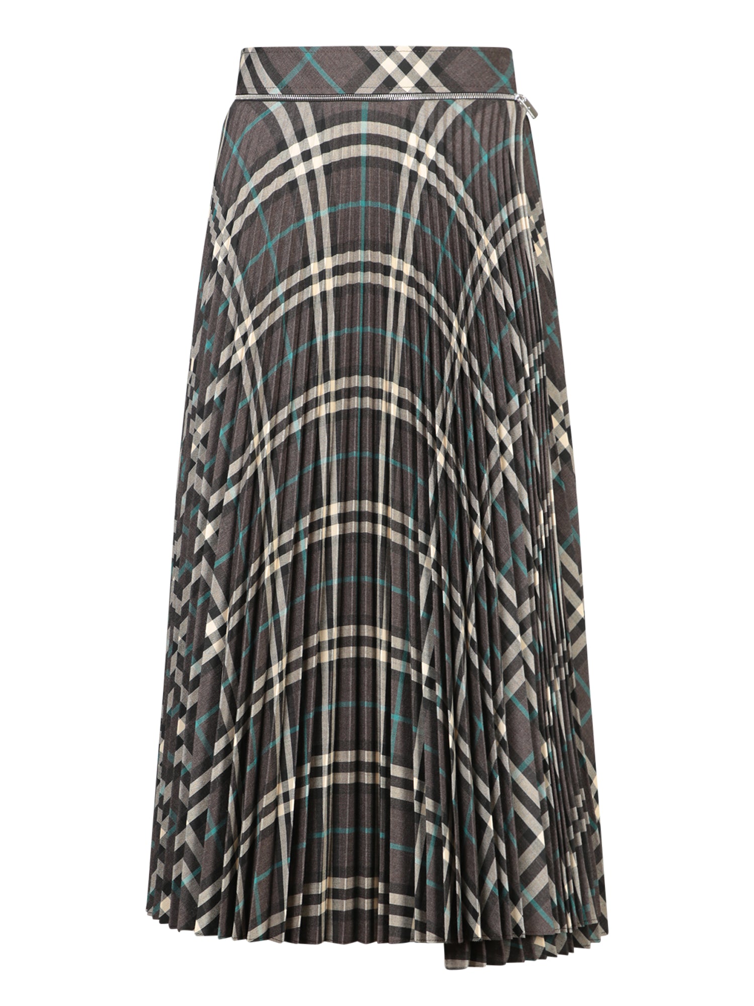This elegant Burberry pleated midi skirt features a timeless check pattern enhanced with vivid turquoise accents, perfect for a look that blends tradition with modernity.