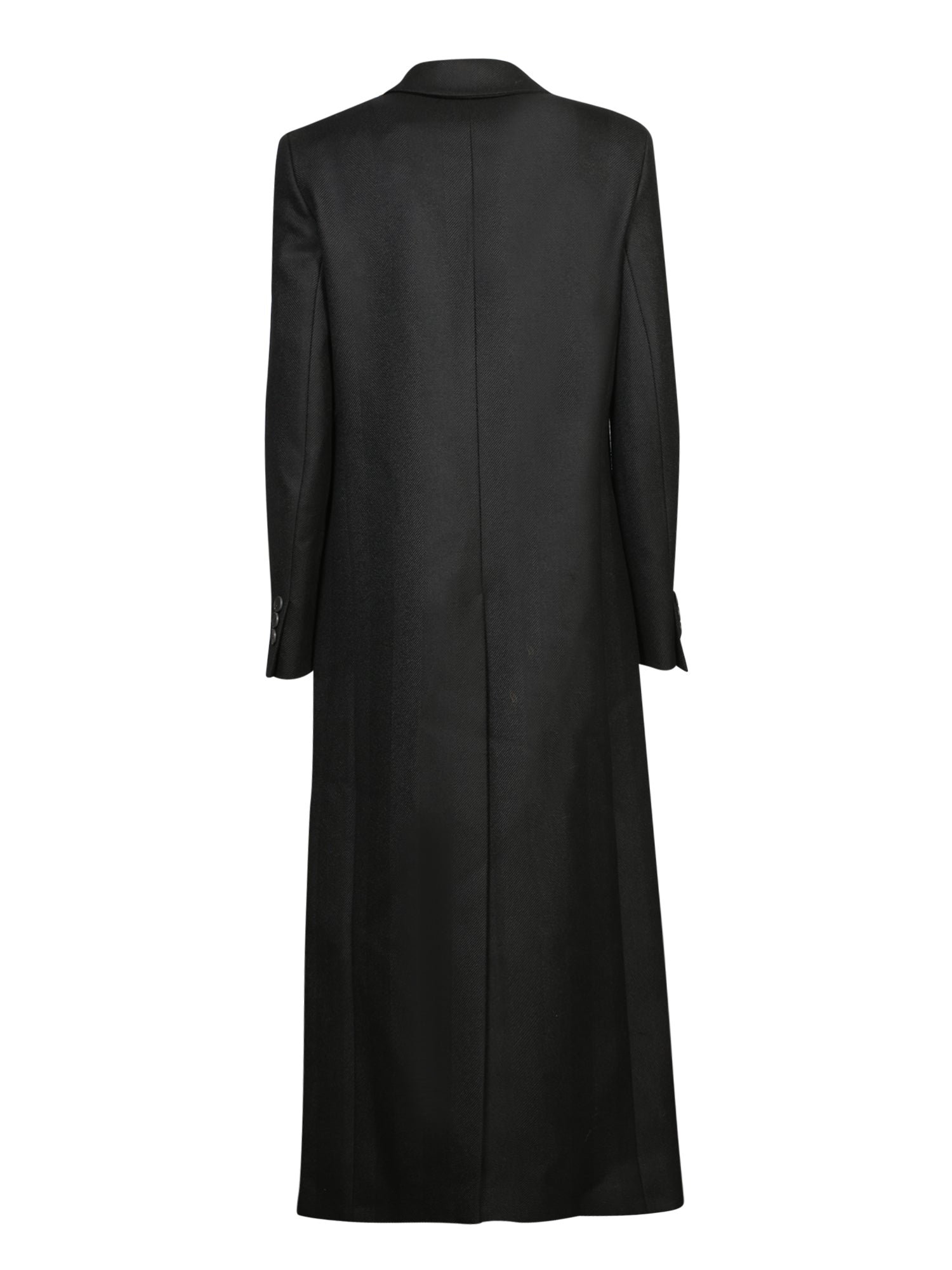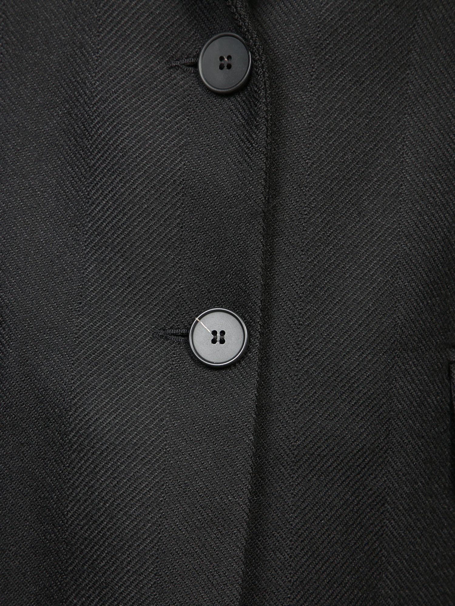 Long coat with chevron design. Made from a wool blend. Features a classic collar and button closure.
