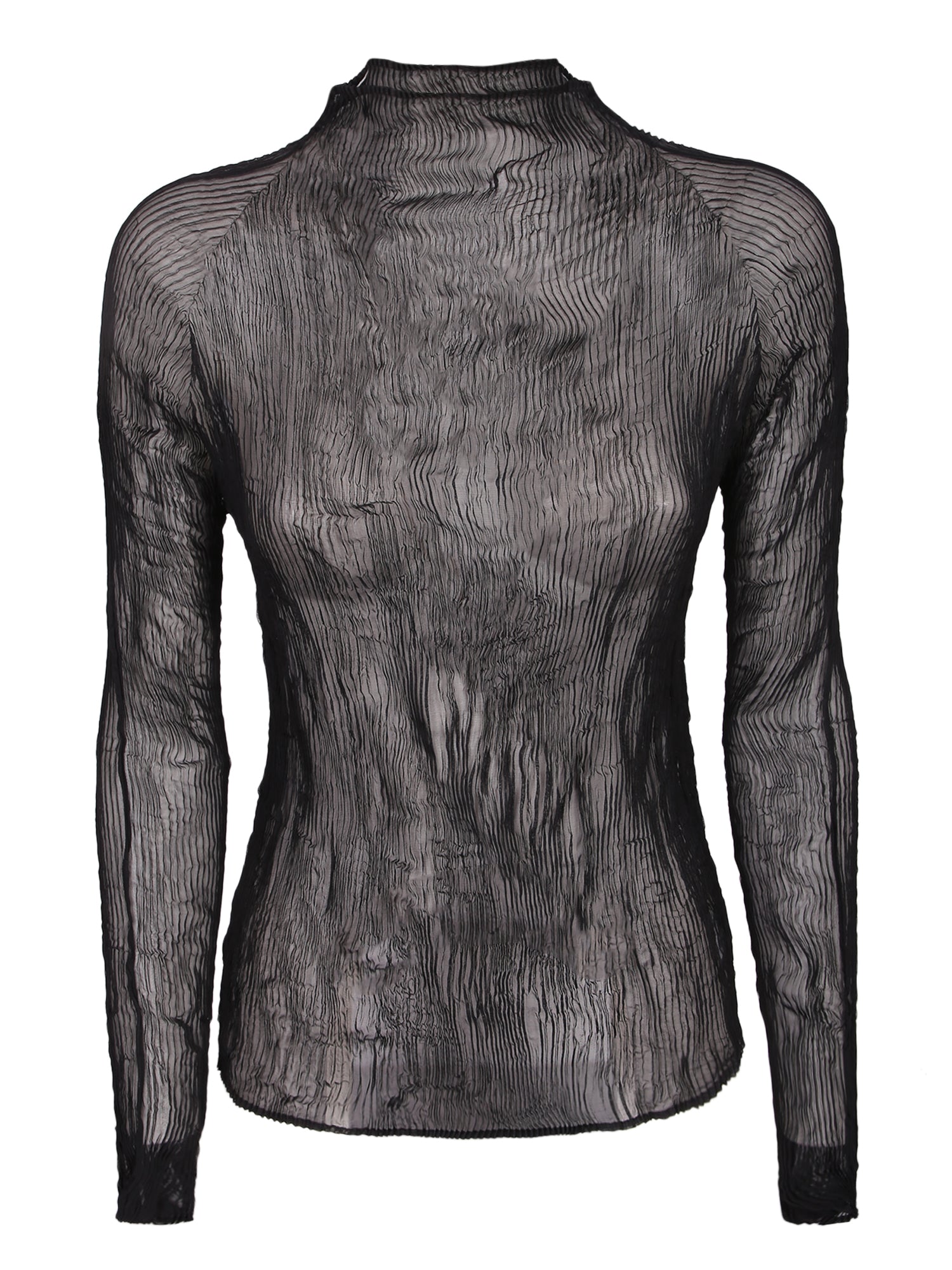 Long-sleeved chiffon top. High collar. Pleated fabric design.