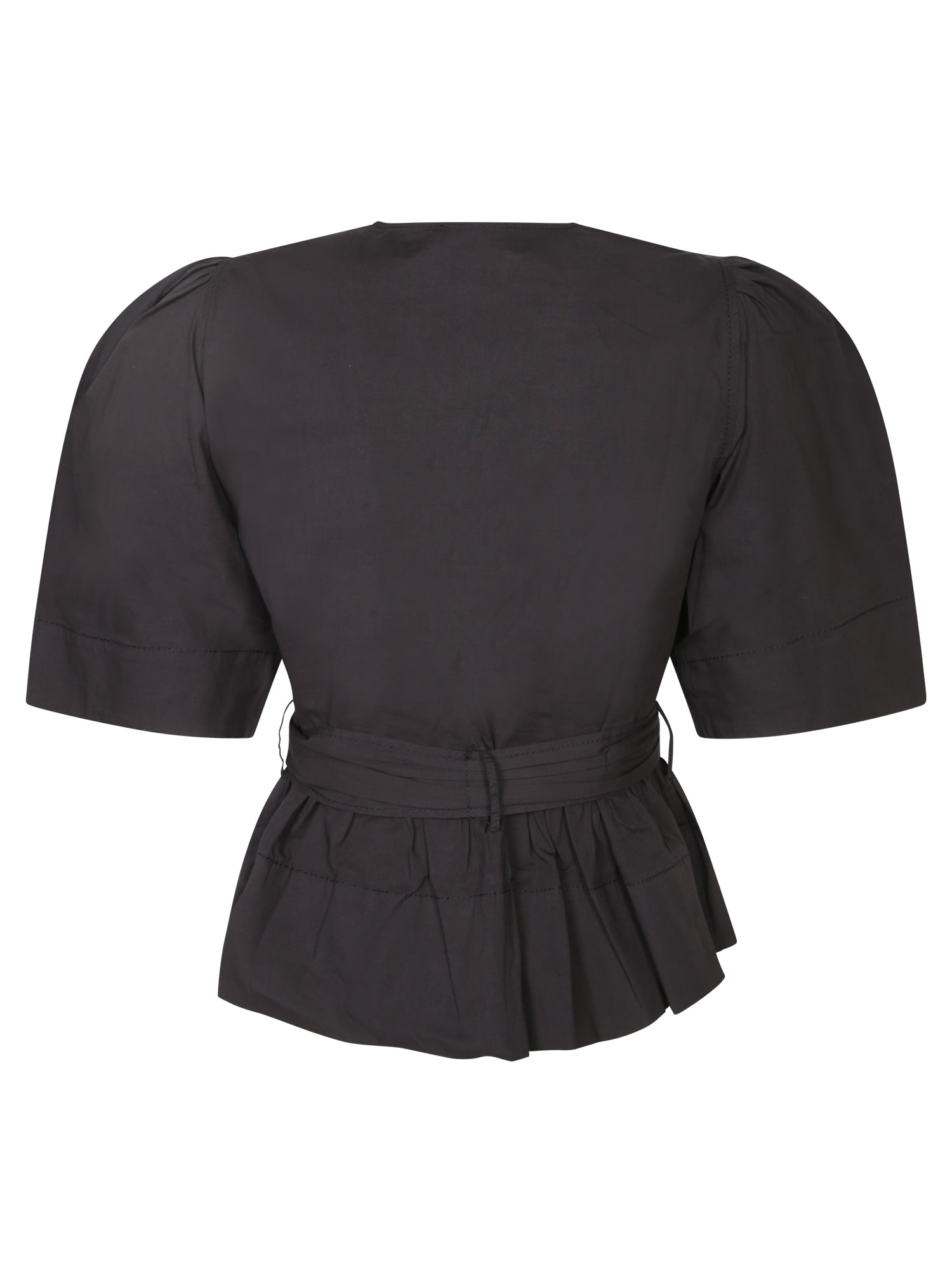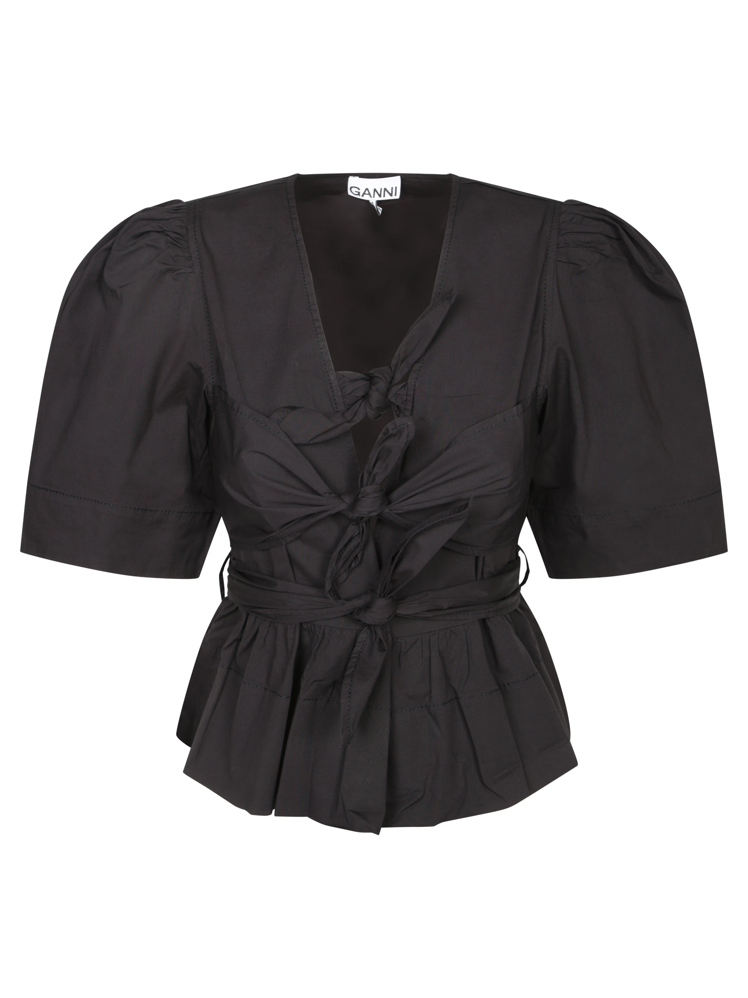 This elegant GANNI black blouse with a knot detail and waist belt emphasizes a feminine silhouette, perfect for both daytime and evening sophisticated looks.