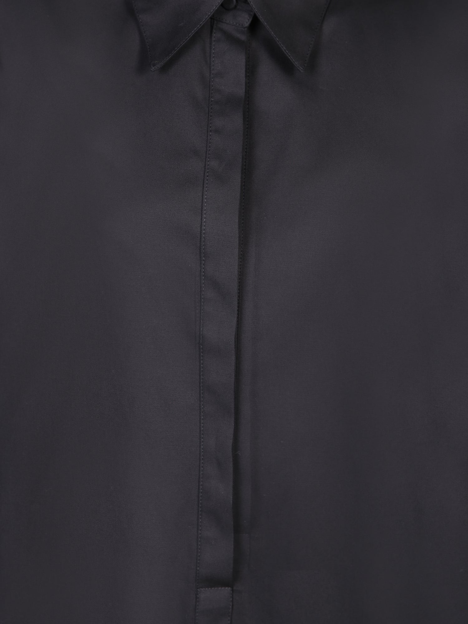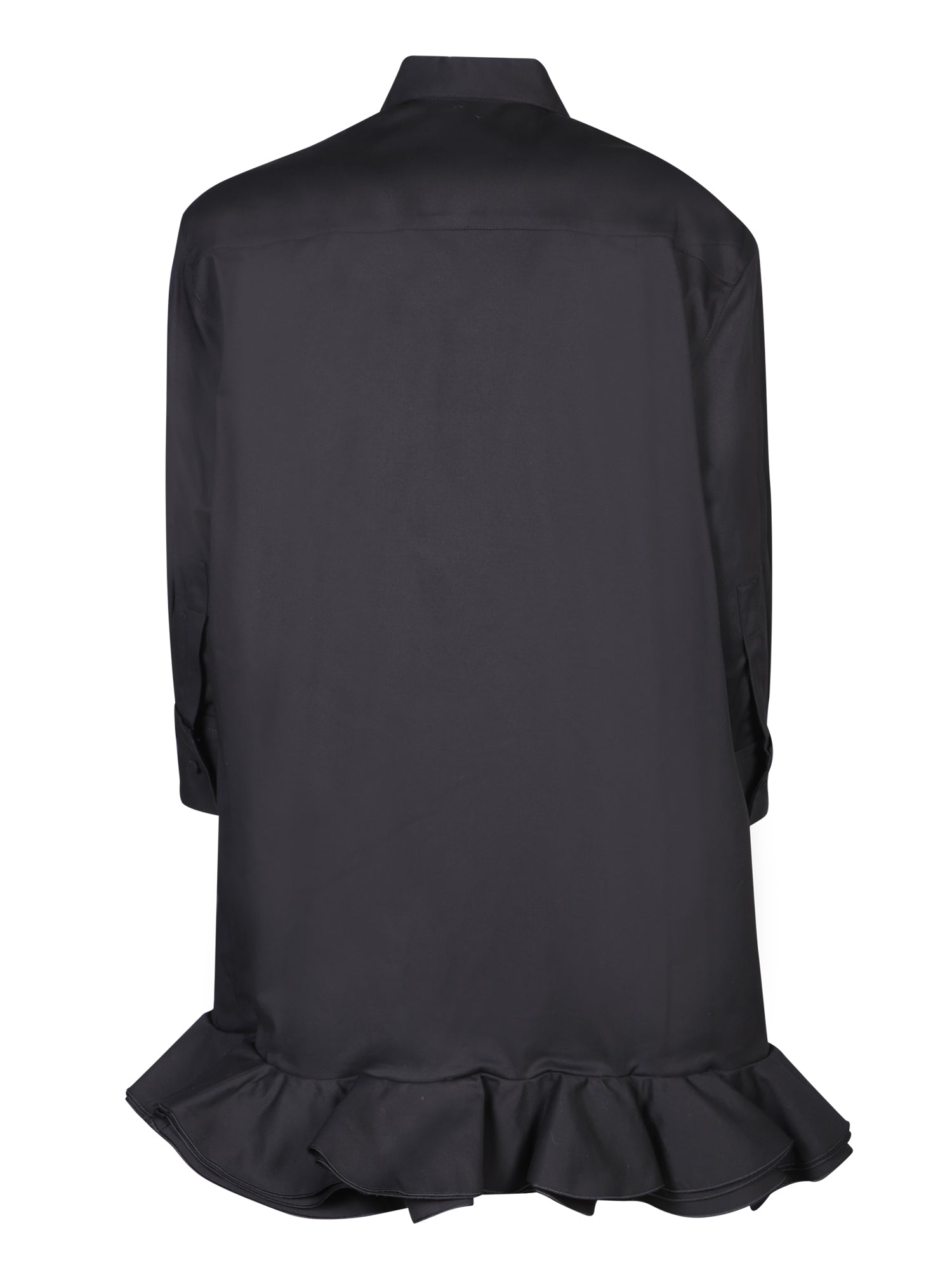 Long sleeve dress with classic collar. Front button closure. Ruffled hem.
