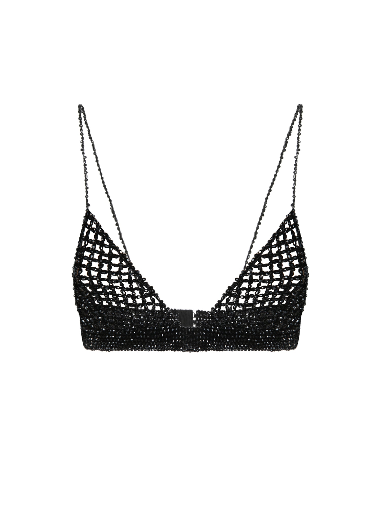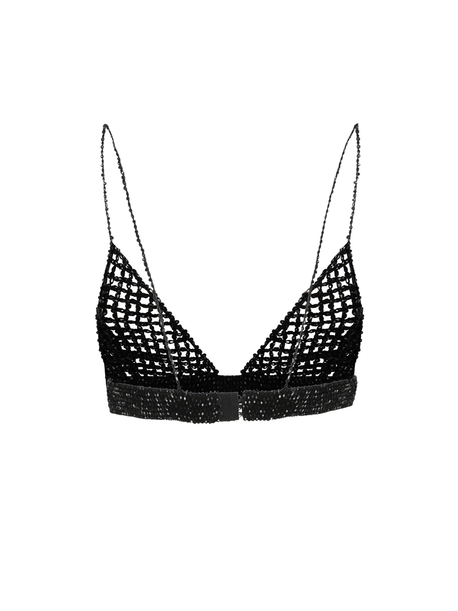Black crochet bra top with crystal detailing. Sleeveless design featuring thin chain-like straps.