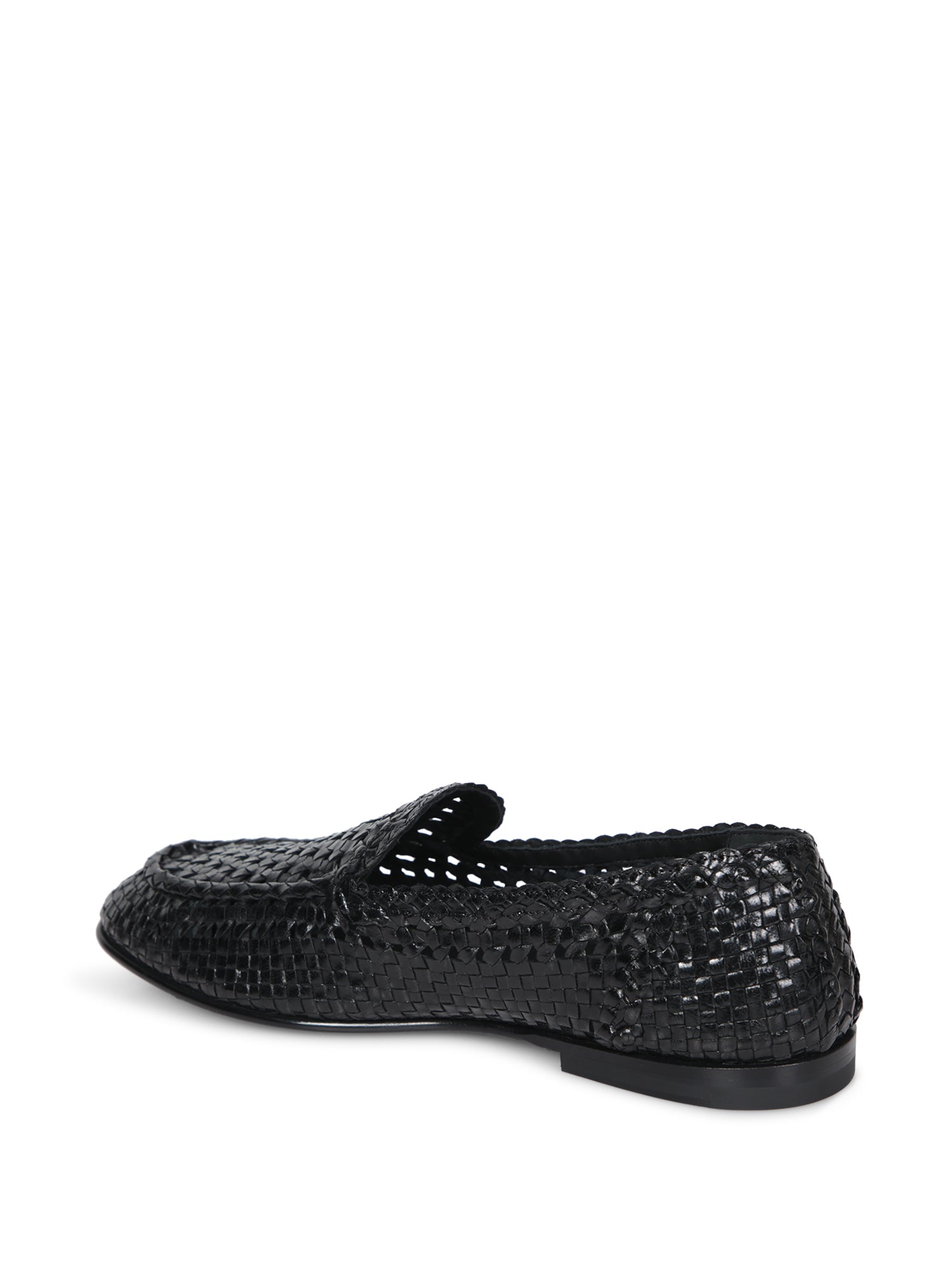 Woven leather loafer. Slip-on design with a rounded toe. Glossy finish.