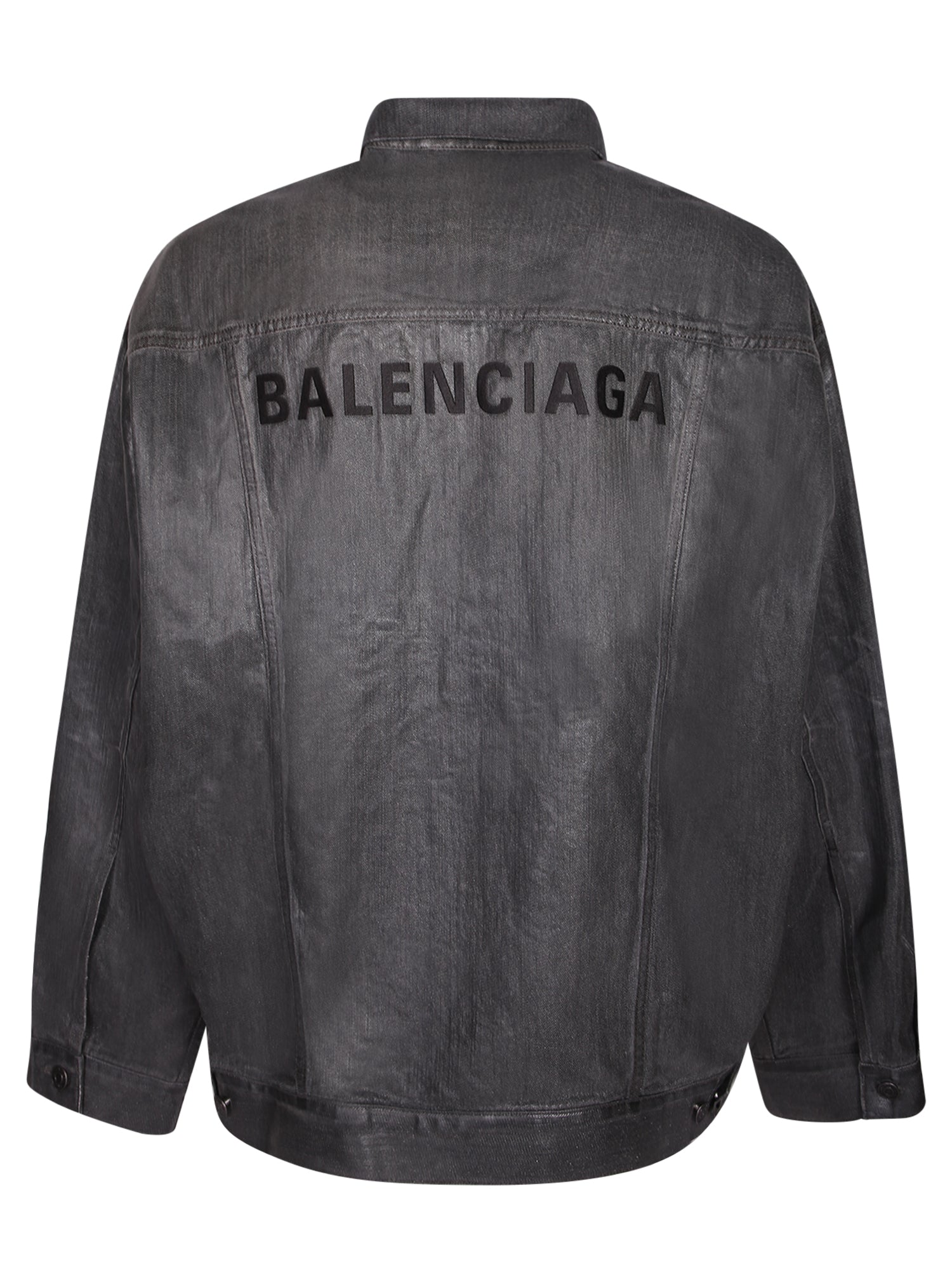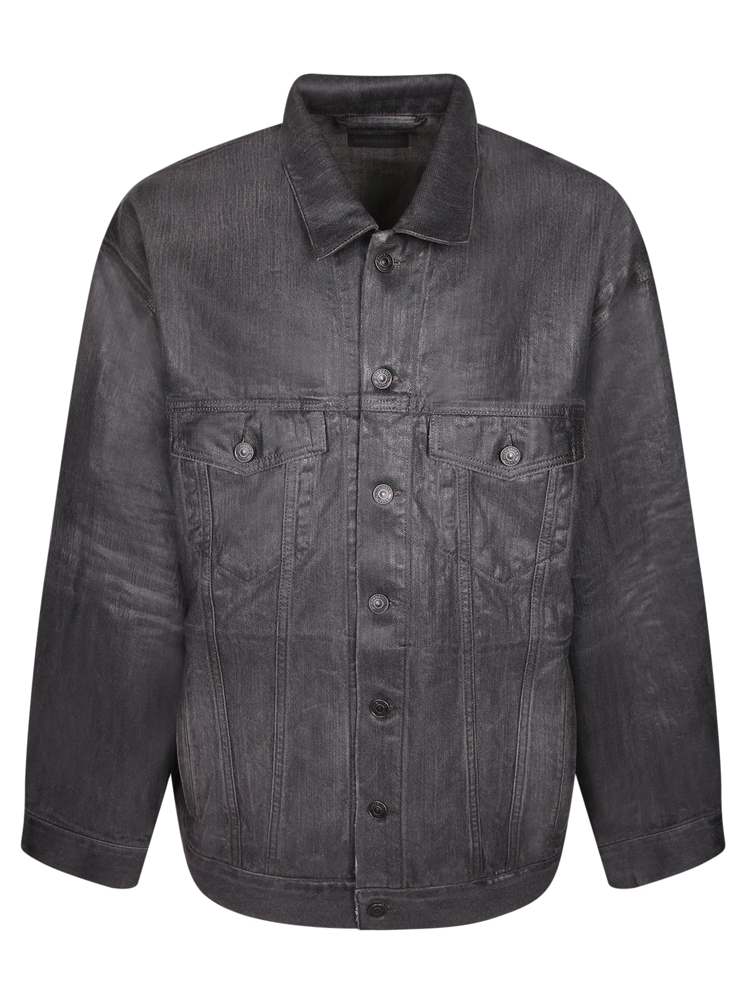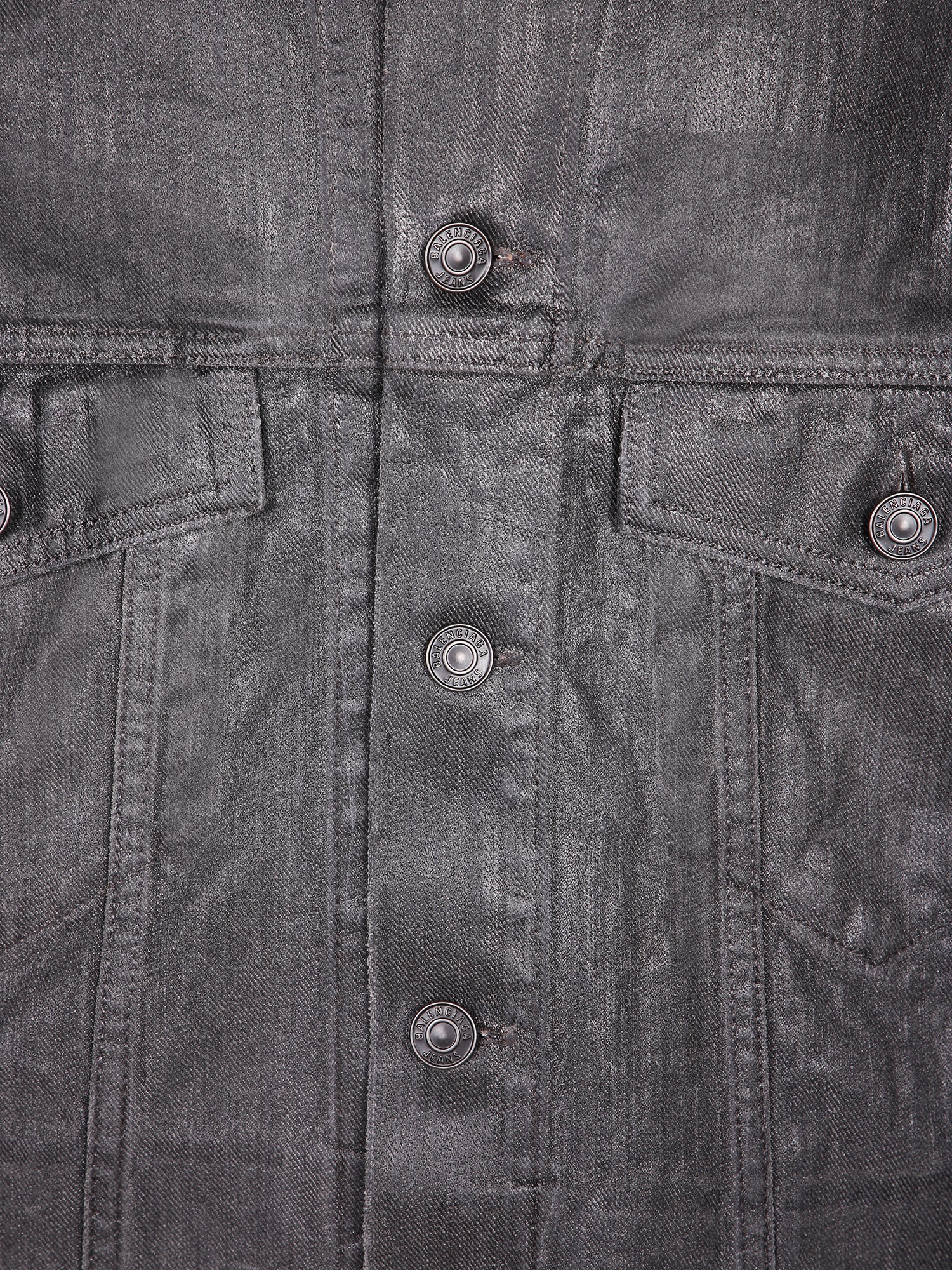 Denim jacket with classic collar, front button closure, flap chest pockets, and contrasting details.