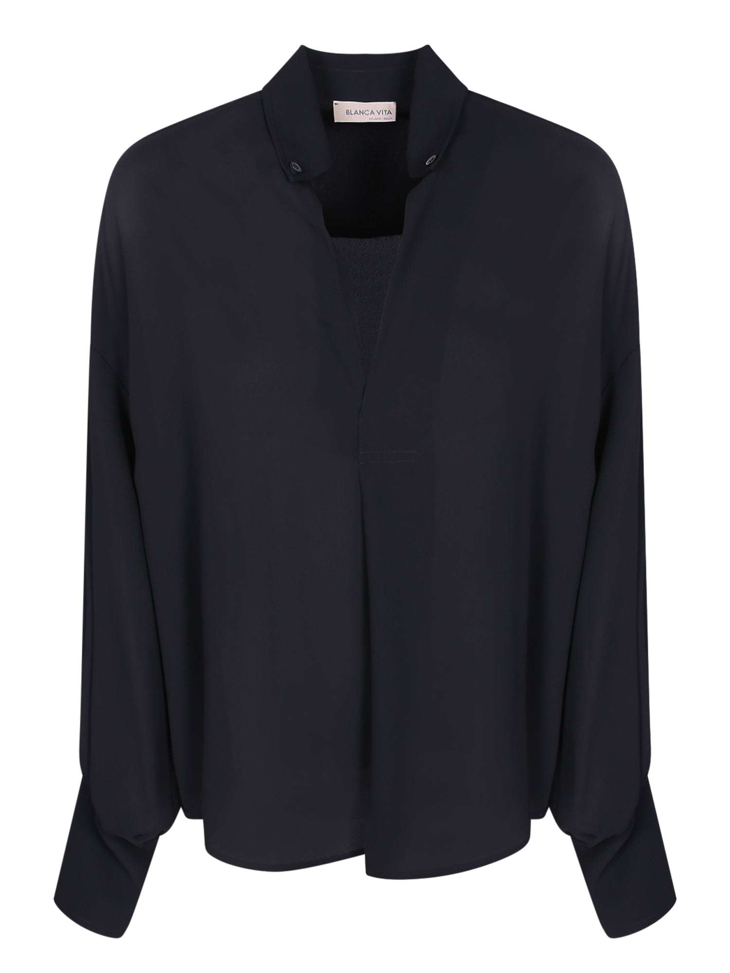Double georgette shirt. Pointed collar. Long sleeves with cuffs. Straight cut.