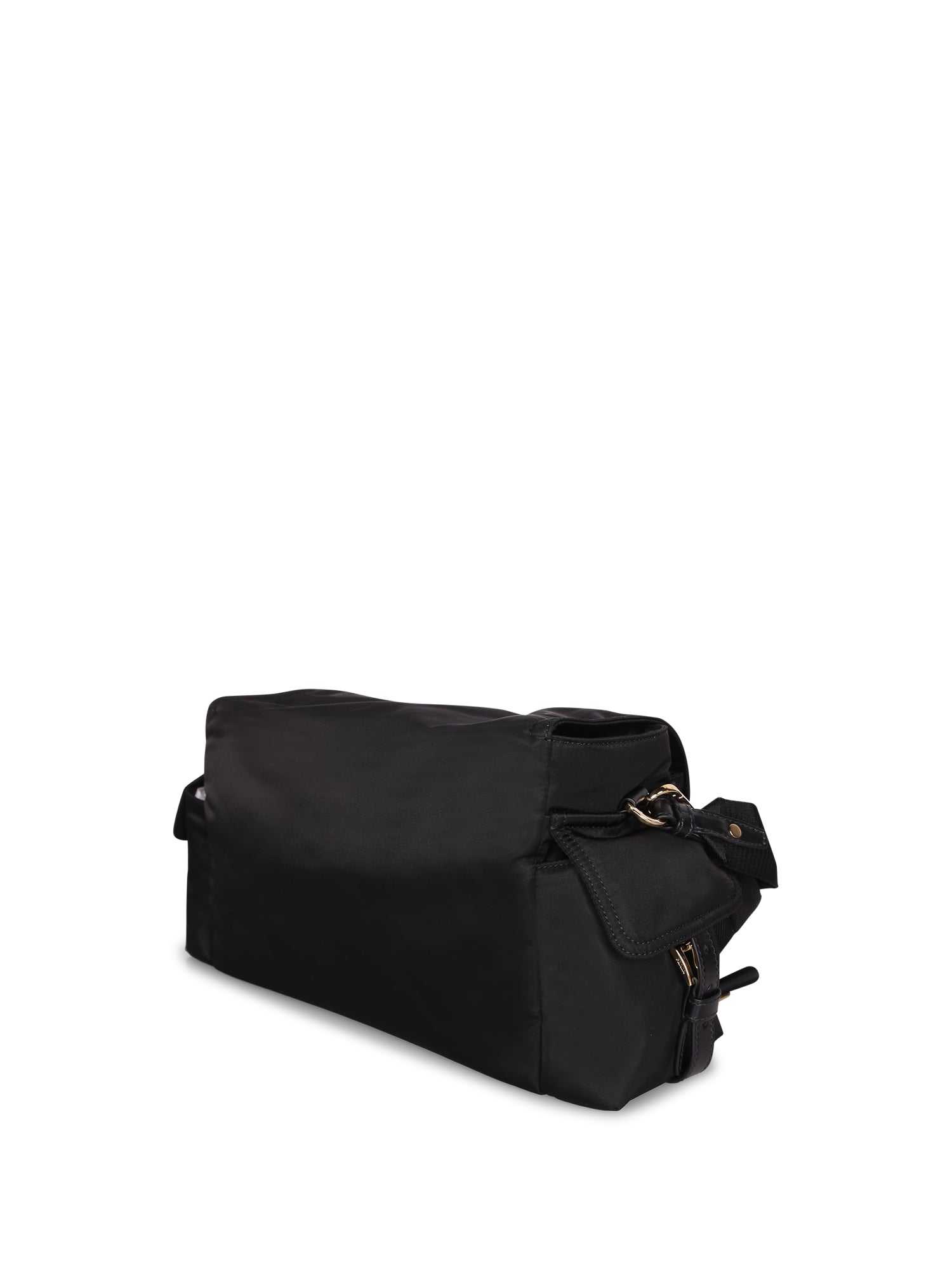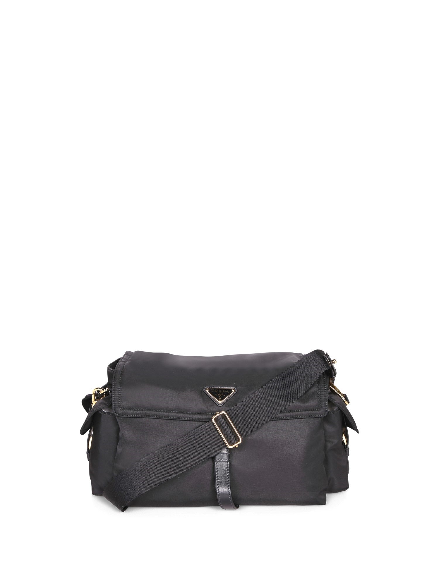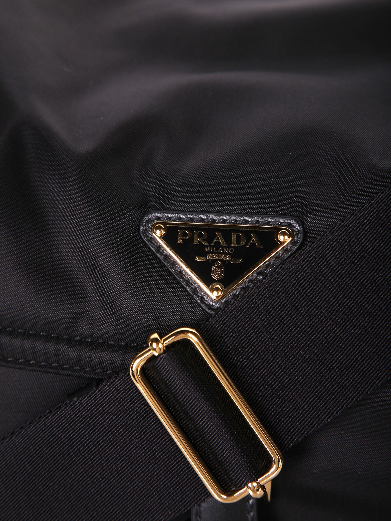 Black fabric shoulder bag. Metallic hardware with Prada triangular logo. Flap closure with hook.