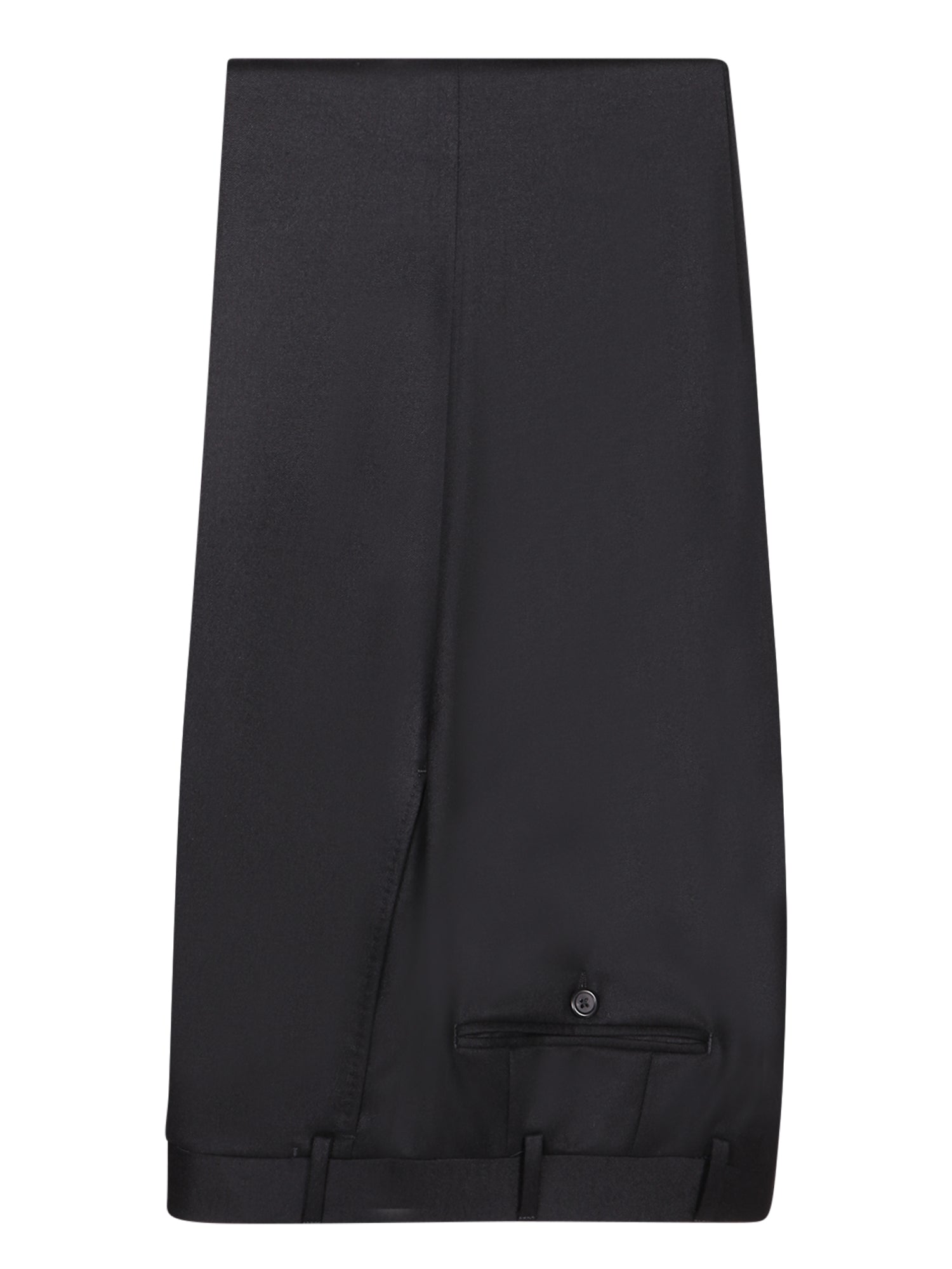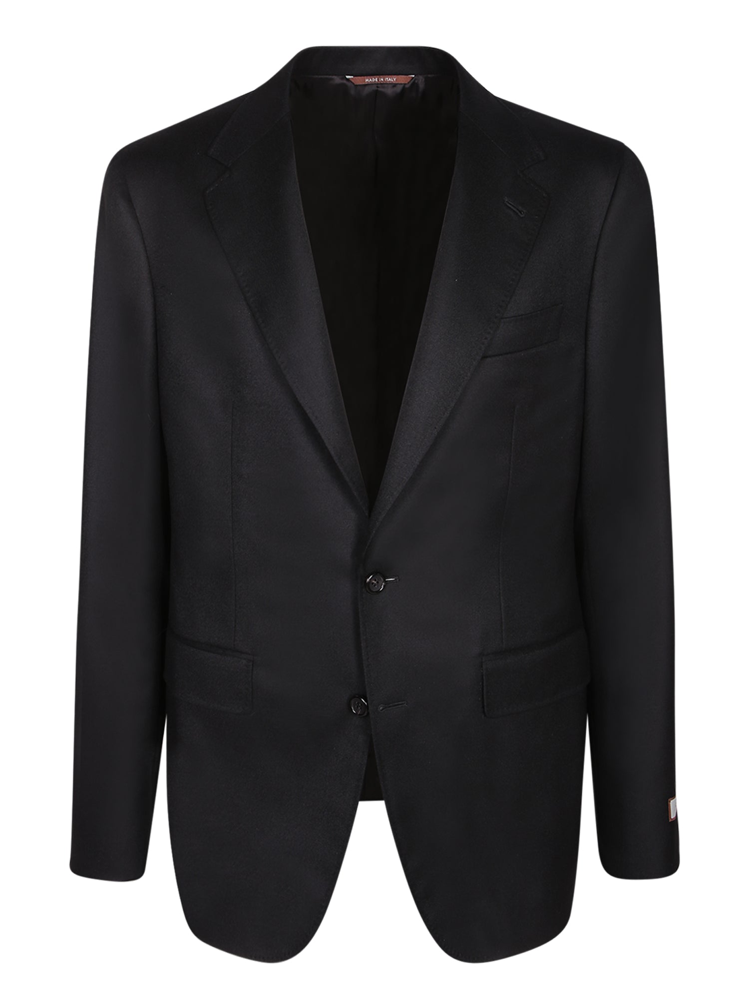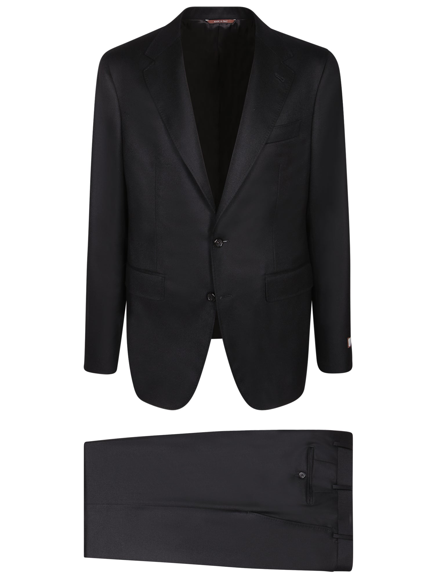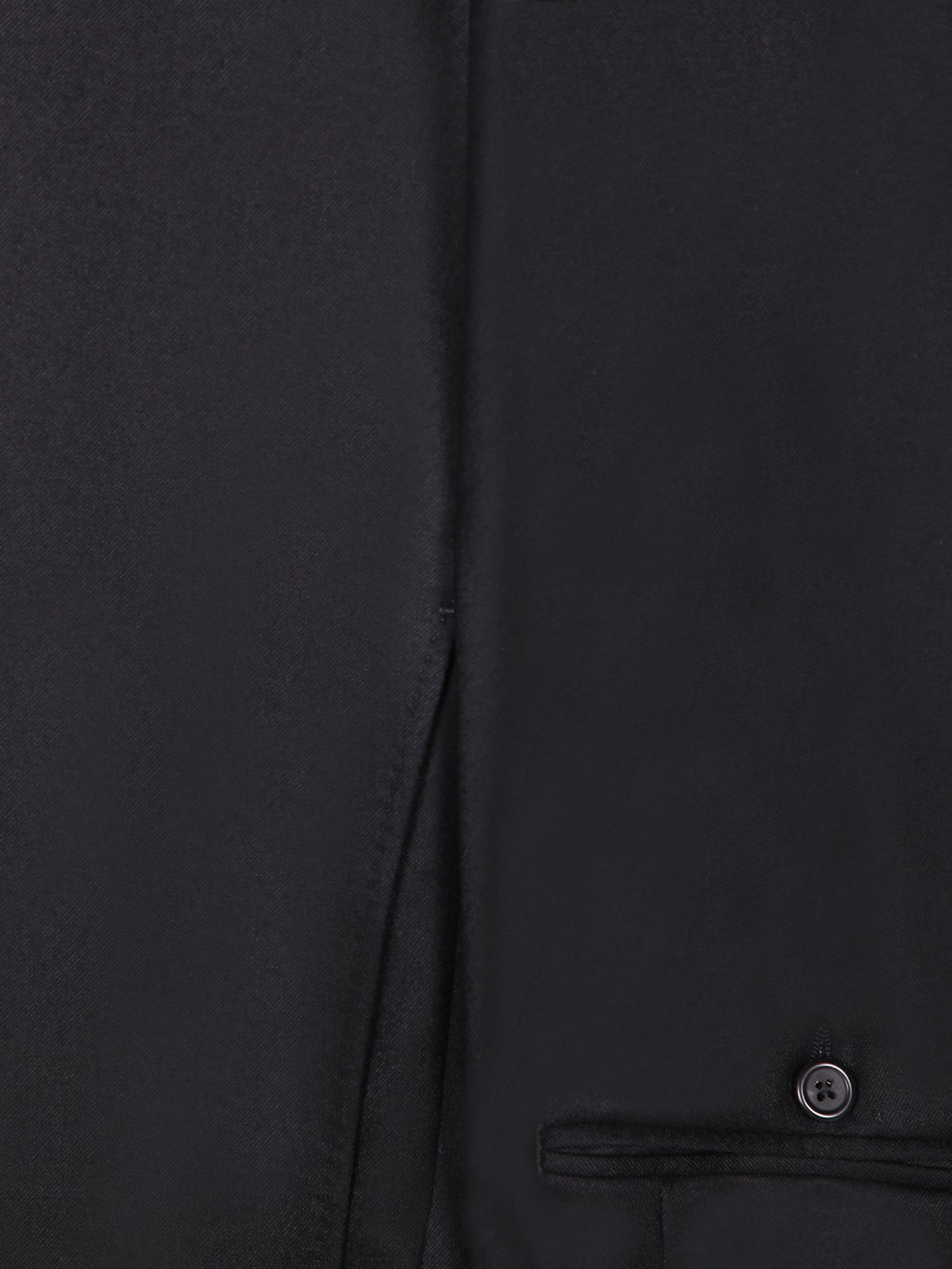 Black flannel suit. Jacket with two-button closure and trousers with front closure.