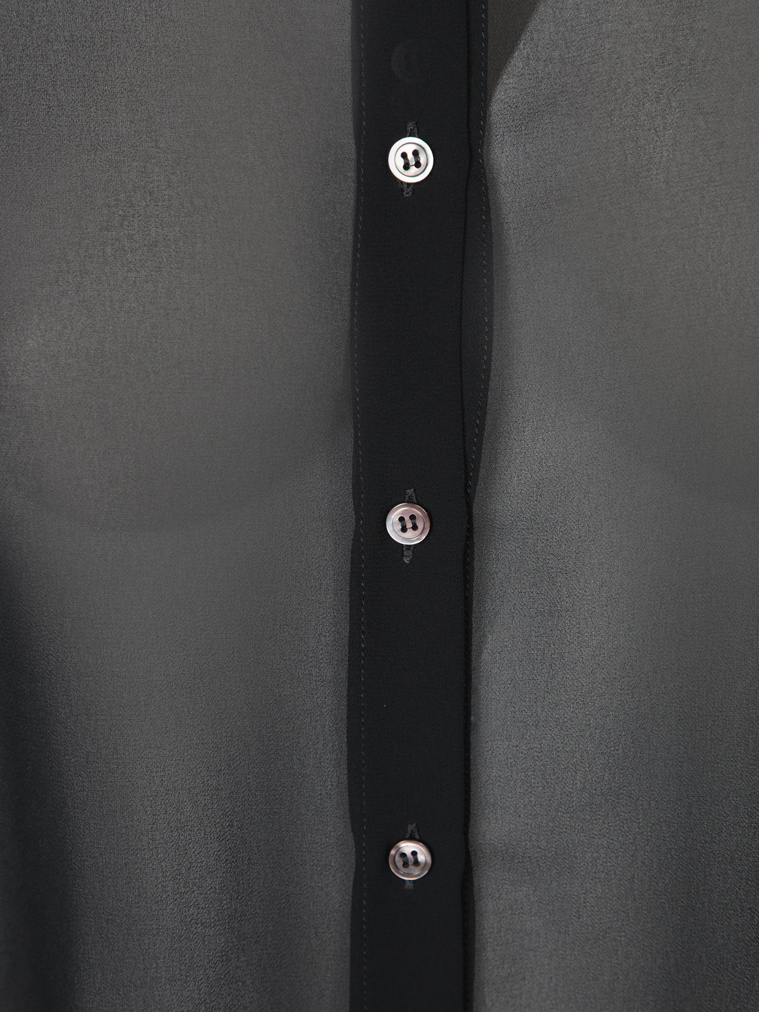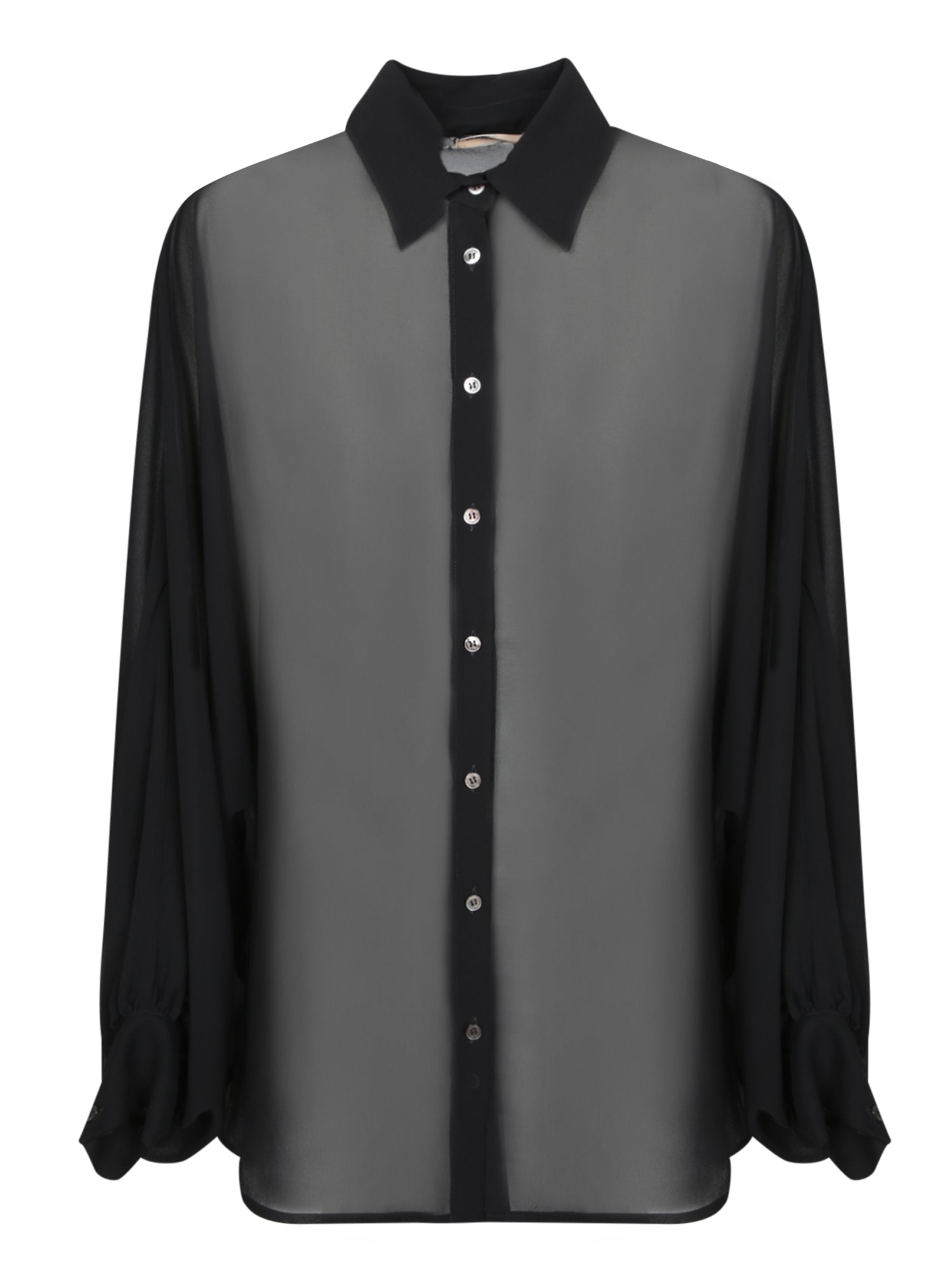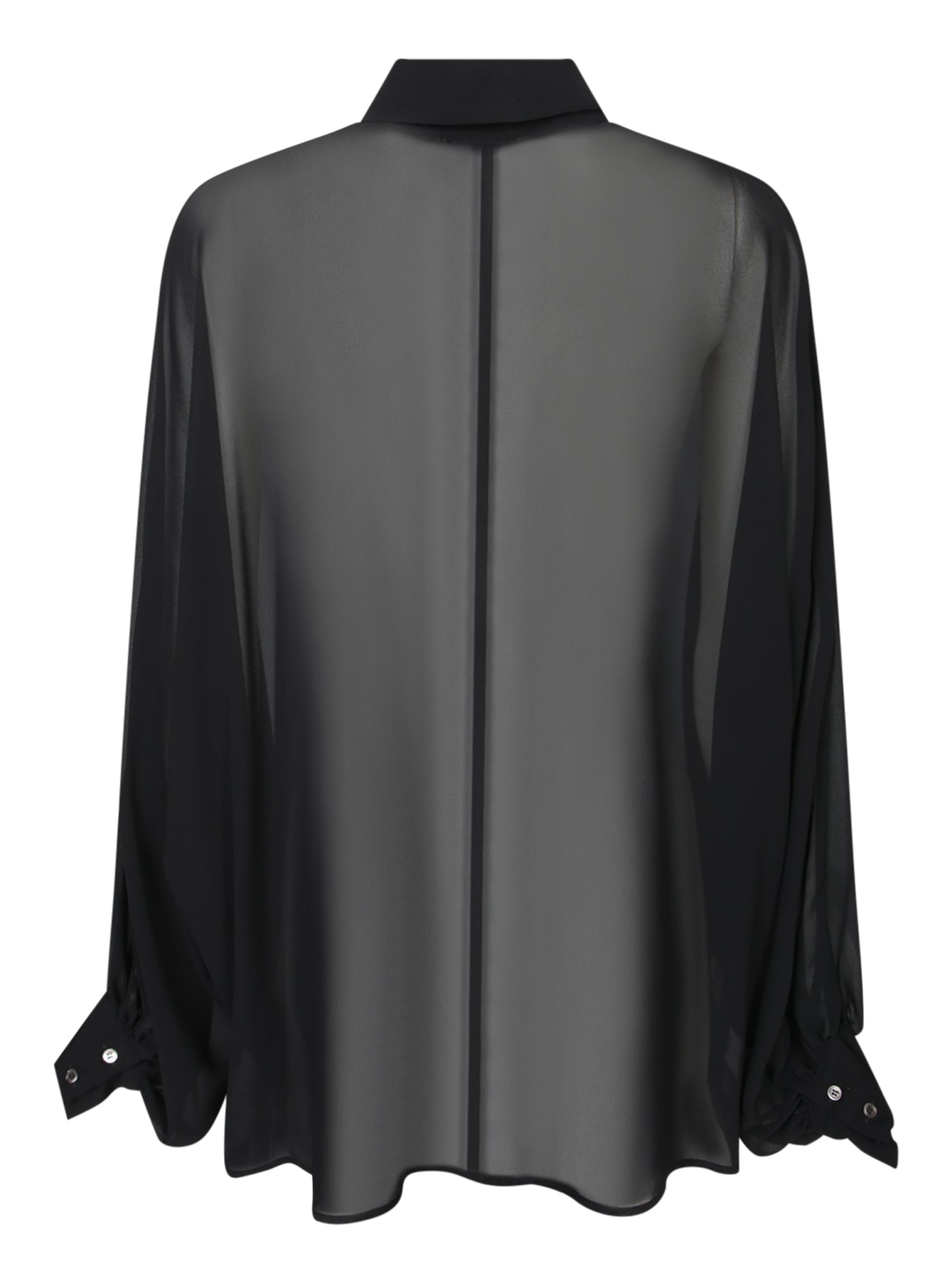 Oversized black georgette shirt with a classic collar and button front closure. Long sleeves with elastic cuffs.