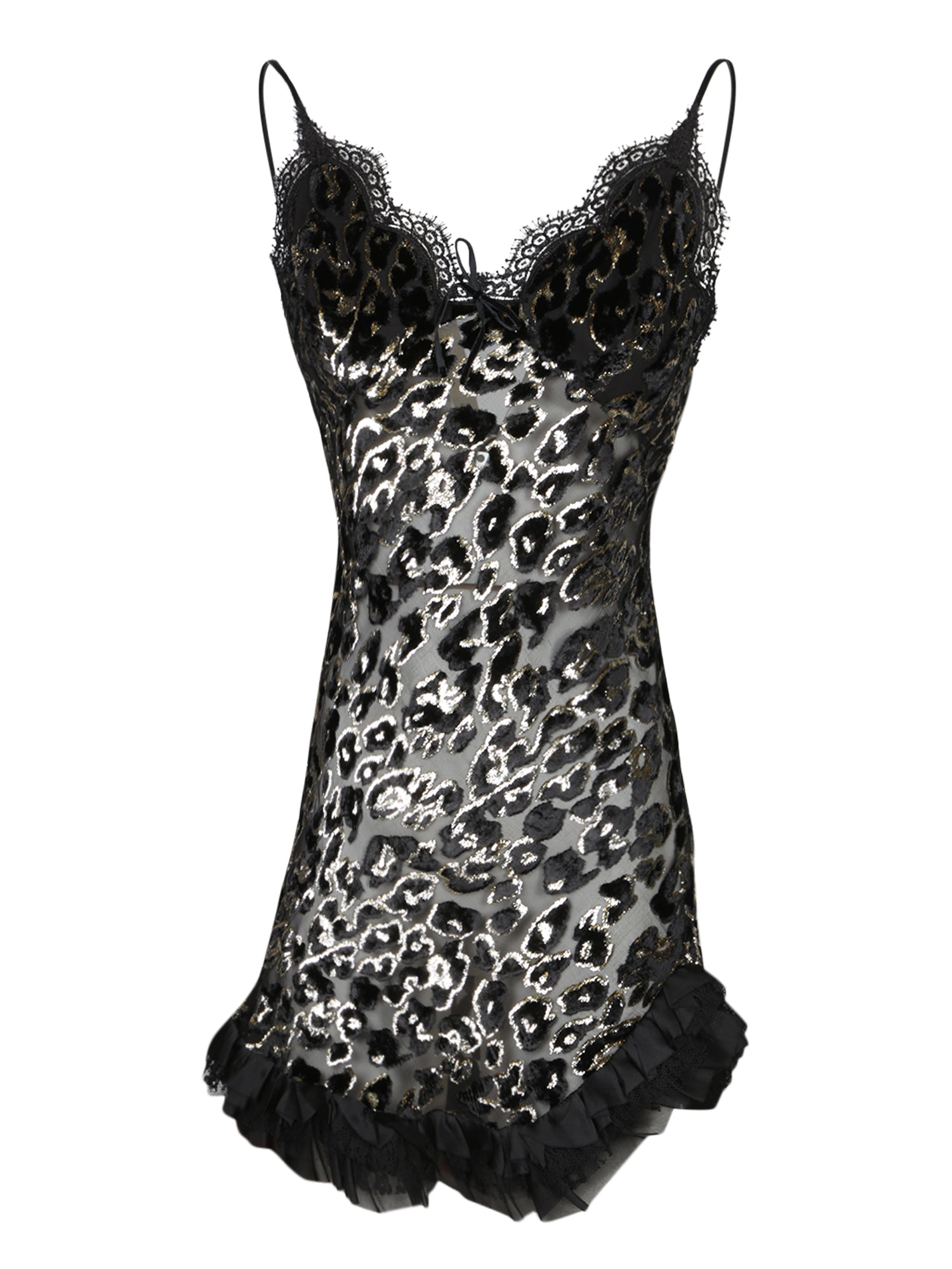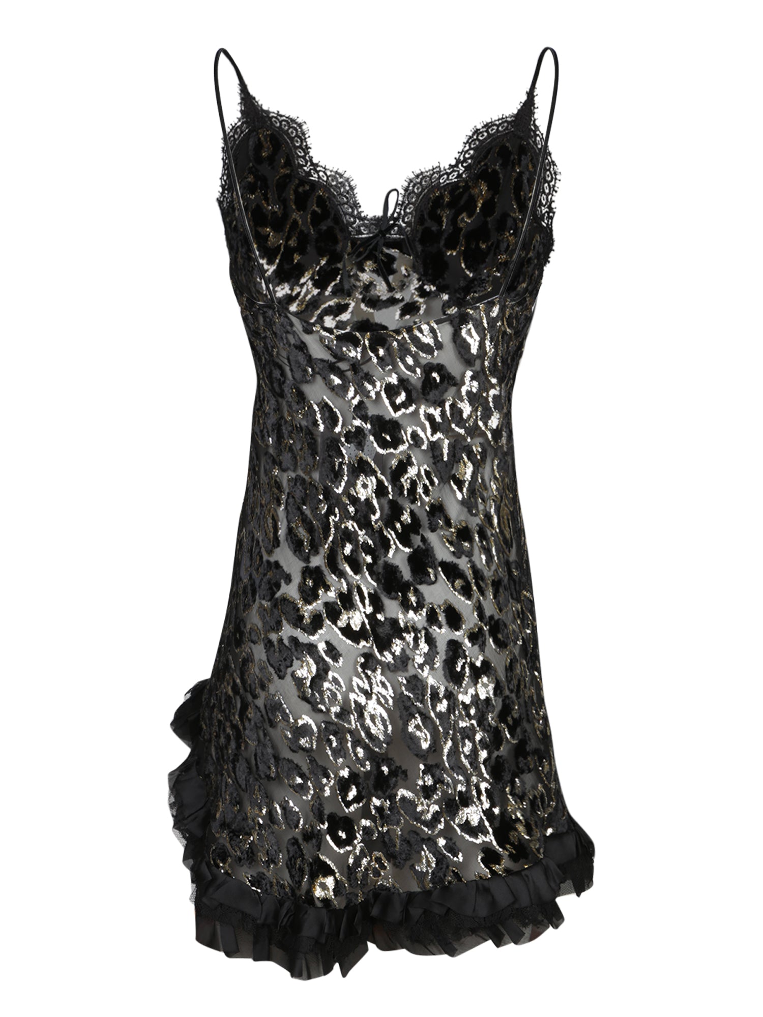 Silk mini dress with black and gold spotted pattern. Delicate lace trimmings. Adjustable thin straps.