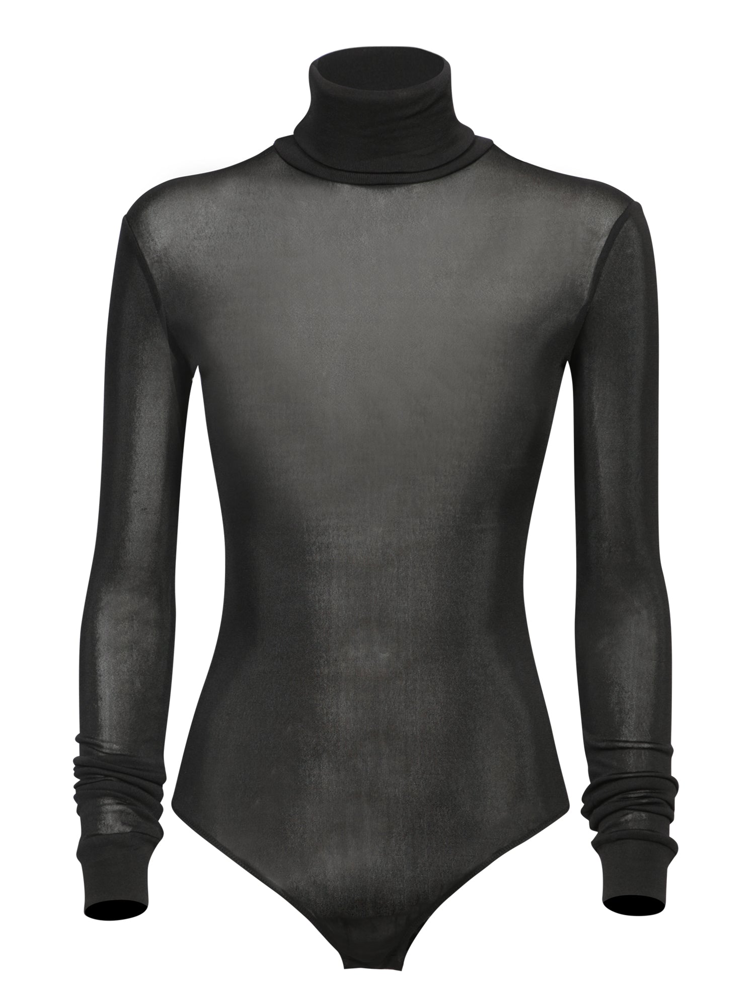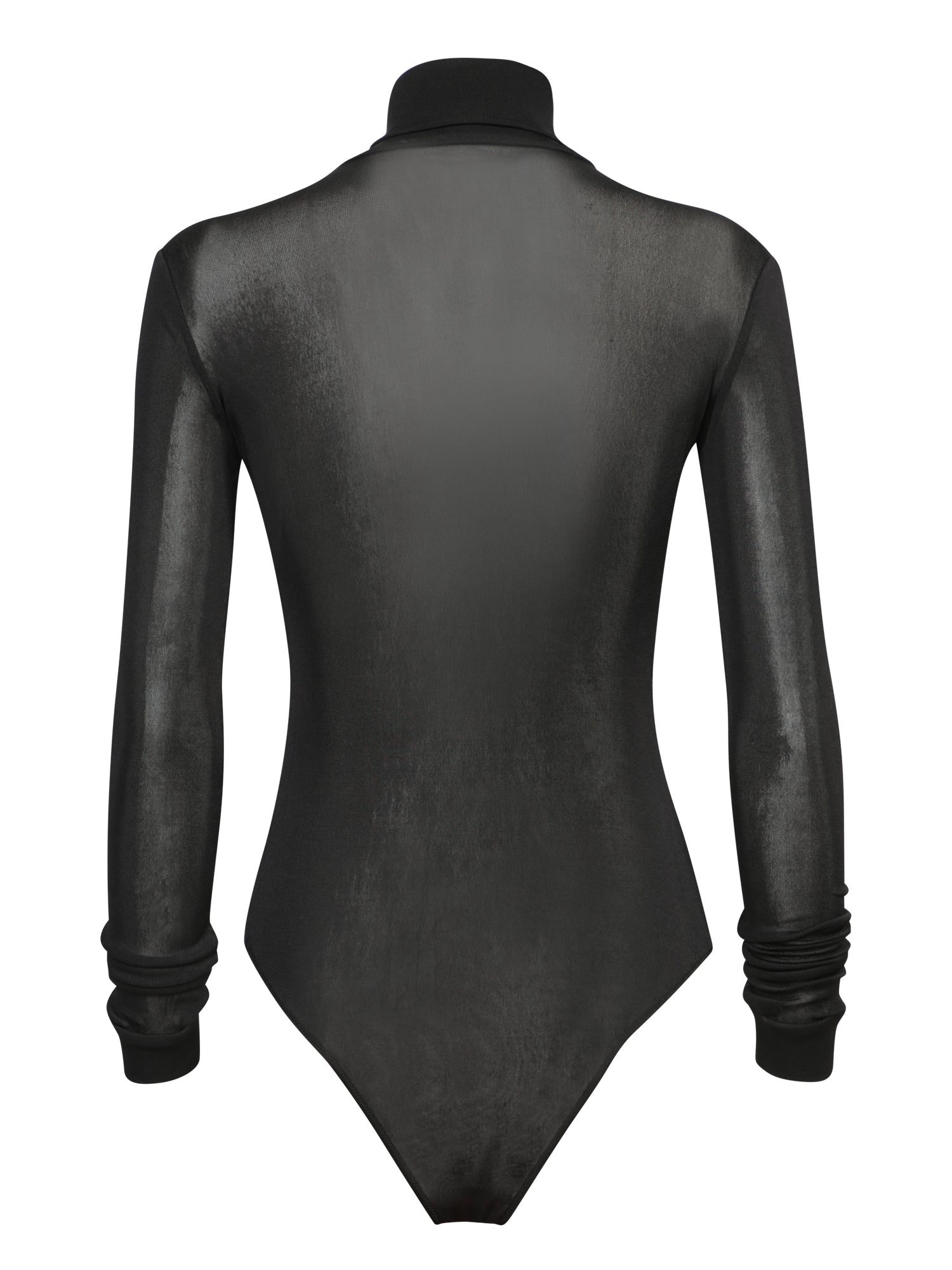 Long sleeve bodysuit with high collar. Pleated details on the sleeves. Stretch fabric.
