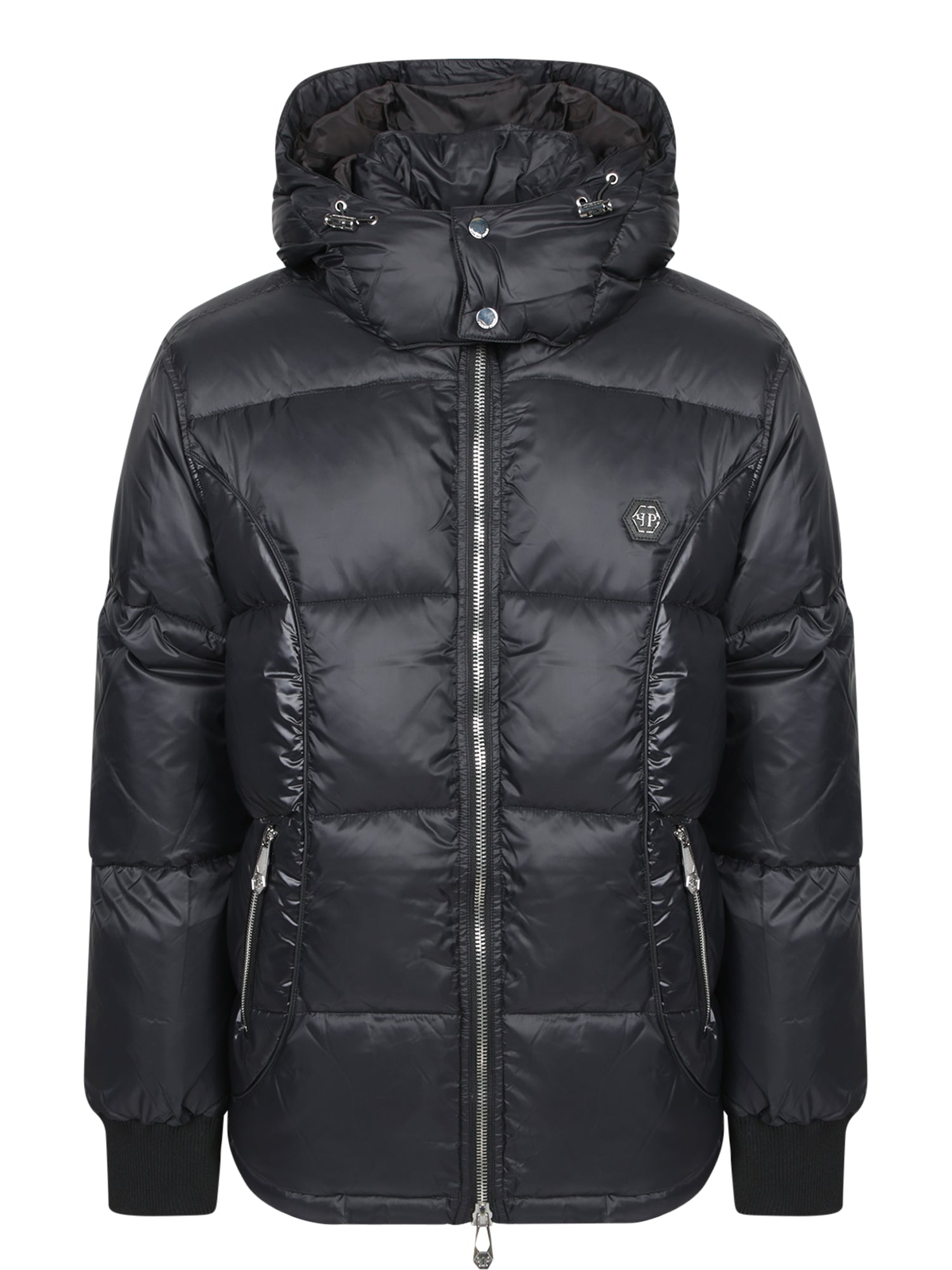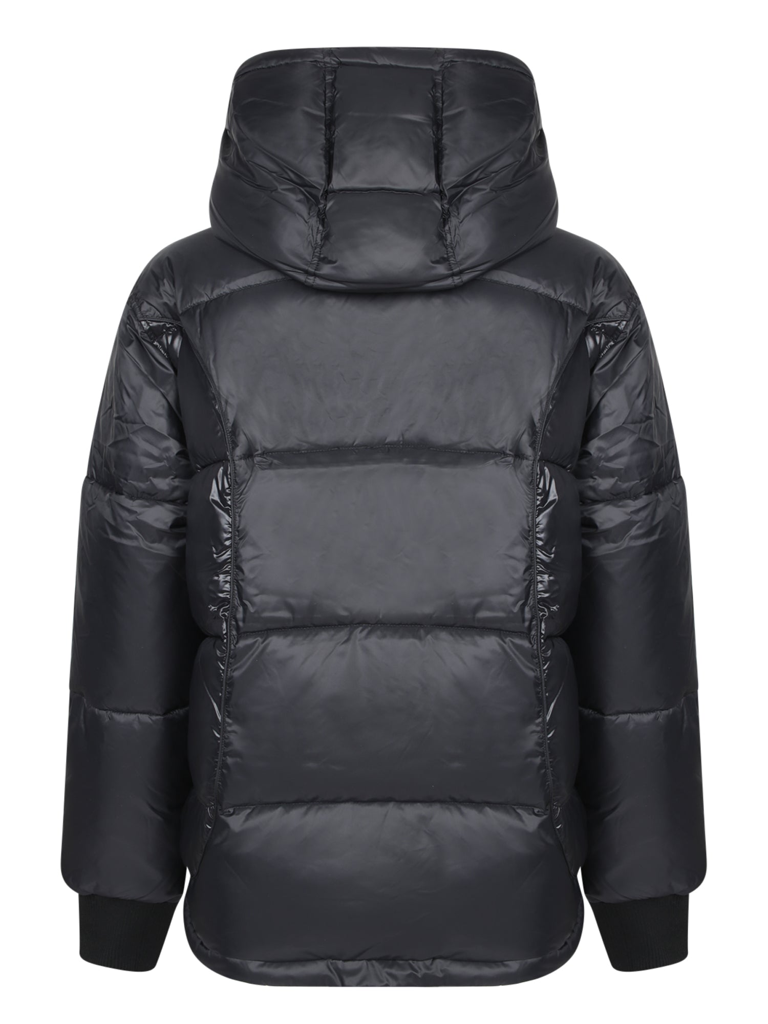 Padded jacket with adjustable hood. Features a front zip closure, side zip pockets, and ribbed knit cuffs.