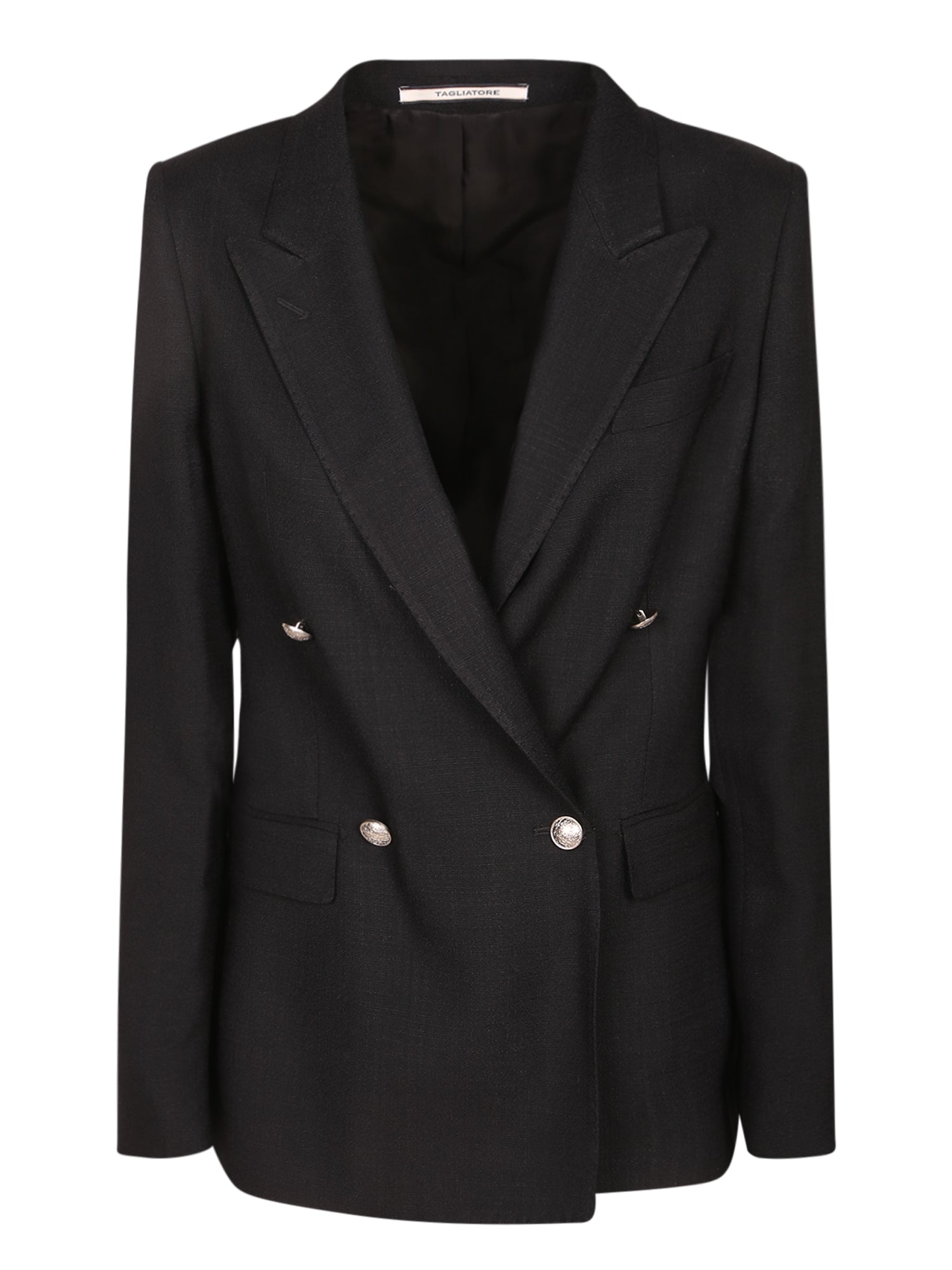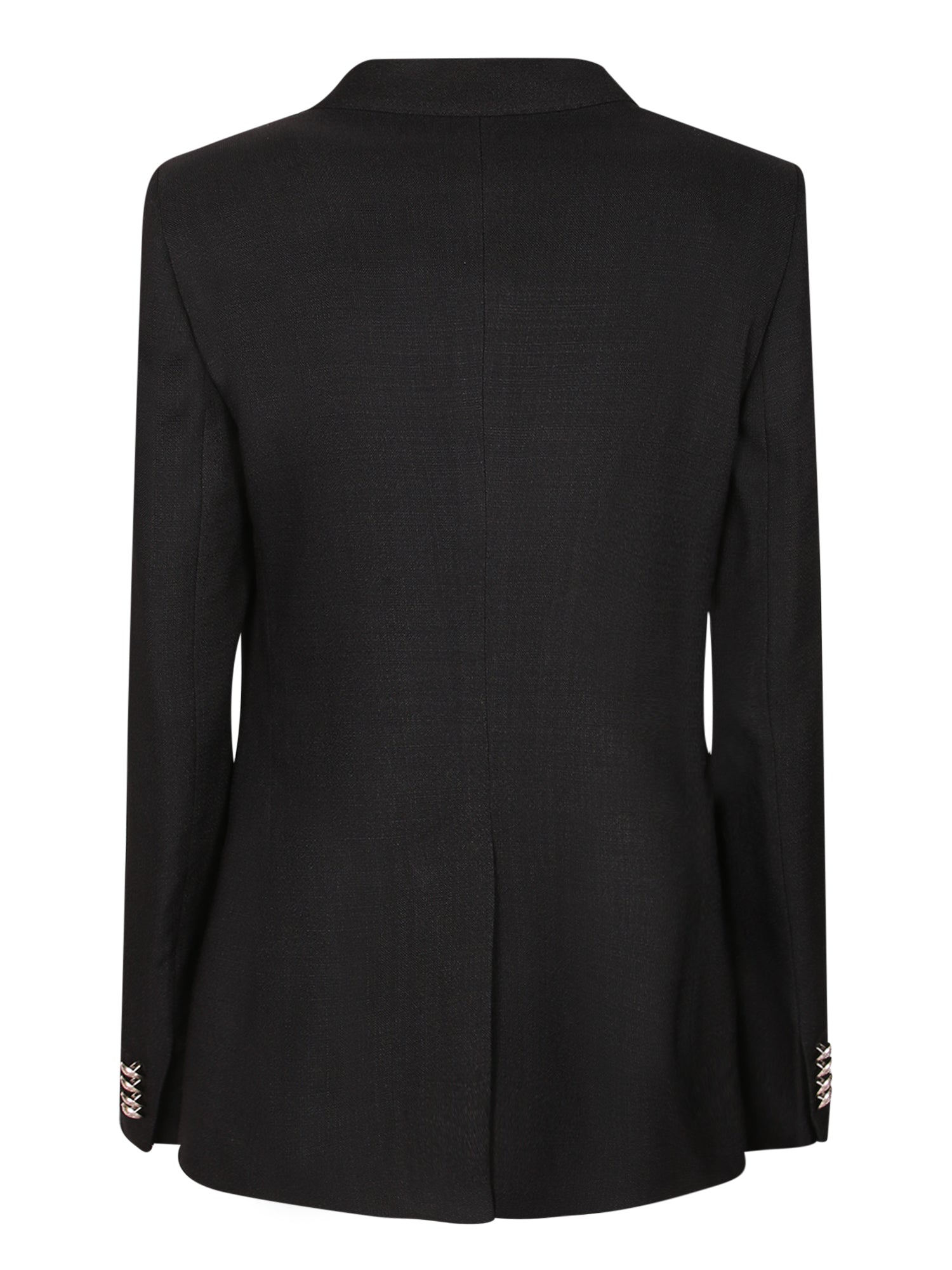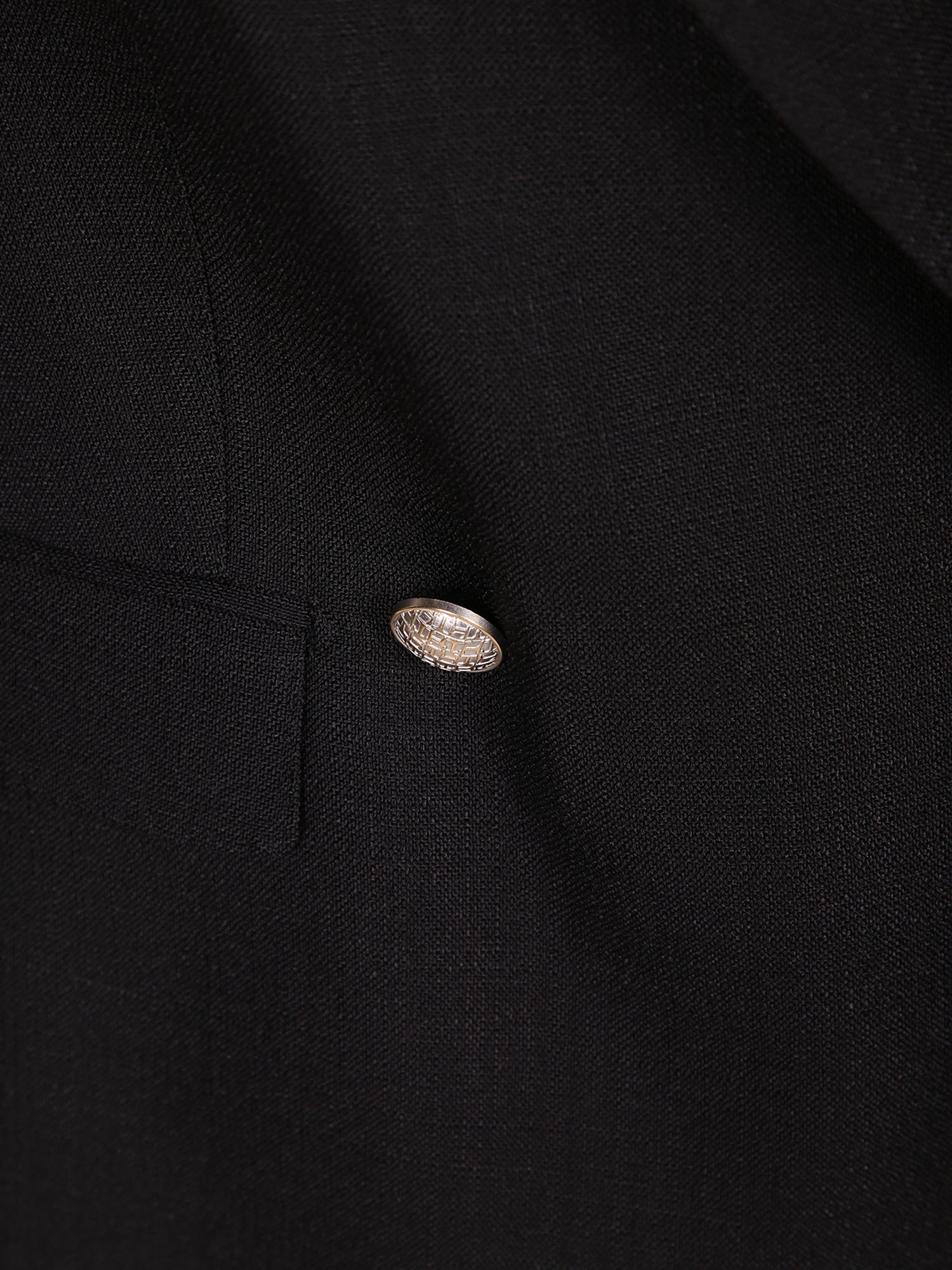 Viscose fabric. Double-breasted cut. Decorative metal buttons.