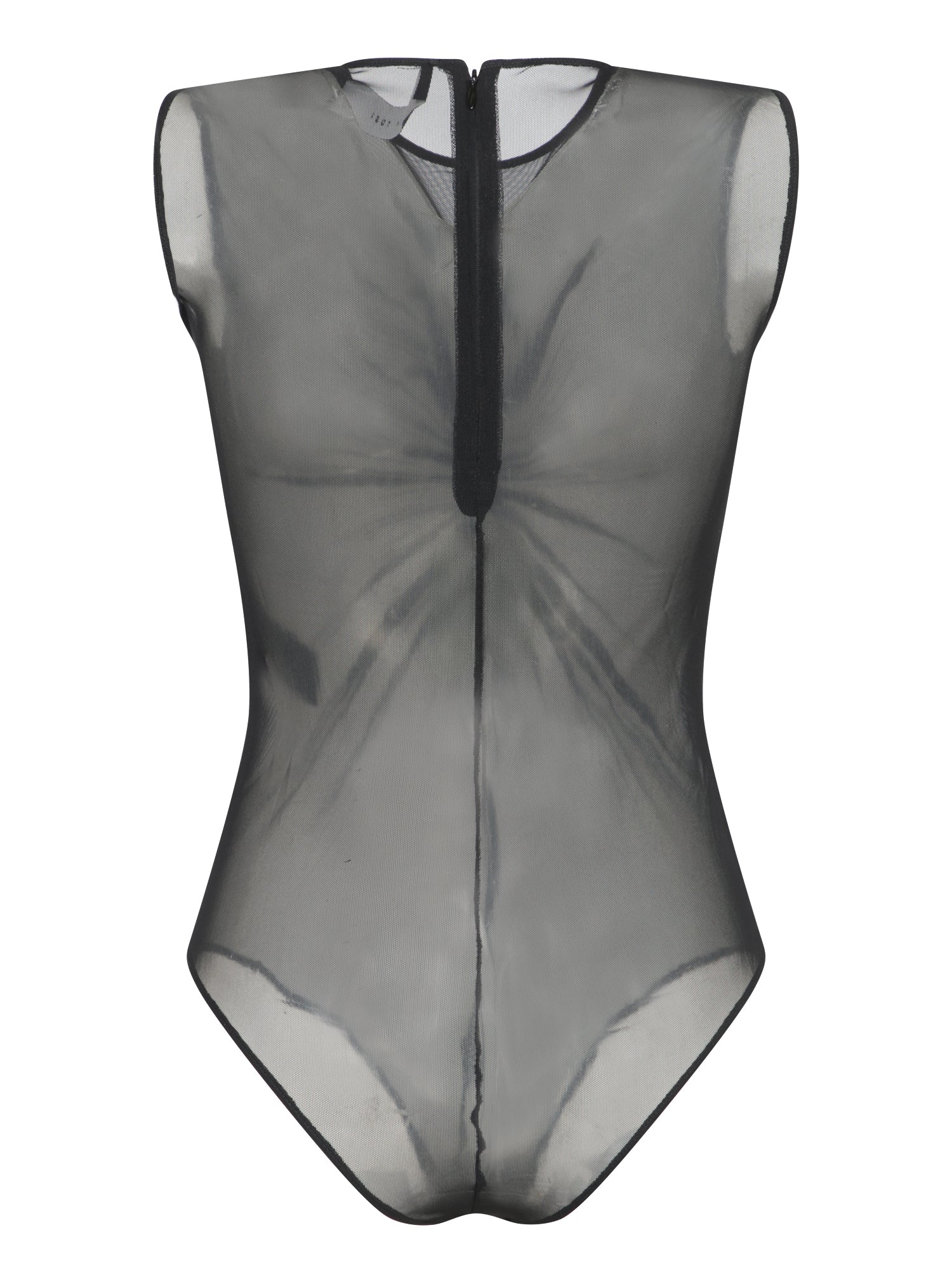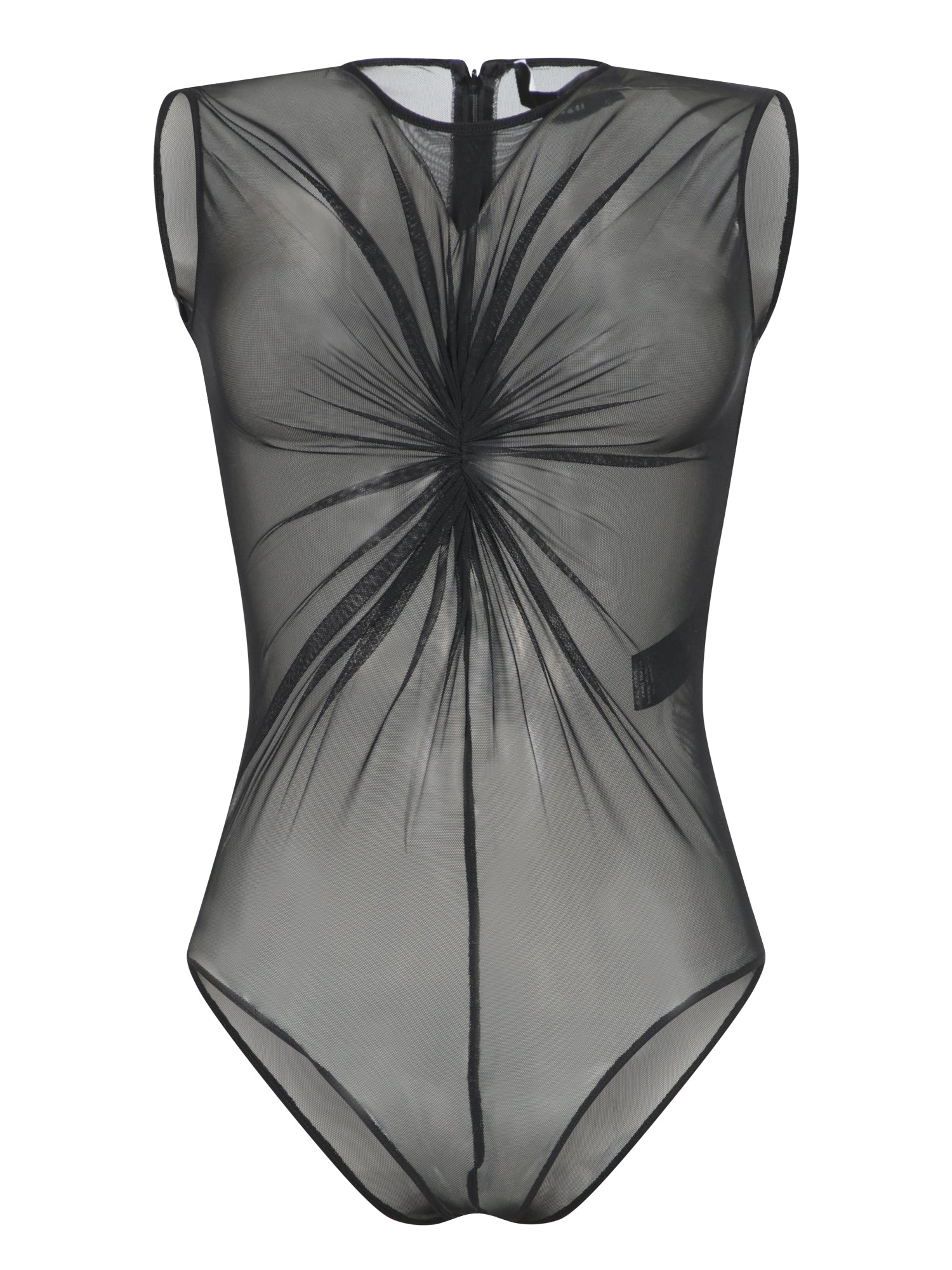 Sheer tulle bodysuit with central knot. Short sleeves. Back zip closure.
