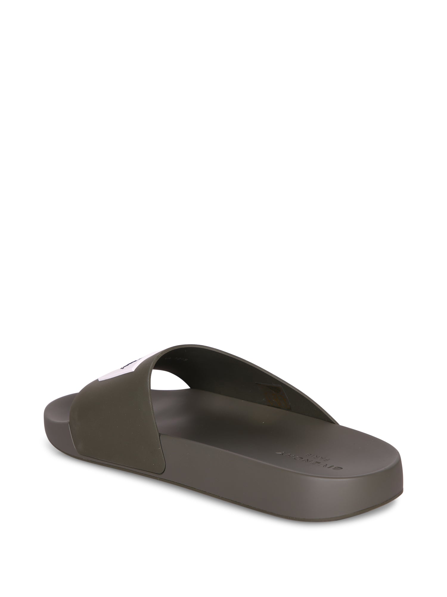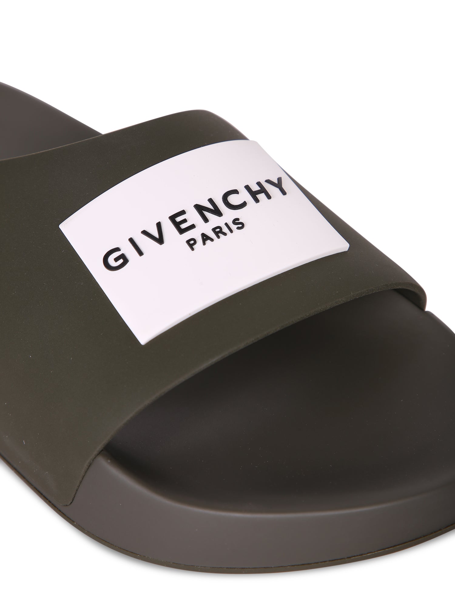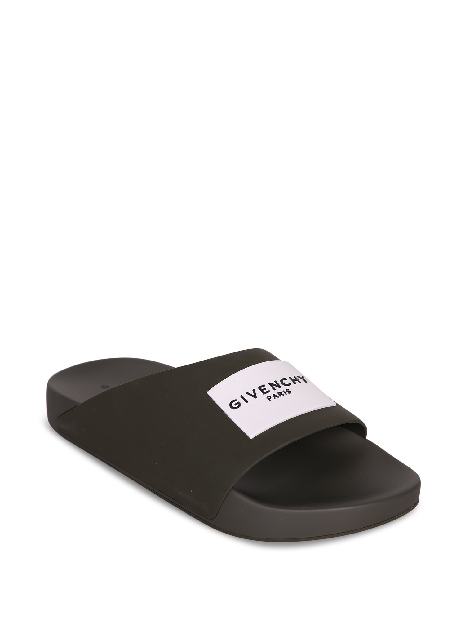Slide model with wide strap. Contrasting Givenchy logo on strap. Rubber sole.