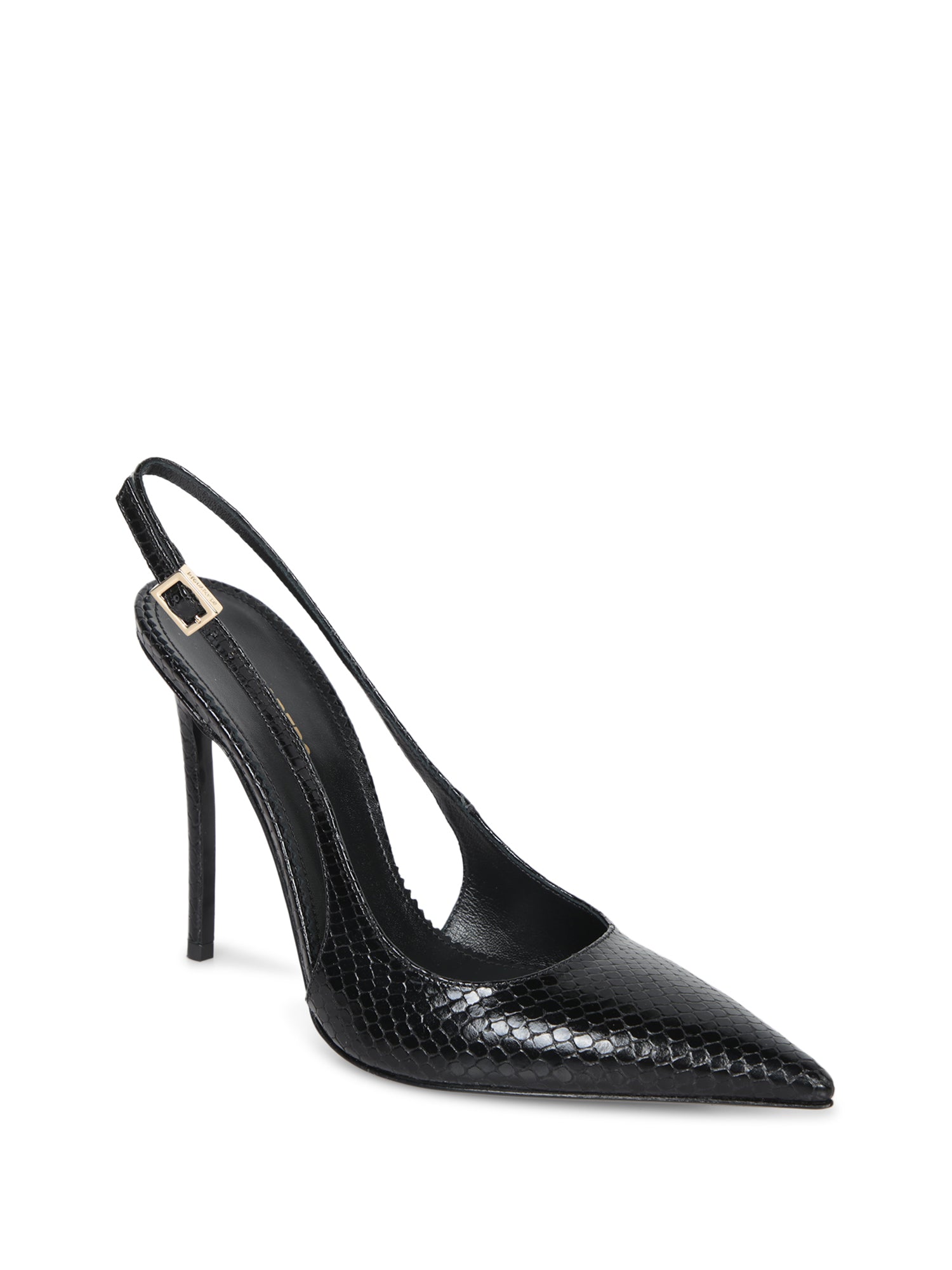 Stiletto heels, laminated leather fabric, ankle strap with decorative buckle.