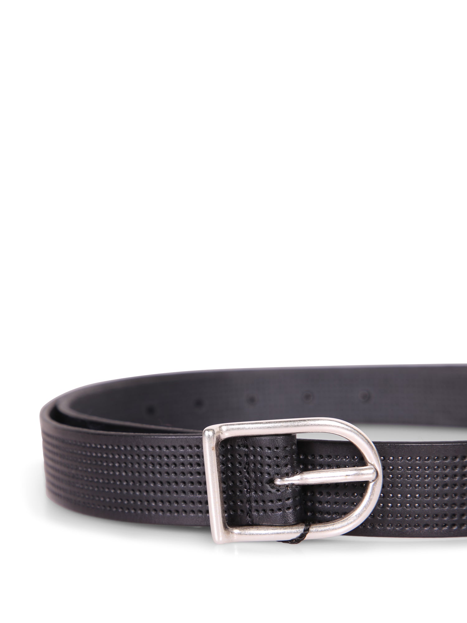 Leather belt. Black color. Shiny silver buckle. Decorative perforation.