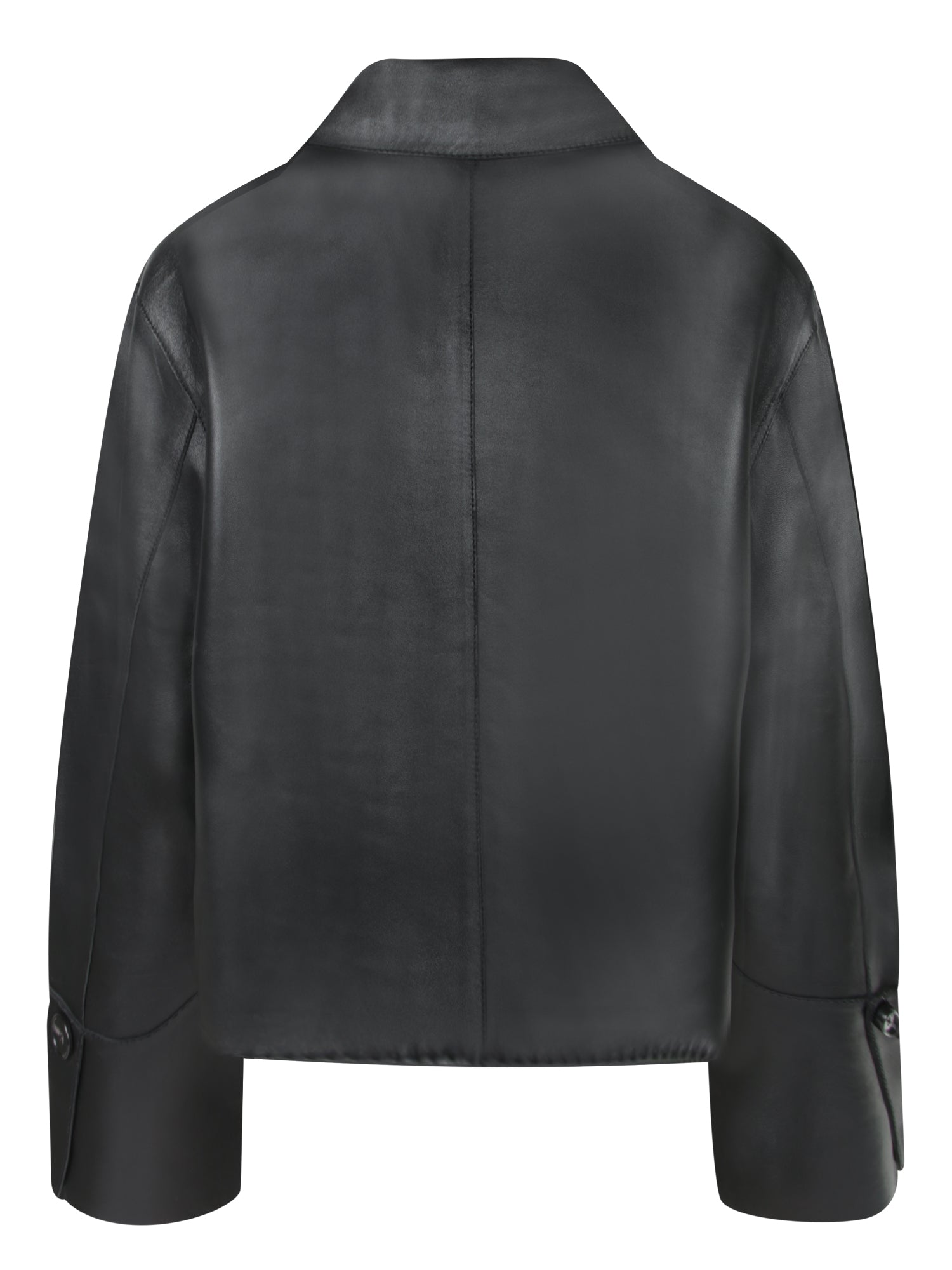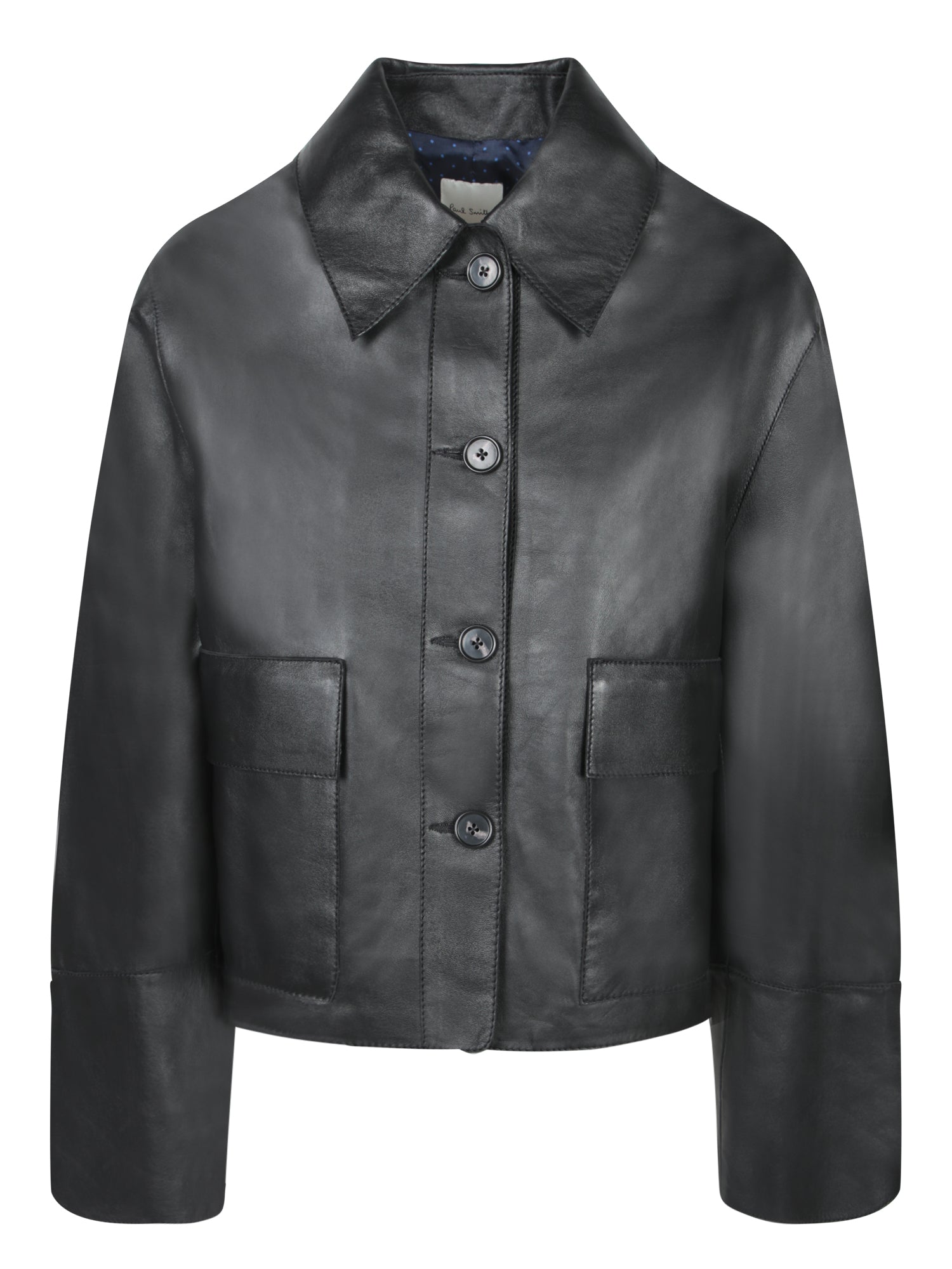 Smooth leather jacket with classic collar. Front button closure. Equipped with patch pockets.