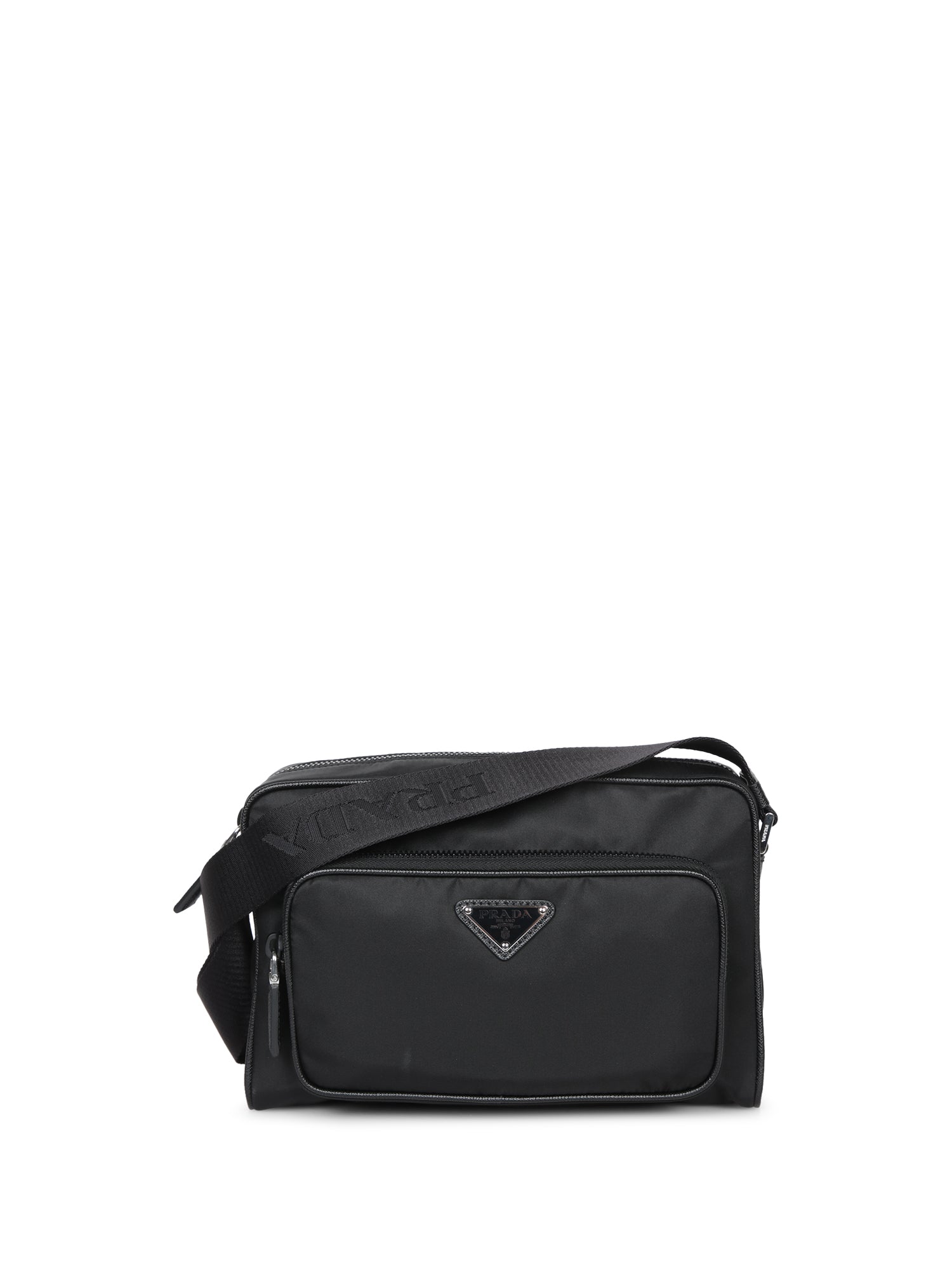 This stylish Prada shoulder bag is crafted in exquisite black leather, highlighted with a signature metallic triangle logo. Perfect for a sophisticated everyday look.