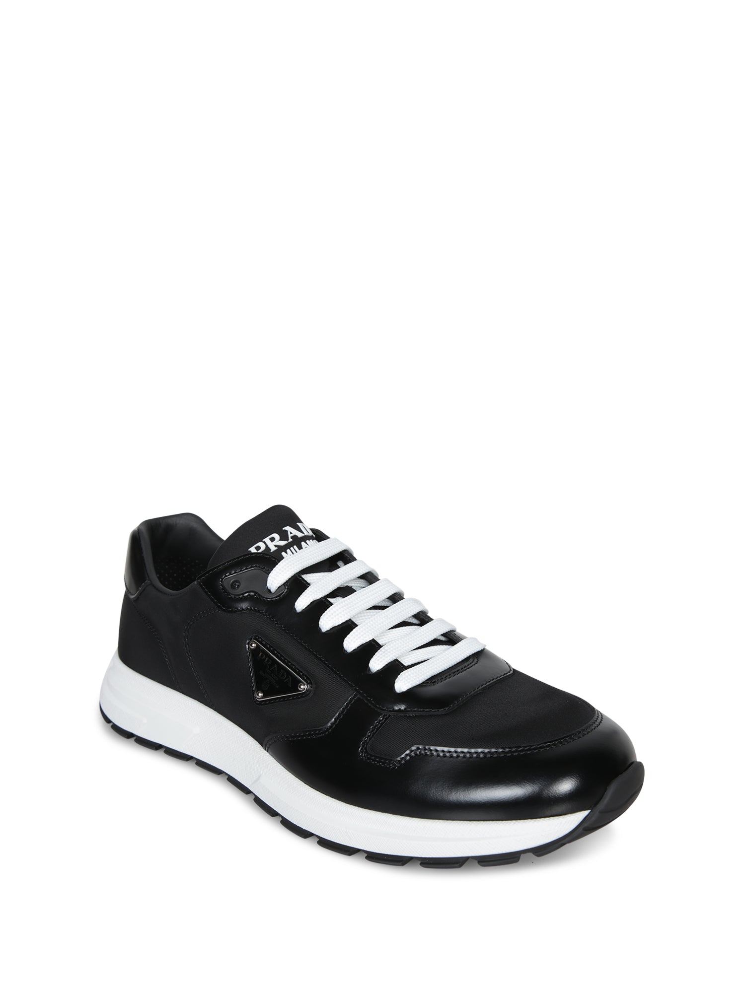 Defined by a refined and sporty aesthetic, these Prada sneakers blend smooth black leather with distinctive metallic details. The classic design is enhanced with a contemporary touch through its lightweight and dynamic sole.