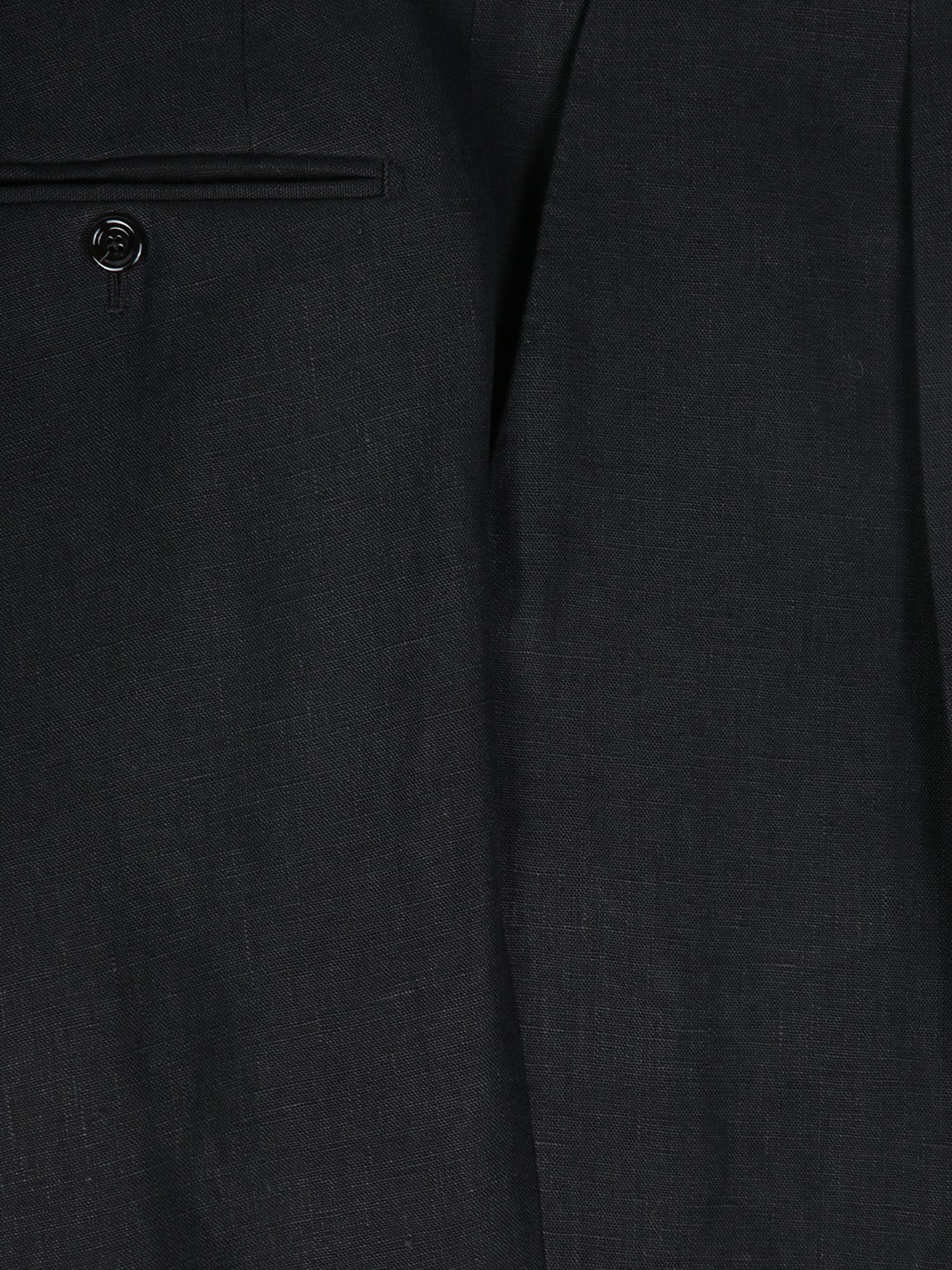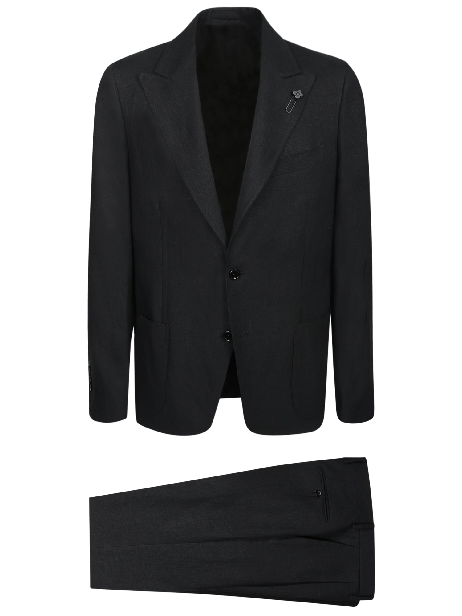 Black linen suit with a two-button jacket and classic cut trousers. Tailored finishes and decorative boutonnière on the lapel.
