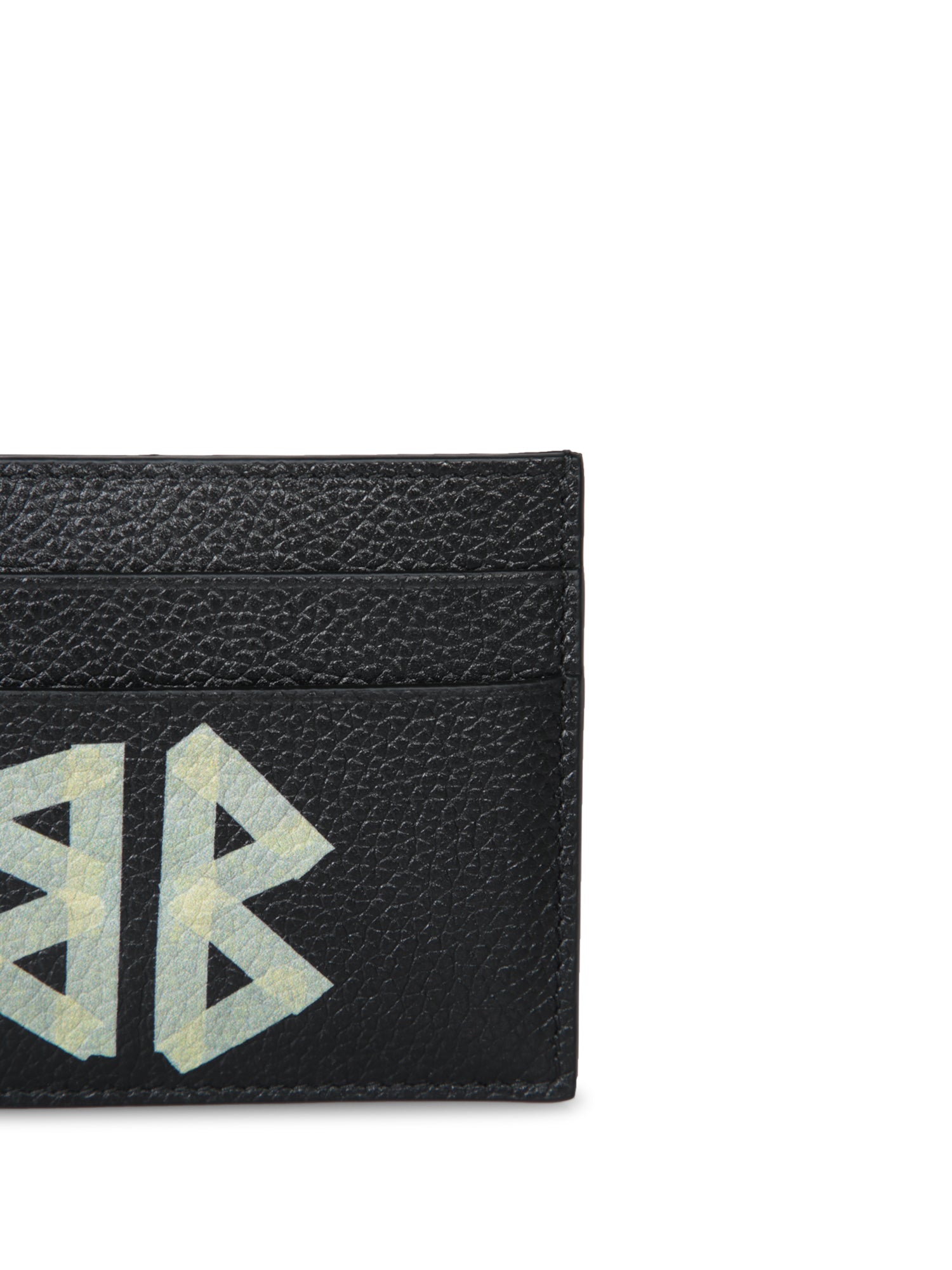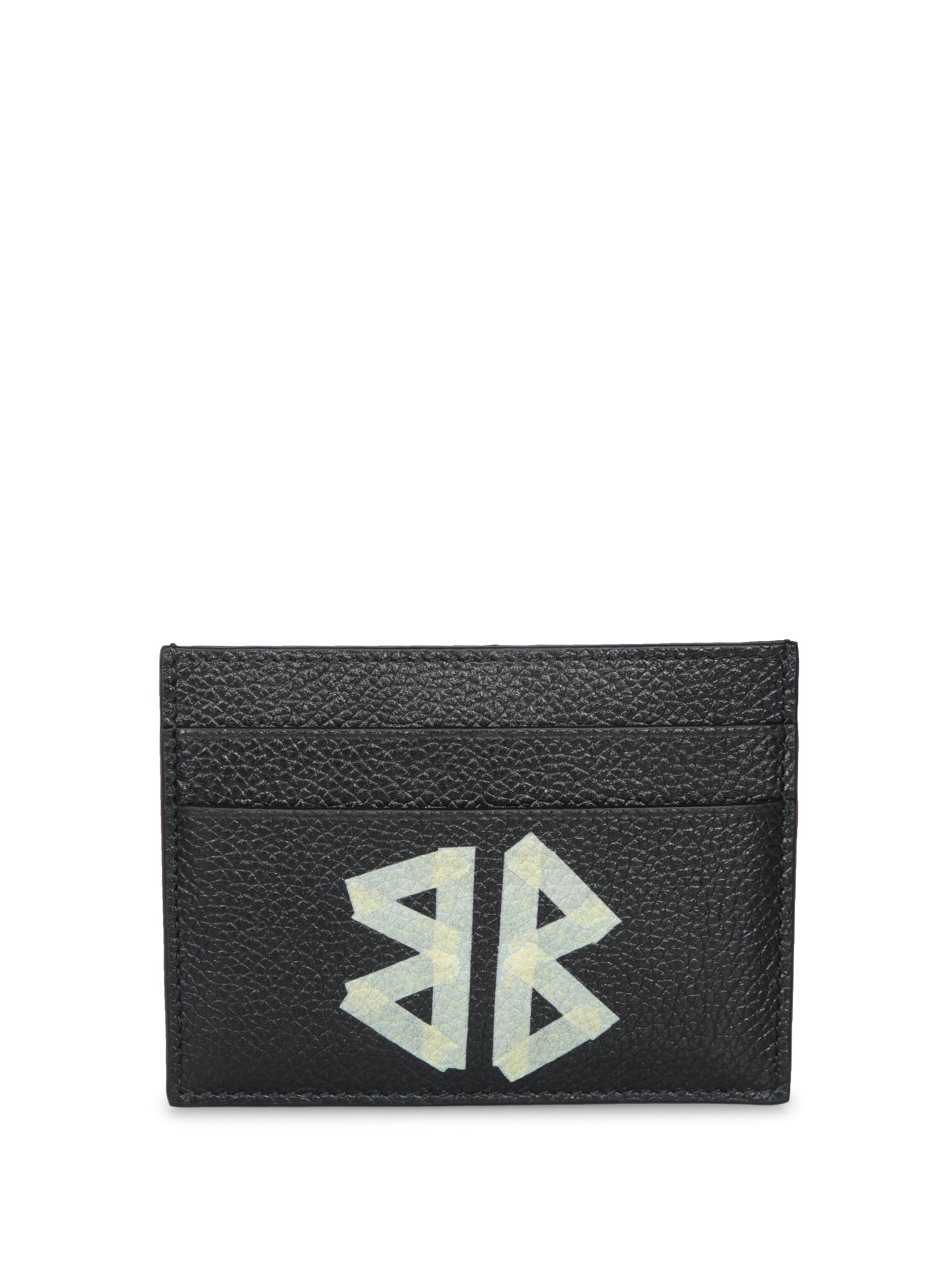 Elegant Balenciaga black leather cardholder, featuring an iconic light green embossed BB logo for a distinctive touch. Compact and functional design.
