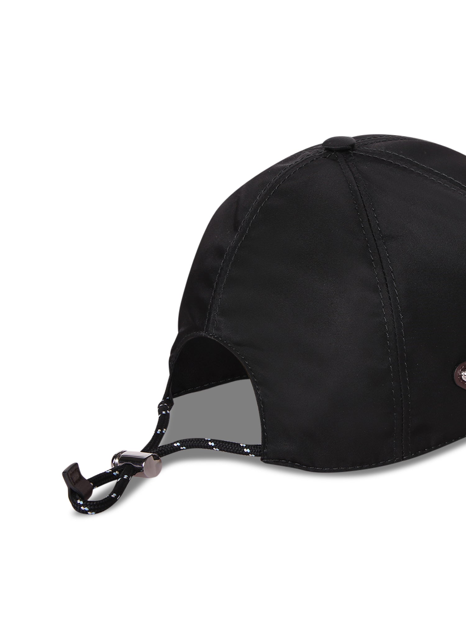 Black nylon hat. Stiff brim with brown leather trim. Adjustable strap at the back.