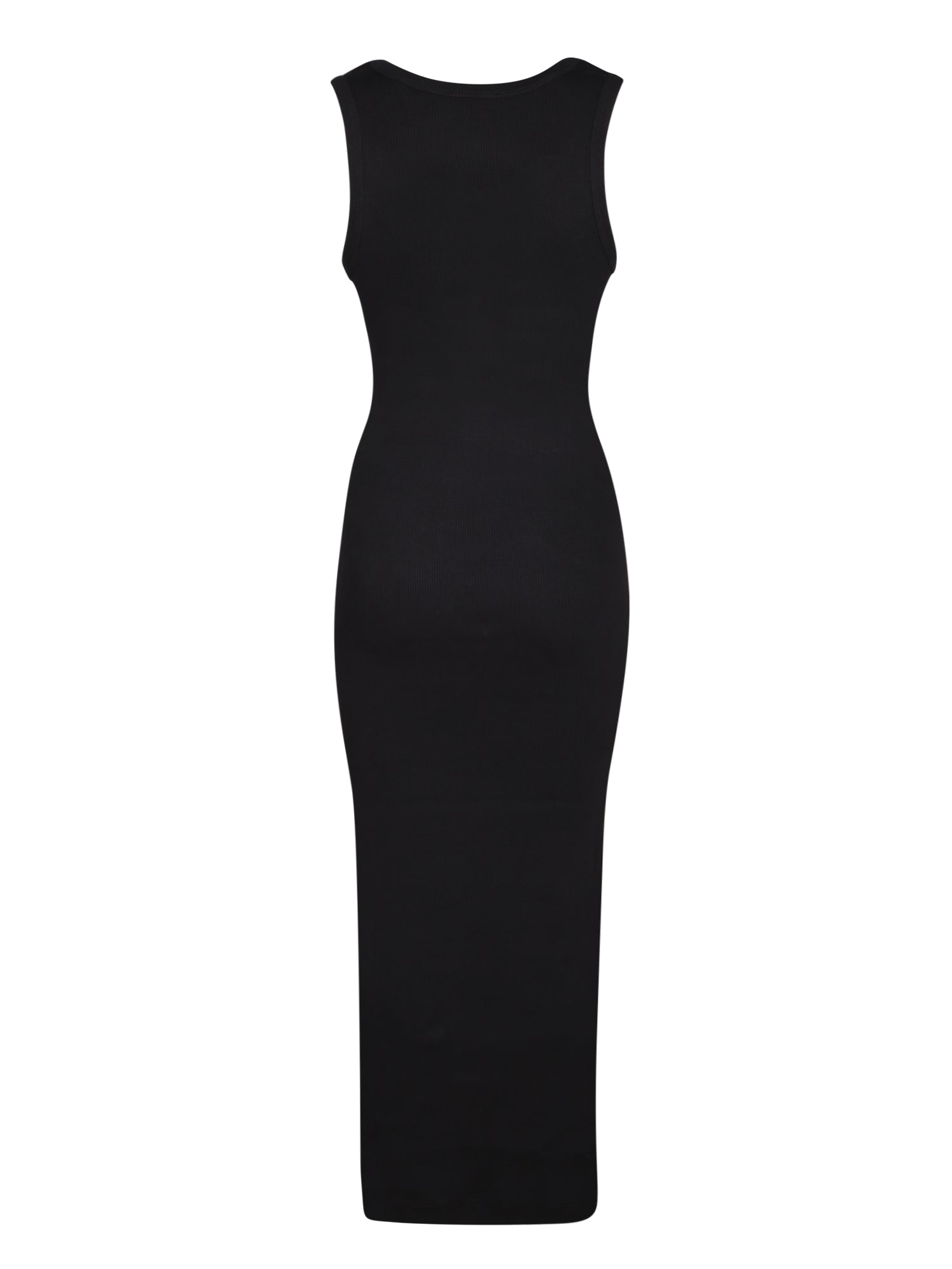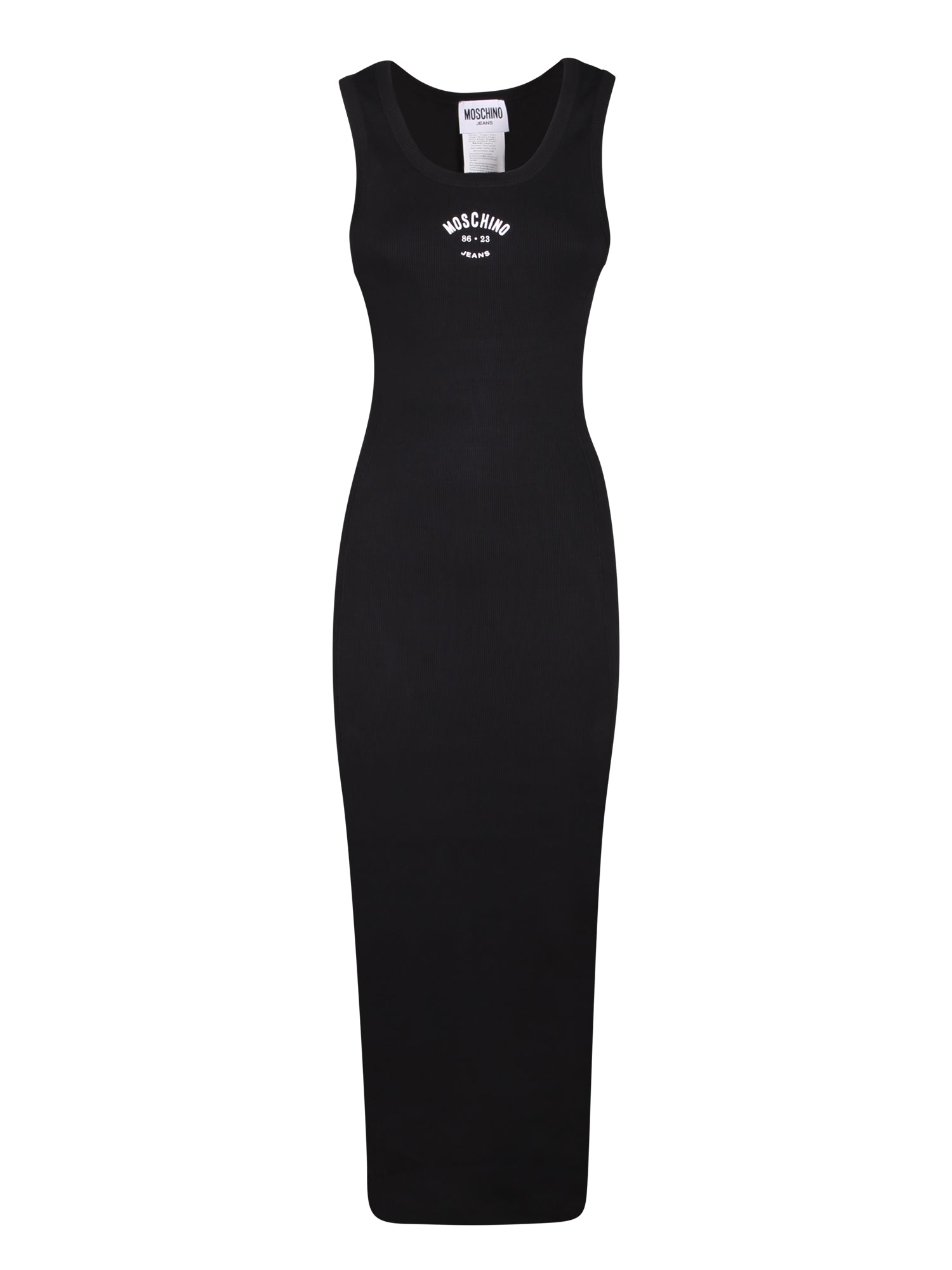 Sleeveless midi dress. Moschino logo on the chest. Fitted design.