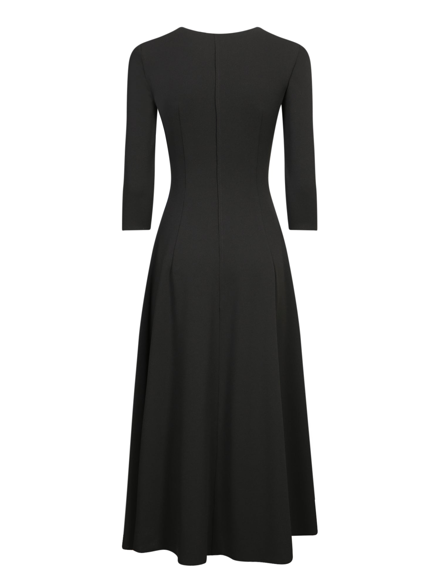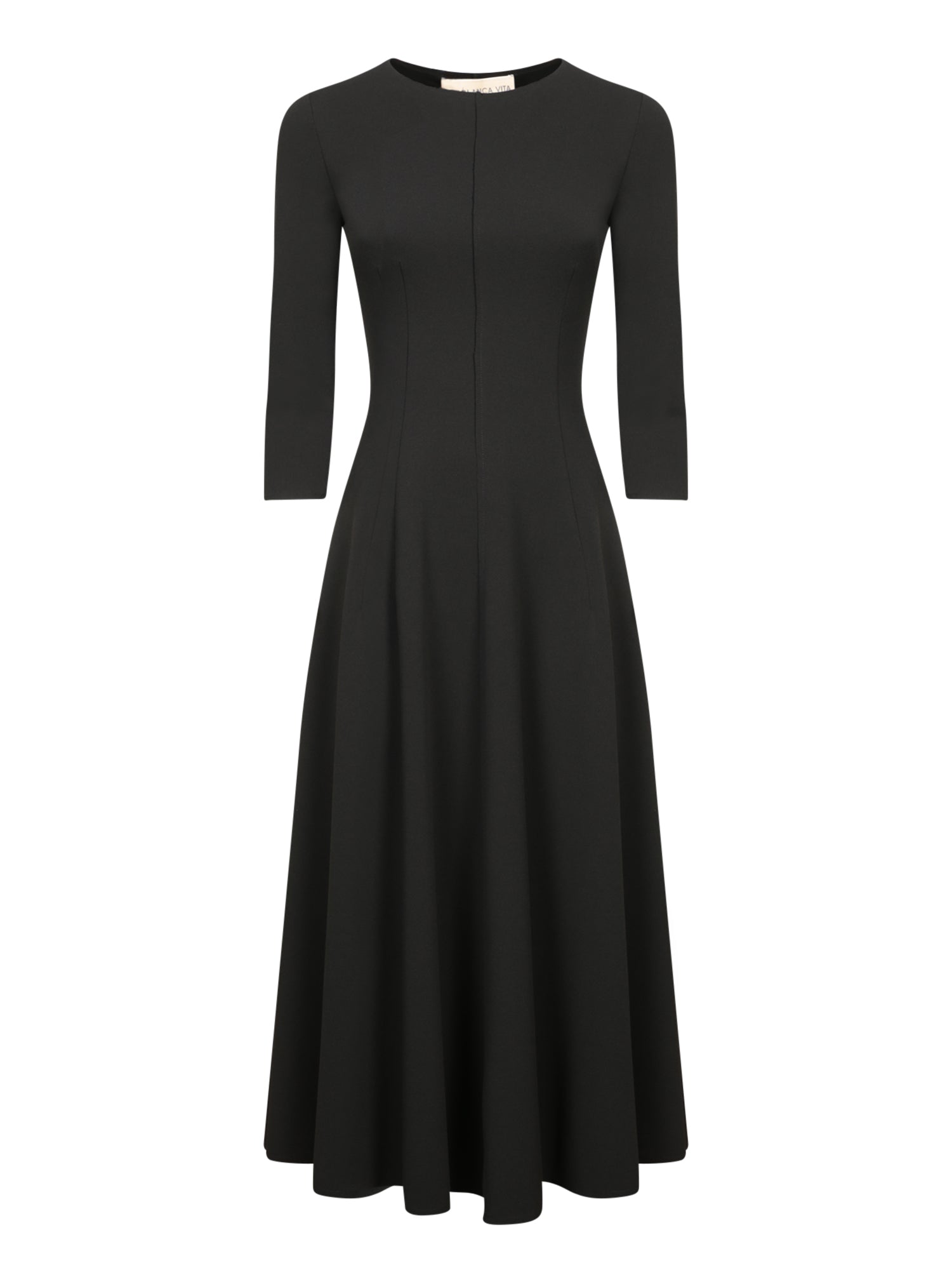 Long-sleeve dress, round neckline, paneled structure, hidden back zipper closure.