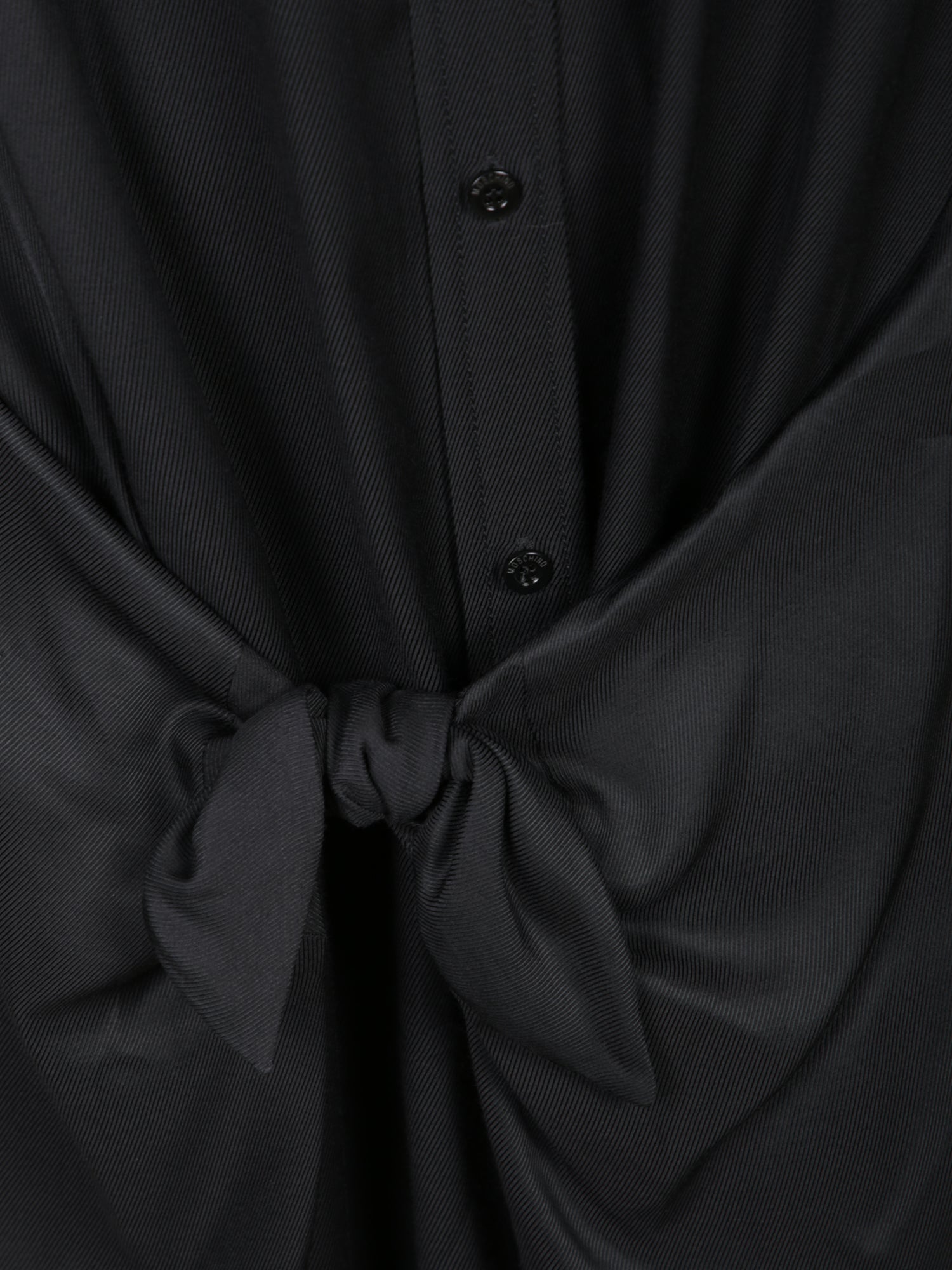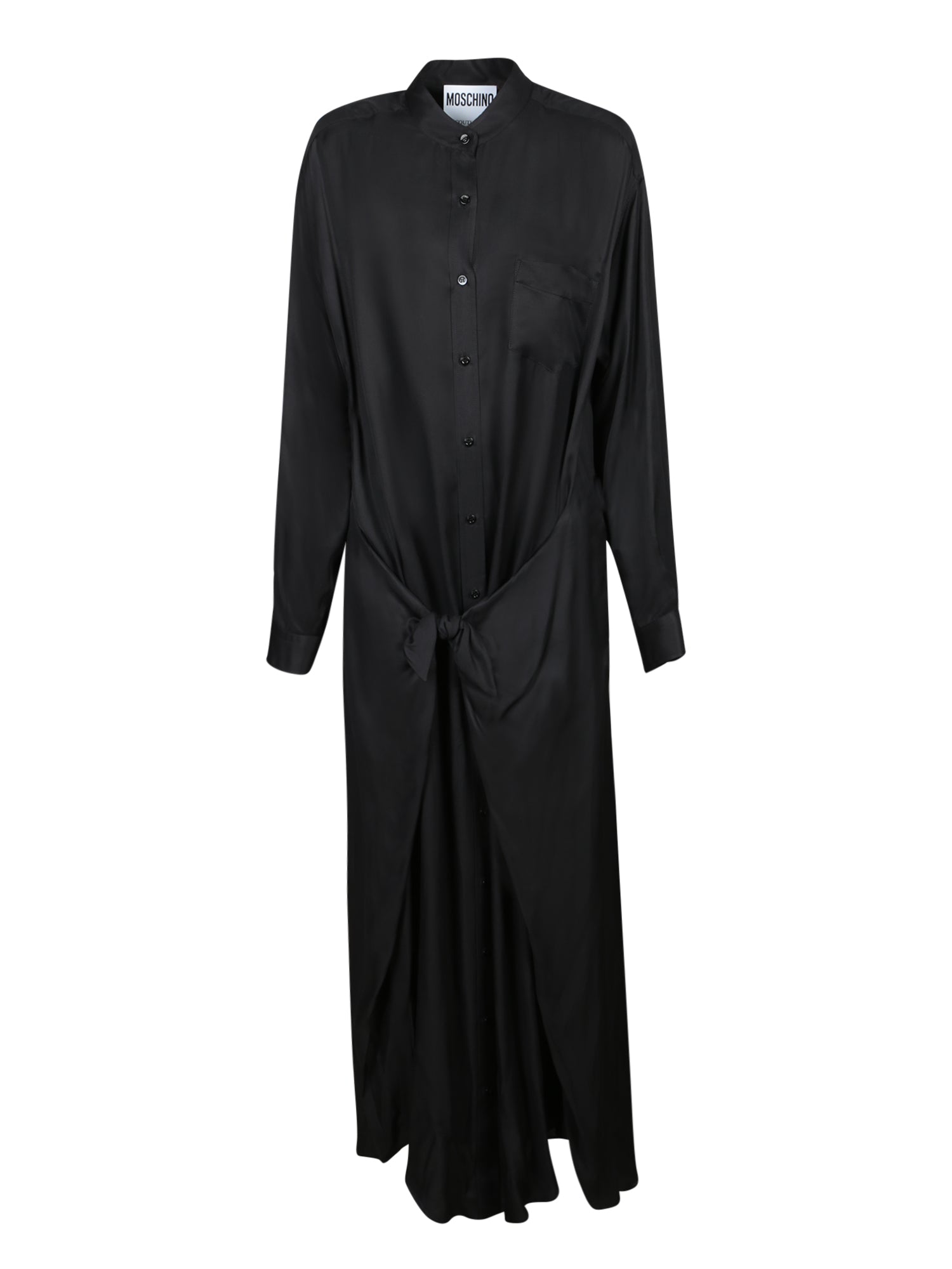 This Moschino black viscose twill dress is marked by its linear and sophisticated elegance. A minimalist design enhanced by a knotted belt that accentuates the silhouette.