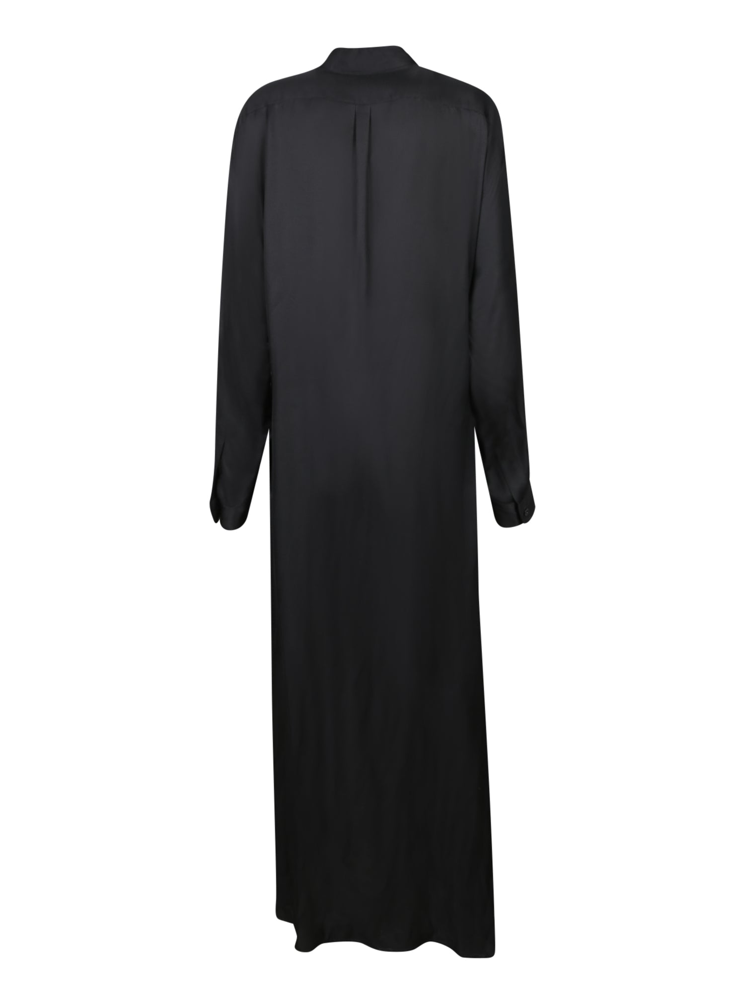Long dress with long sleeves, front button closure and chest patch pocket.