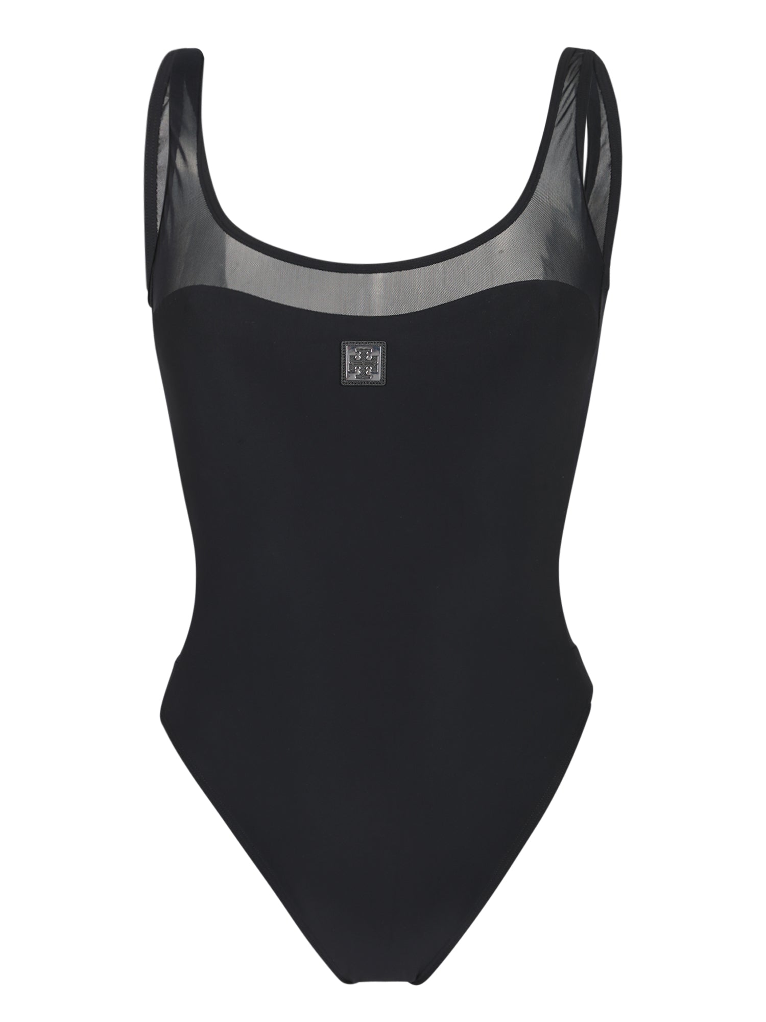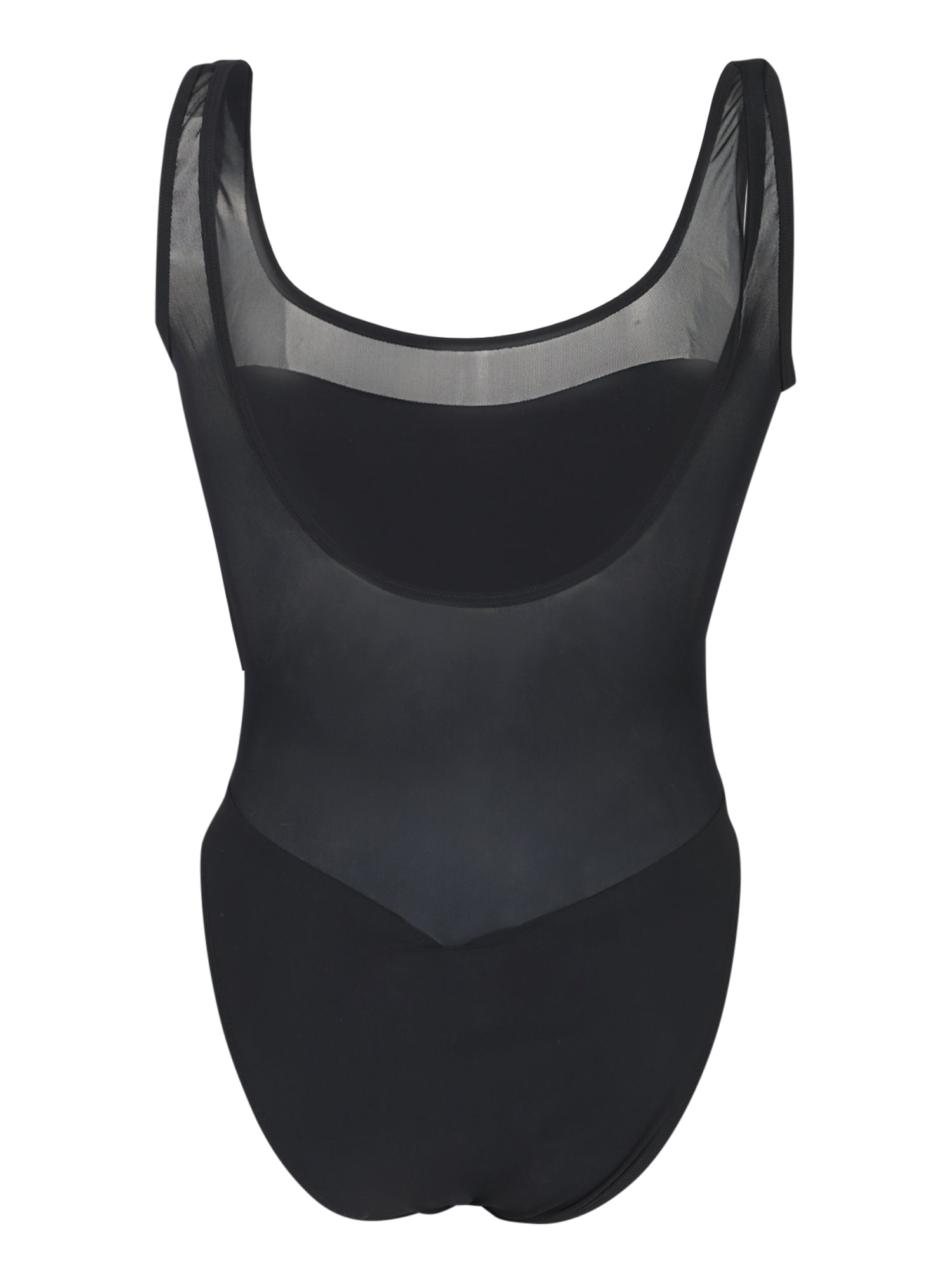 Black swimsuit with mesh inserts. Square logo detail at center. Sleeveless design.