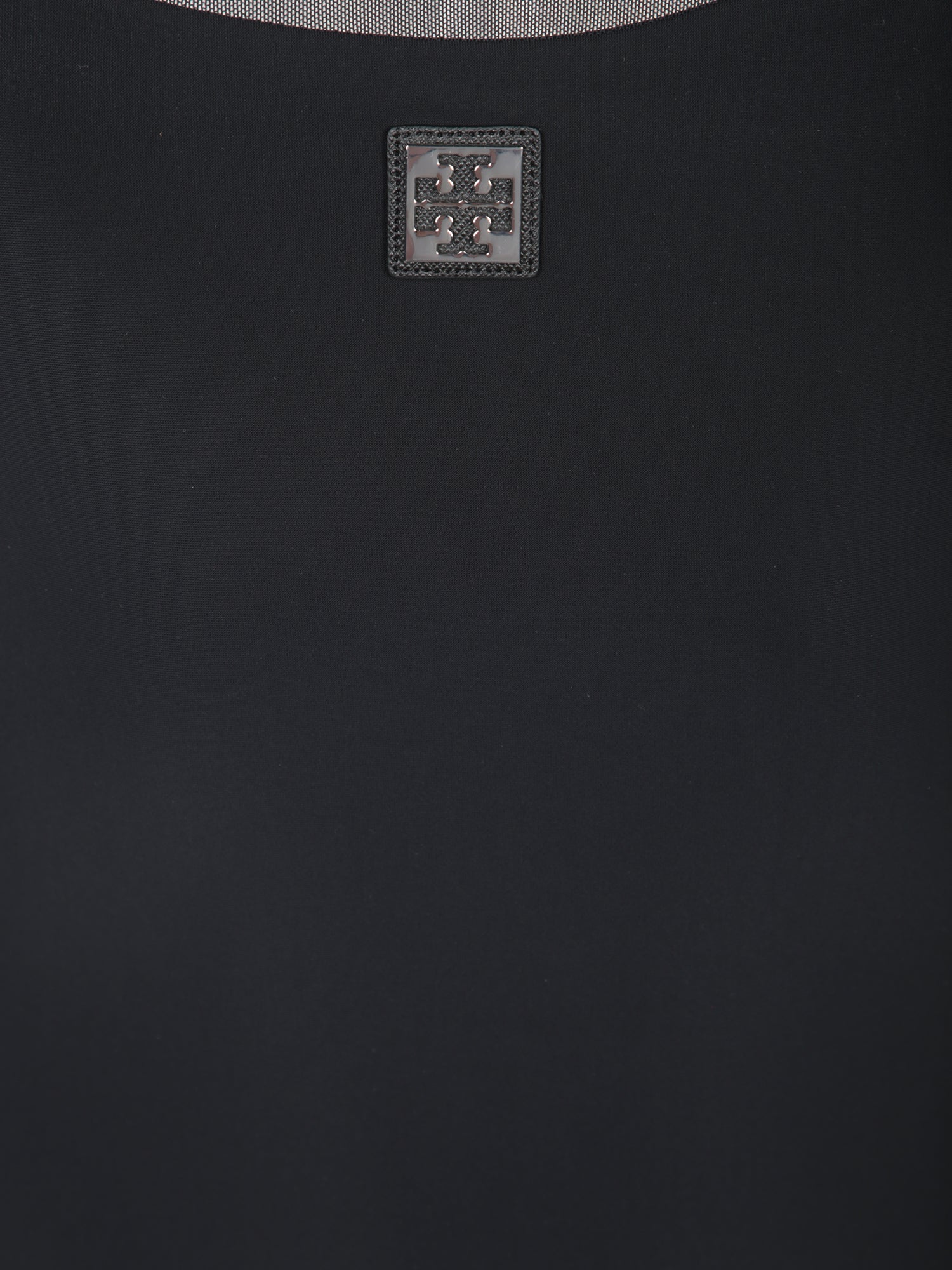 An elegant blend of functionality and style, this Tory Burch swimsuit features translucent mesh inserts, adding a sophisticated touch to the classic black silhouette.